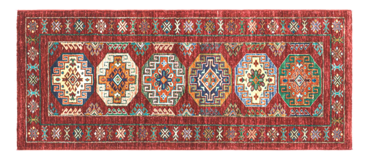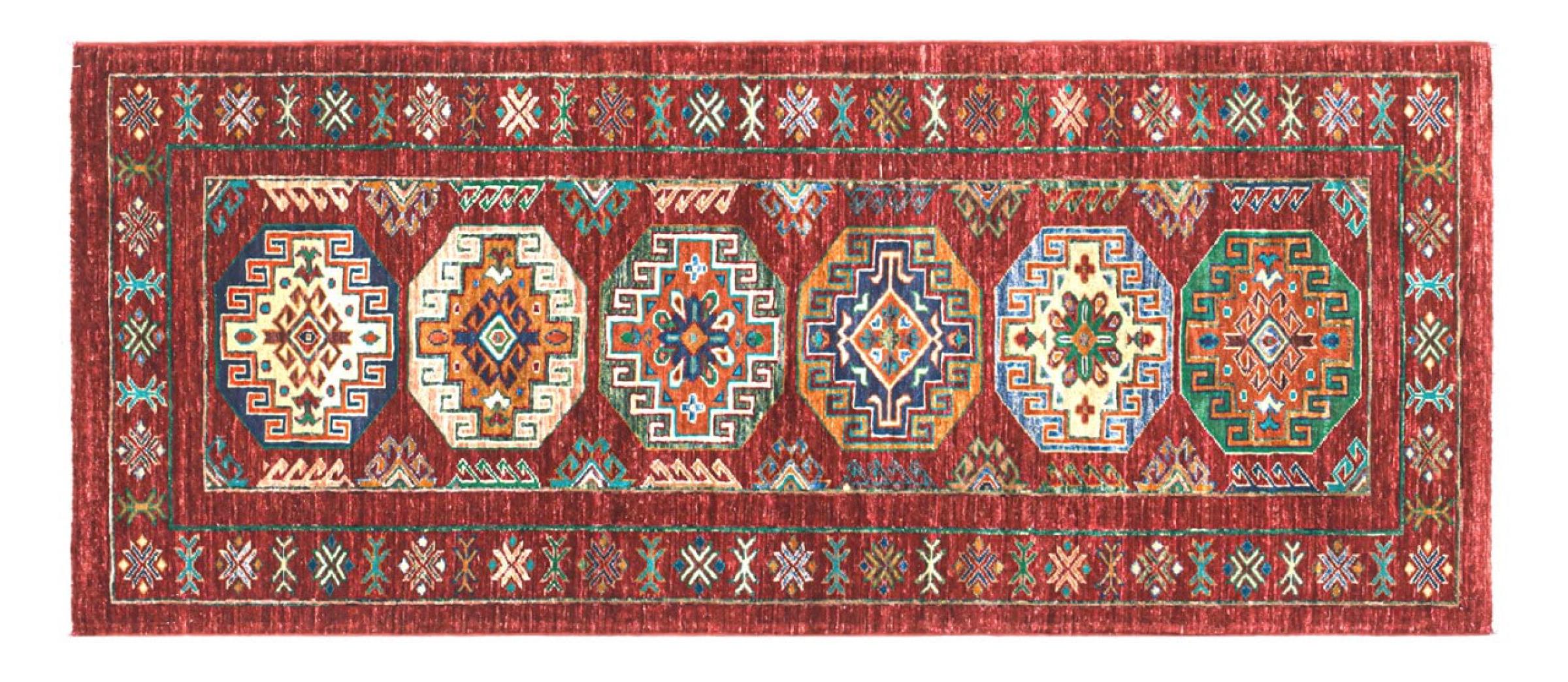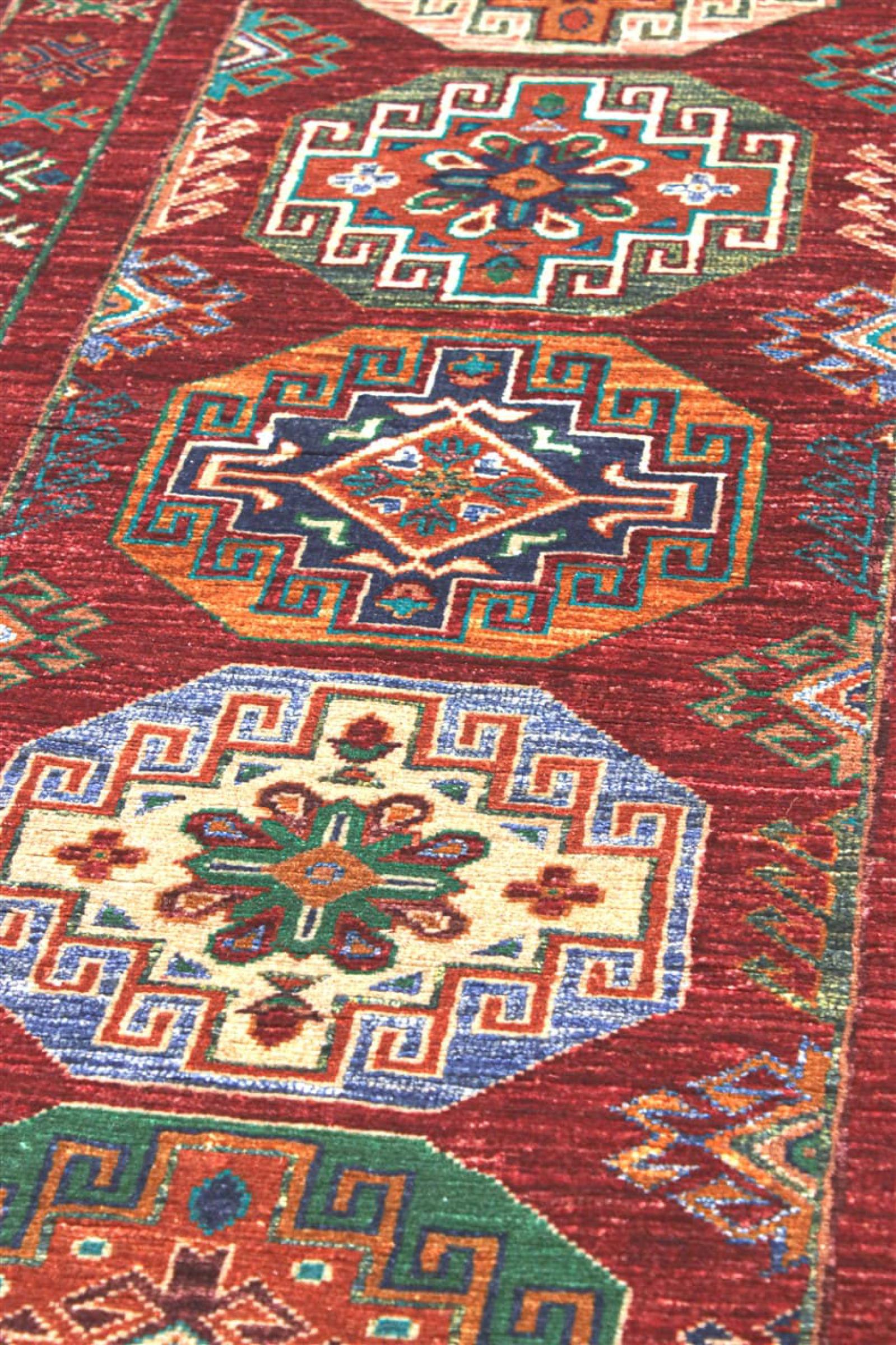 Tapijt ID: 290687008352141 Grootte: 195x76 cm Dikte: ap. 5 mm Knoopdichtheid: 160 000 - 200 000 / m² Verwerking: Handgeknoopte Pool: Hand gesponnen wol Schering: Katoen Oorsprong: Pakistan Leeftijd: Nieuw Gewicht: ap. 5 kg Op voorraad: Uniek - Nog maar 1 op voorraad