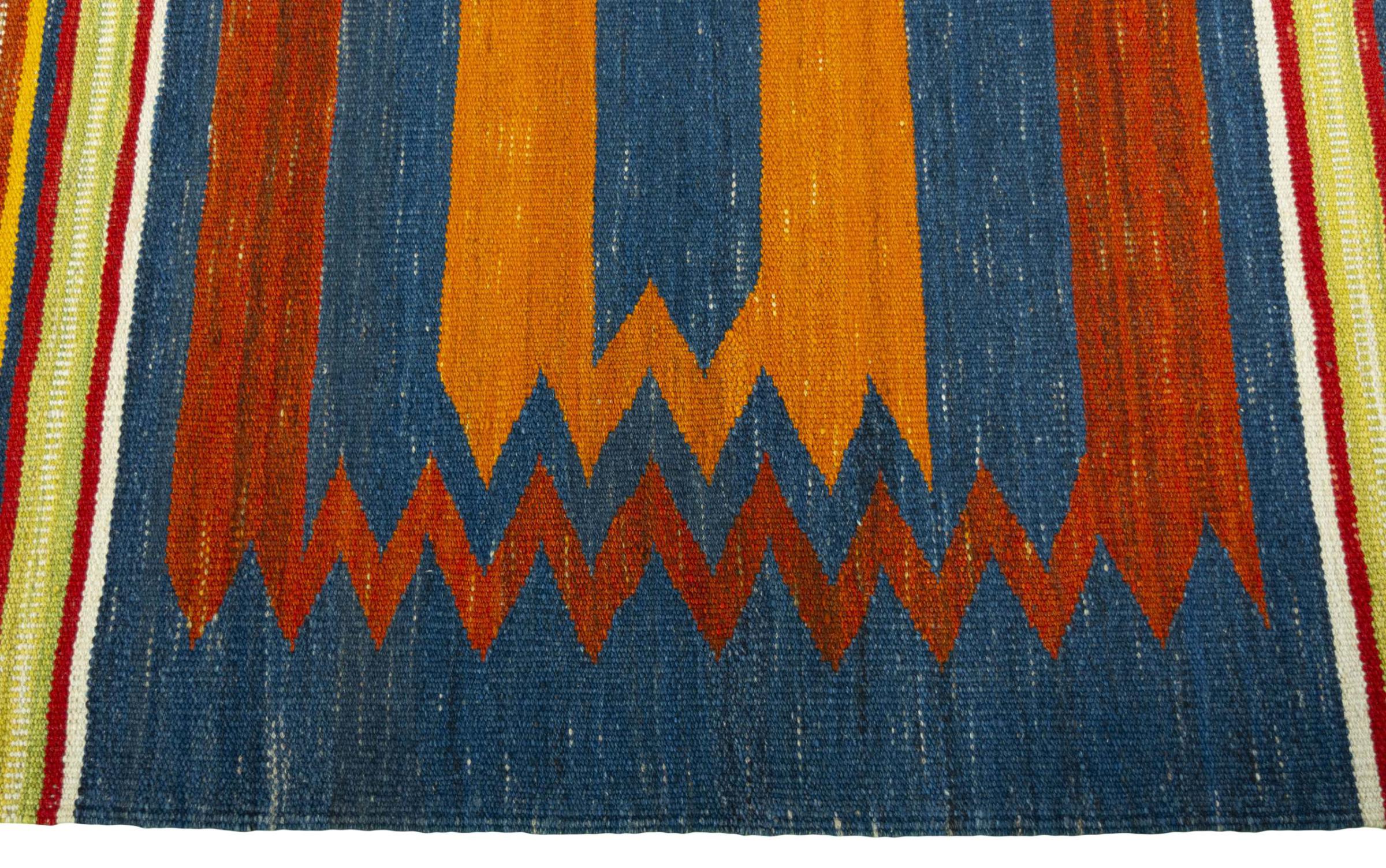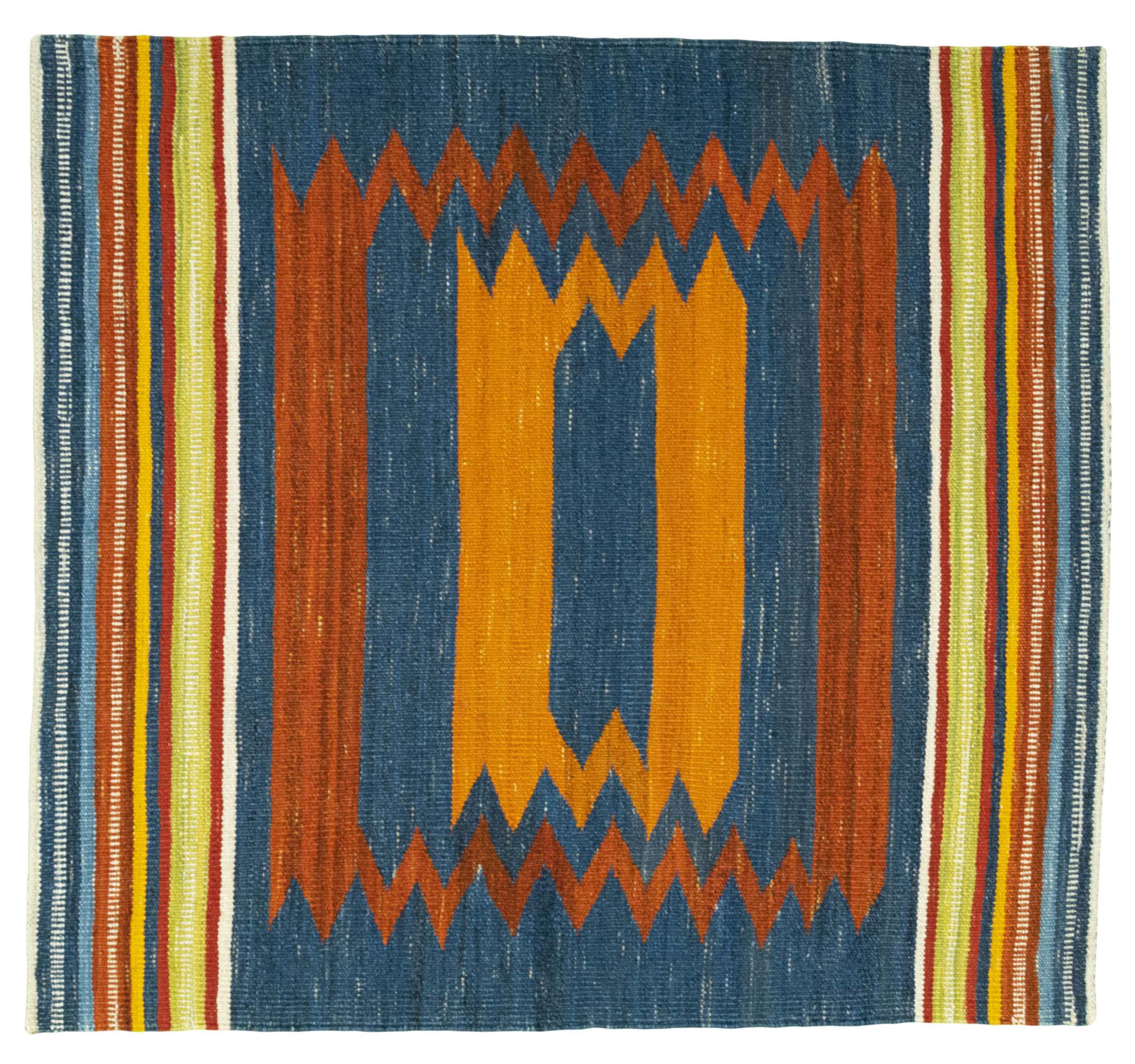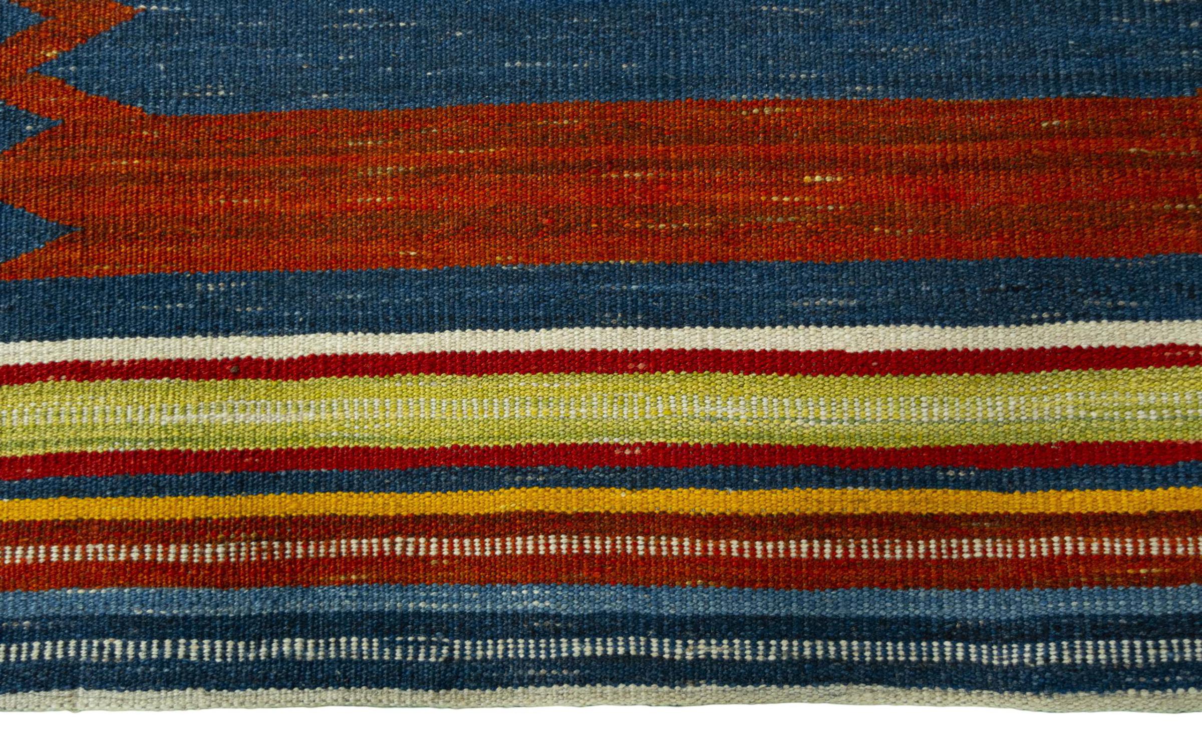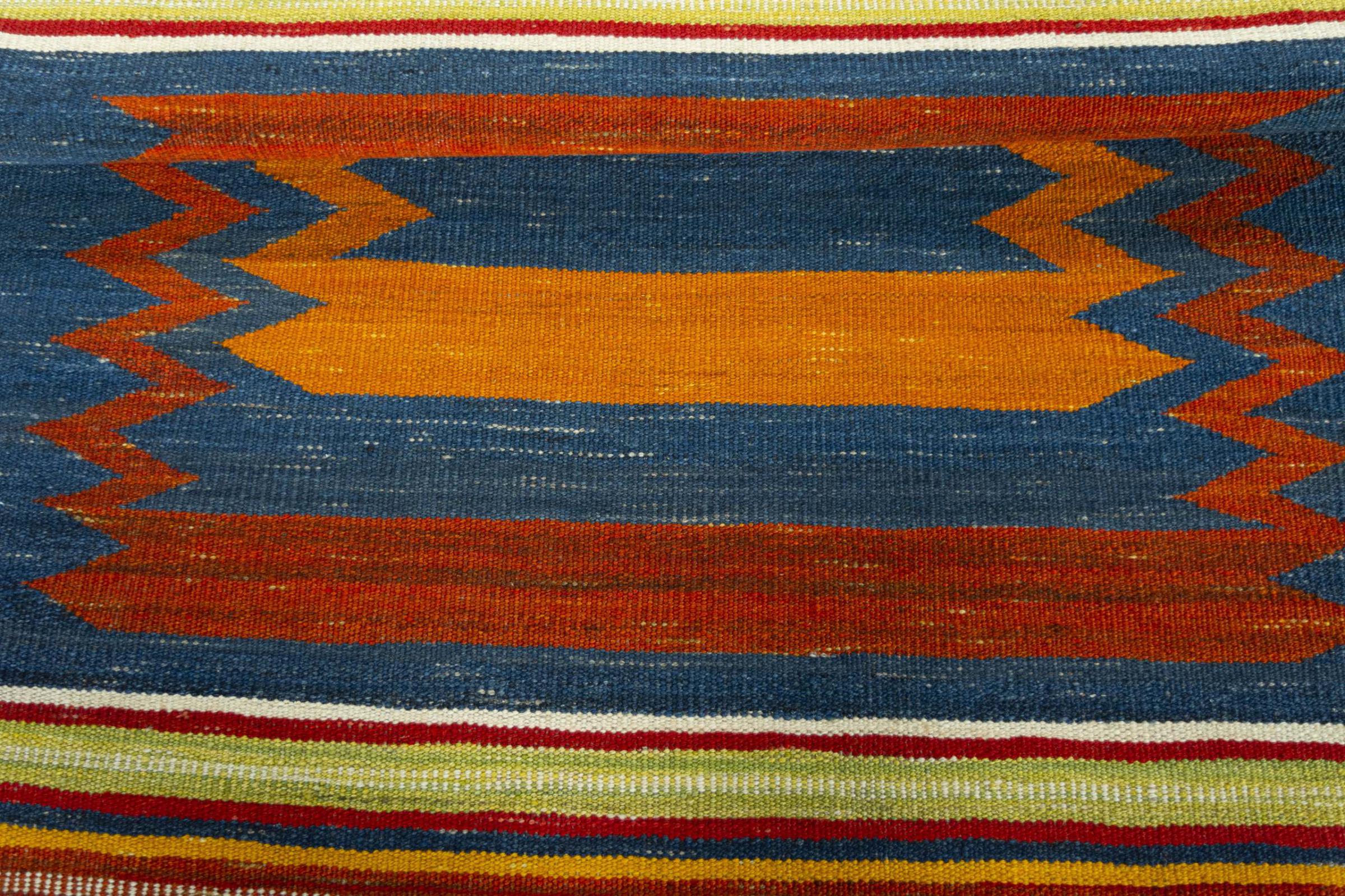 Dit tapijt is met de hand gemaakt op een weefgetouw als plat weefgetouw. Flatweave is de term die wordt gebruikt om tapijten zonder pool te beschrijven. Zoals de naam al belooft, zijn deze tapijten geweven en niet geknoopt. Dit resulteert in een vlak tapijt met een gestructureerd oppervlak. Platweefsels zijn niet zo zacht en meestal dunner dan geknoopte tapijten. Tegelijkertijd zijn ze veel minder complex te vervaardigen en kunnen ze meestal aan beide zijden (voor- en achterkant) worden gelegd. Hun patronen zijn meestal geometrisch, wat wordt bepaald door de stof.