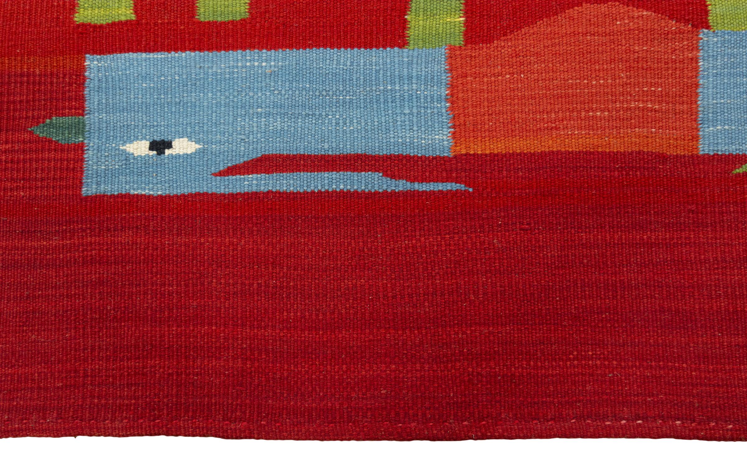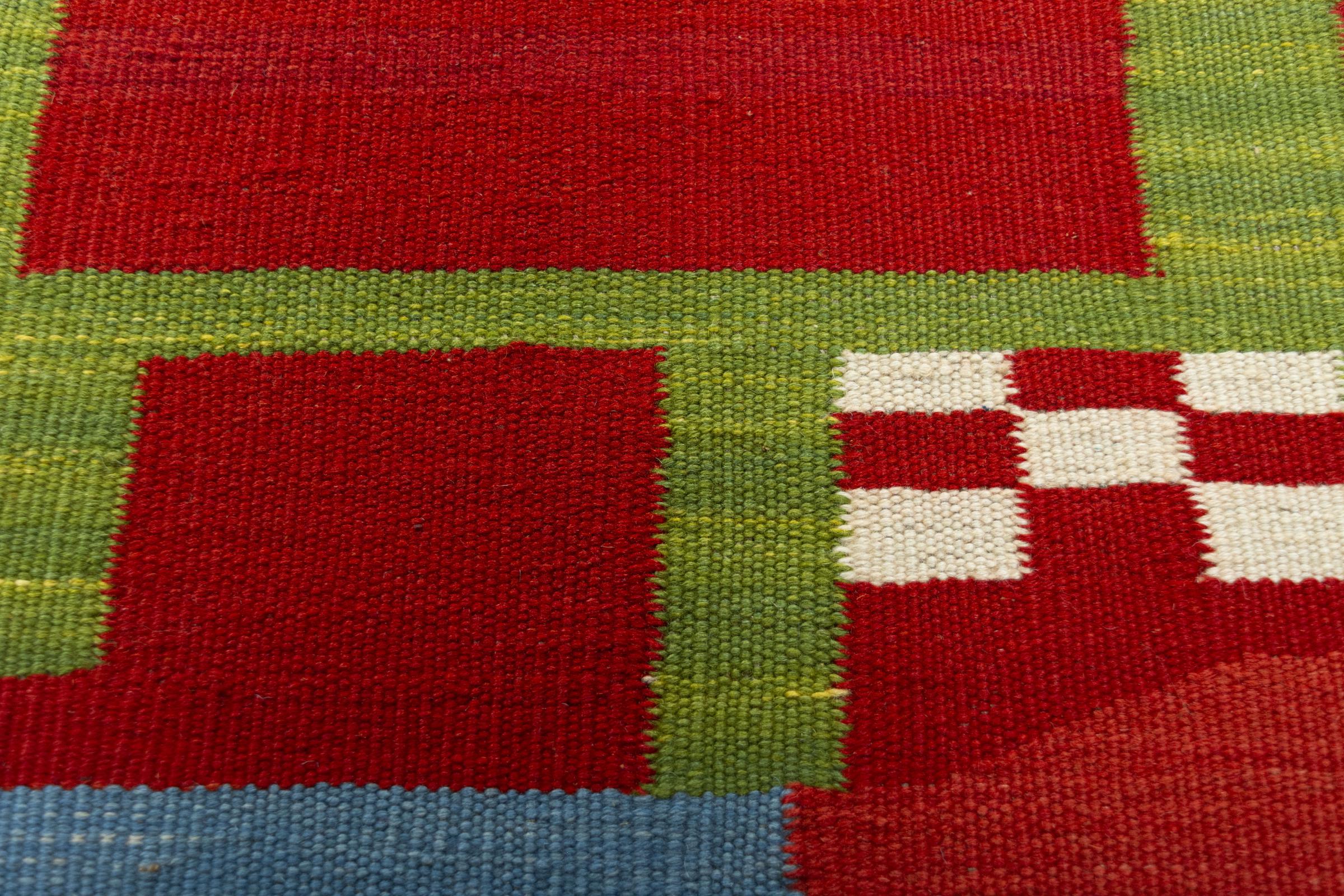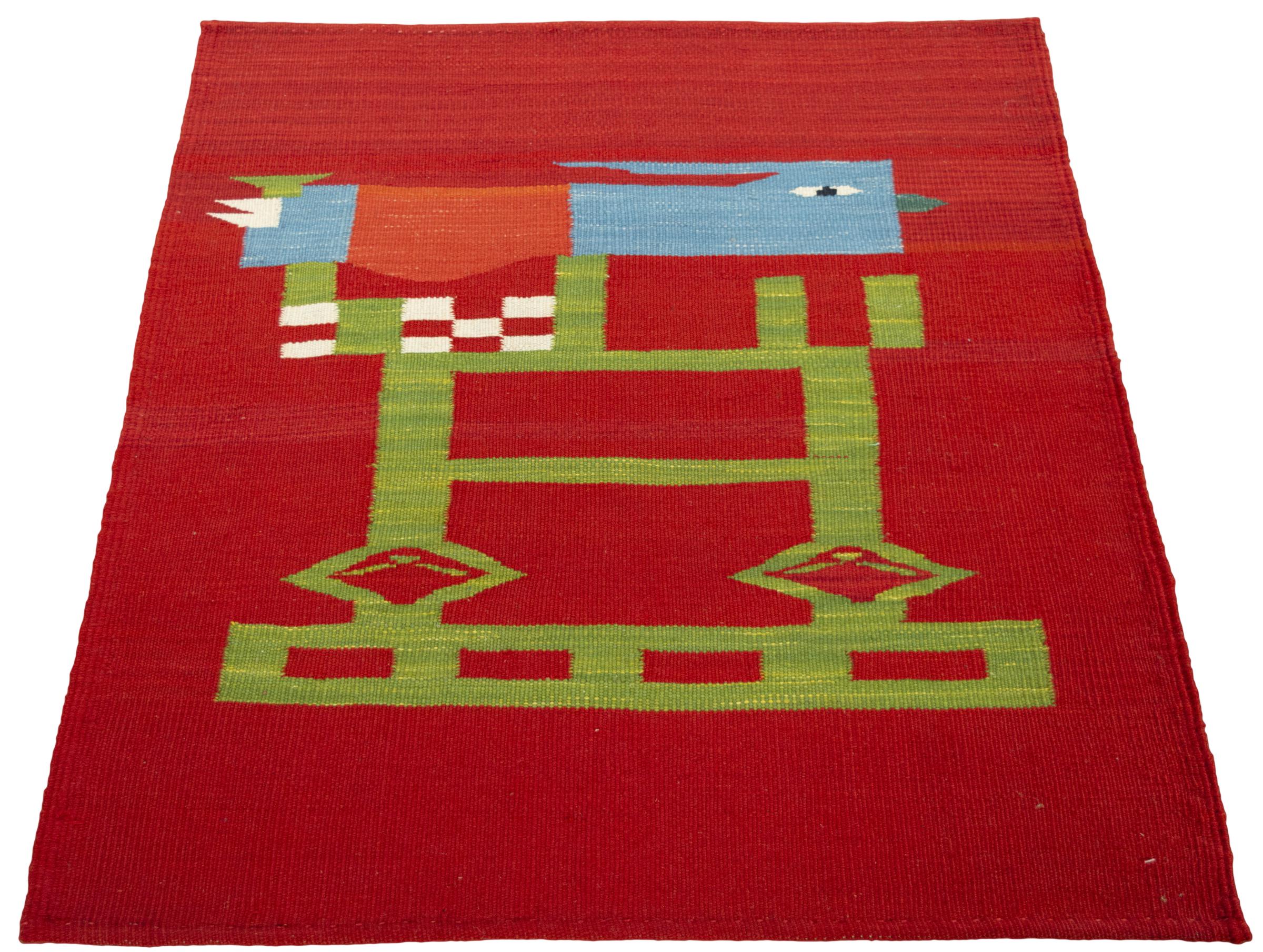 Dit tapijt is met de hand gemaakt op een weefgetouw als plat weefgetouw. Flatweave is de term die wordt gebruikt om tapijten zonder pool te beschrijven. Zoals de naam al belooft, zijn deze tapijten geweven en niet geknoopt. Dit resulteert in een vlak tapijt met een gestructureerd oppervlak. Platweefsels zijn niet zo zacht en meestal dunner dan geknoopte tapijten. Tegelijkertijd zijn ze veel minder complex te vervaardigen en kunnen ze meestal aan beide zijden (voor- en achterkant) worden gelegd. Hun patronen zijn meestal geometrisch, wat wordt bepaald door de stof.