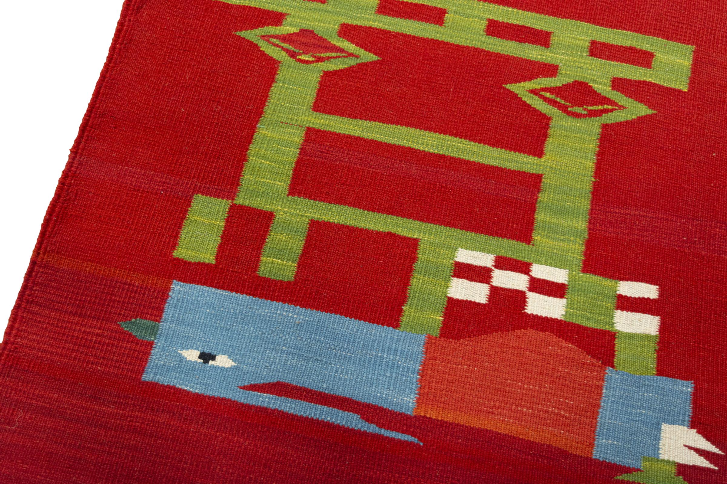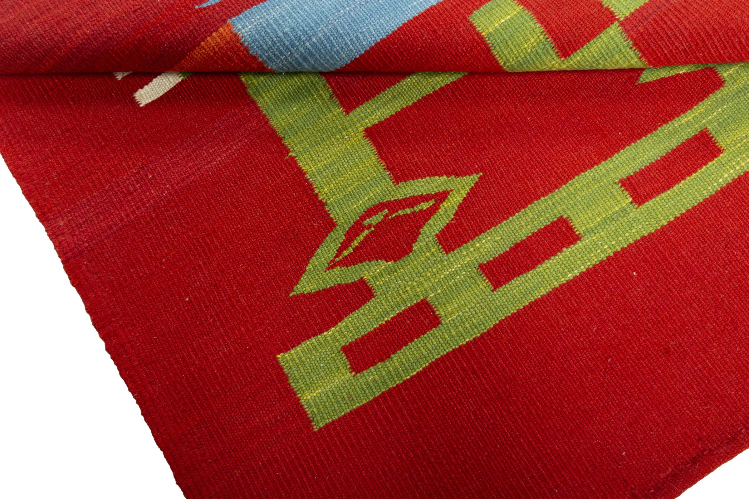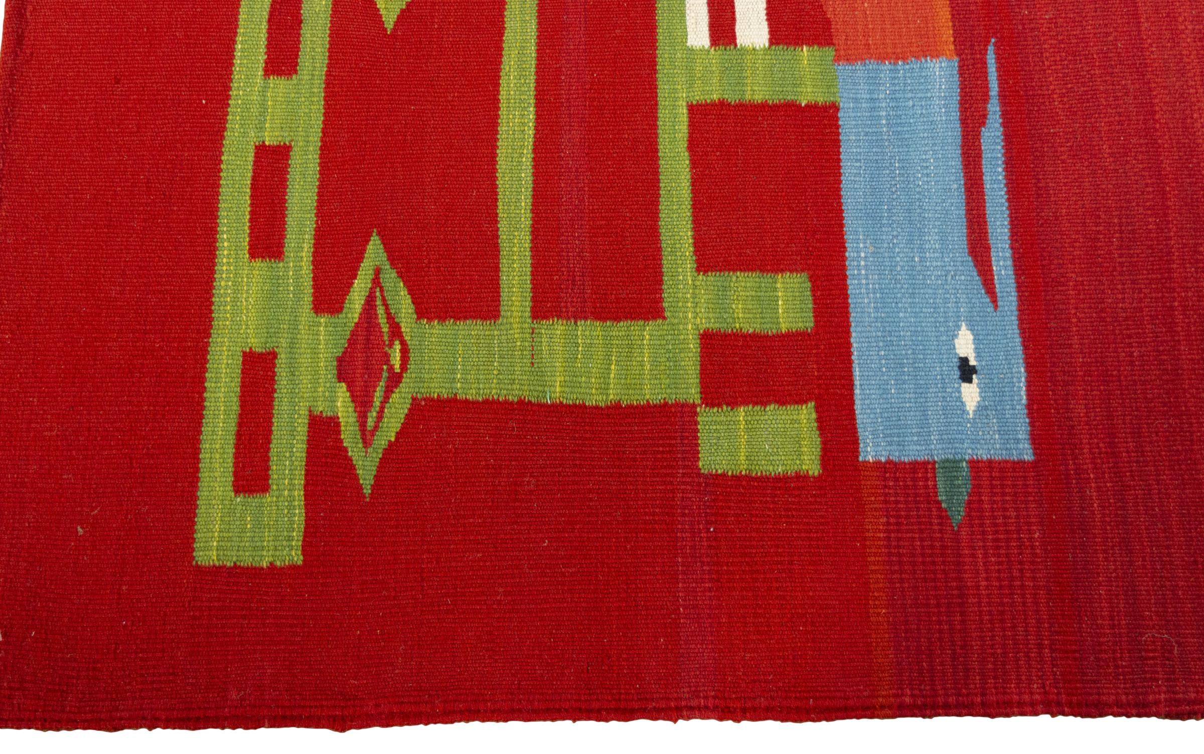 Dit tapijt is met de hand gemaakt op een weefgetouw als plat weefgetouw. Flatweave is de term die wordt gebruikt om tapijten zonder pool te beschrijven. Zoals de naam al belooft, zijn deze tapijten geweven en niet geknoopt. Dit resulteert in een vlak tapijt met een gestructureerd oppervlak. Platweefsels zijn niet zo zacht en meestal dunner dan geknoopte tapijten. Tegelijkertijd zijn ze veel minder complex te vervaardigen en kunnen ze meestal aan beide zijden (voor- en achterkant) worden gelegd. Hun patronen zijn meestal geometrisch, wat wordt bepaald door de stof.