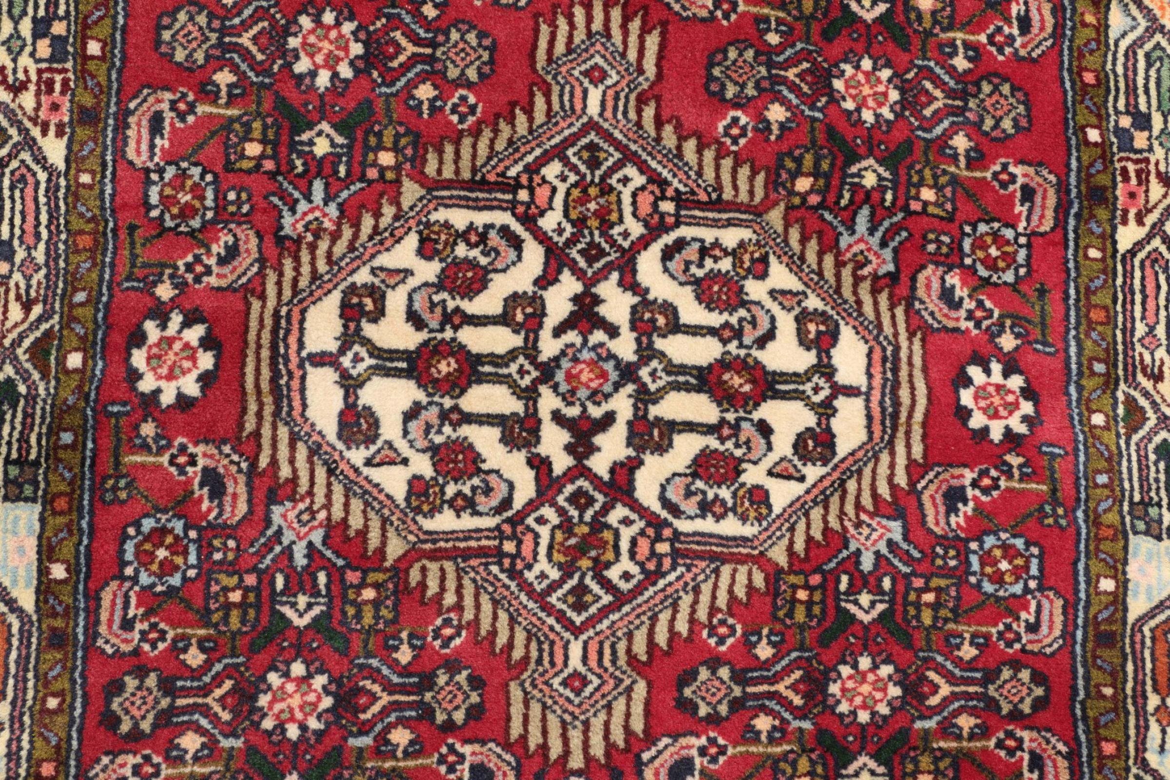 Tapijt ID: 309547002214383 Grootte: 123x81 cm Dikte: ap. 8 mm Knoopdichtheid: 128 000 - 160 000 / m² Verwerking: Handgeknoopte Pool: Hand gesponnen wol Schering: Katoen Oorsprong: Perzië / Iran Leeftijd: Nieuw Gewicht: ap. 3 kg Ook wel bekend als Huseinabad Op voorraad: Uniek - Nog maar 1 op voorraad