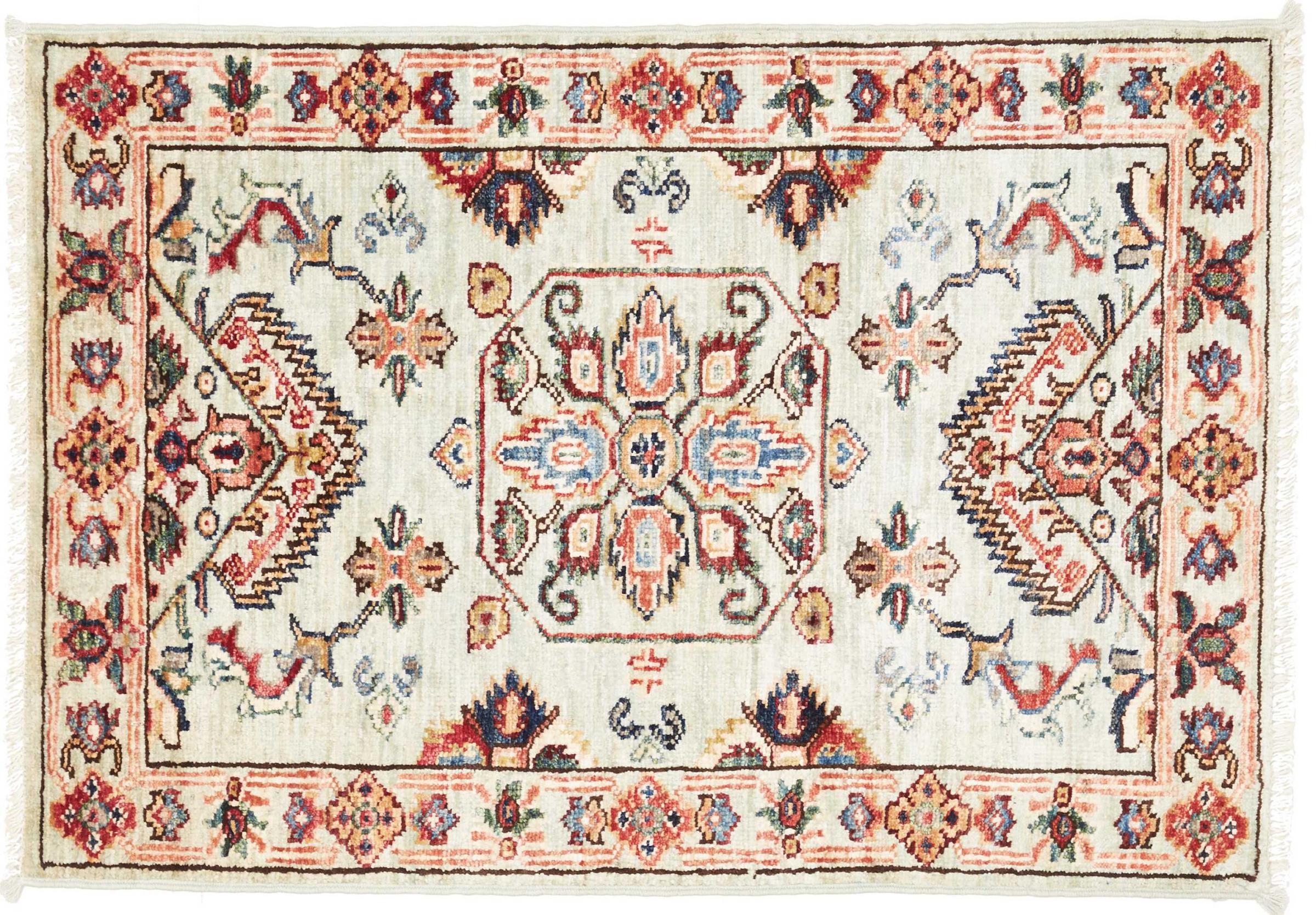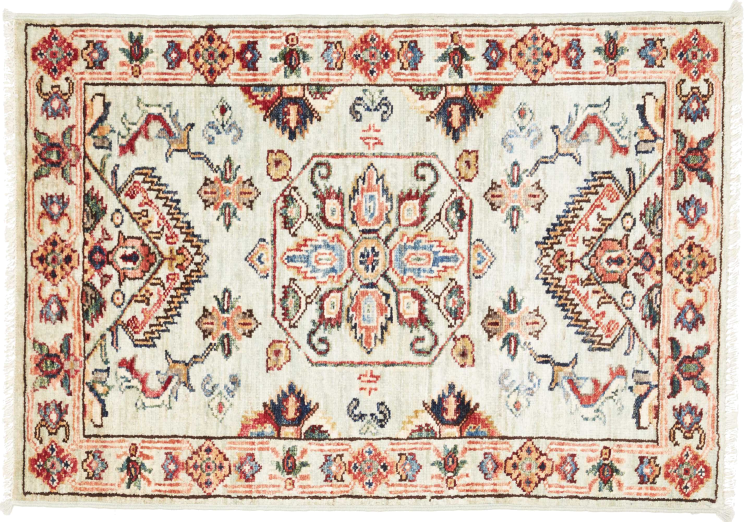 Tapijt ID: 306458007724103 Grootte: 91x62 cm Dikte: ap. 5 mm Knoopdichtheid: 128 000 - 160 000 / m² Verwerking: Handgeknoopte Pool: Hand gesponnen wol Schering: Katoen Oorsprong: Pakistan Leeftijd: Nieuw Gewicht: ap. 1 kg Op voorraad: Uniek - Nog maar 1 op voorraad