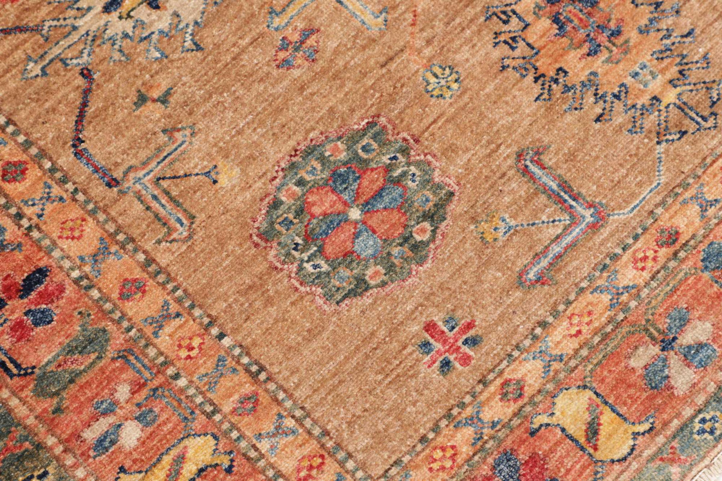 Dit tapijt is gemaakt van handgesponnen schapenwol van de hoogste kwaliteit. Vooral in Iran (voormalig Perzië), Afghanistan en Pakistan wordt de wol nog met de hand gesponnen voordat het eigenlijke knopen van het tapijt begint. Wol heeft zich door de eeuwen heen bewezen als een natuurlijk en extreem slijtvast materiaal. Het heeft onder andere vuilafstotende en warmte-isolerende eigenschappen. Tegelijkertijd is wol onvergelijkbaar zacht en heeft het een natuurlijke glans.