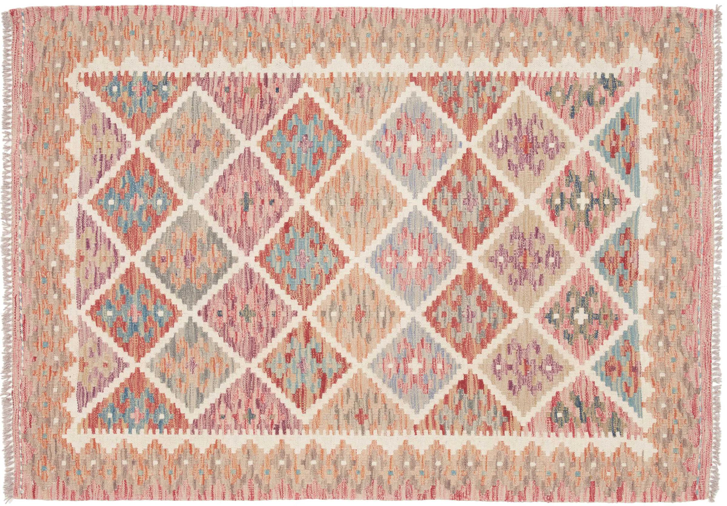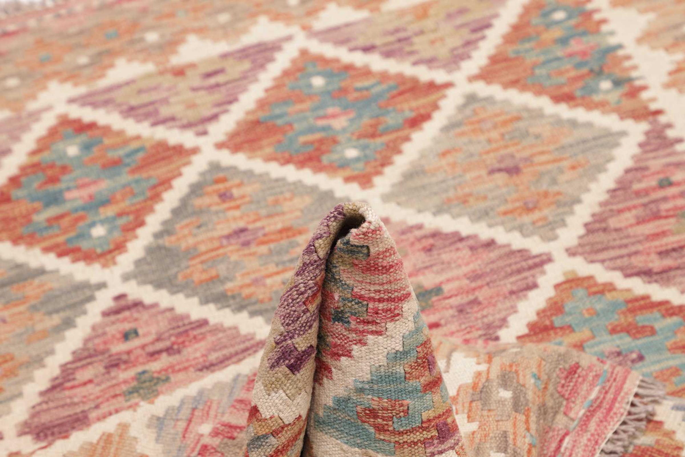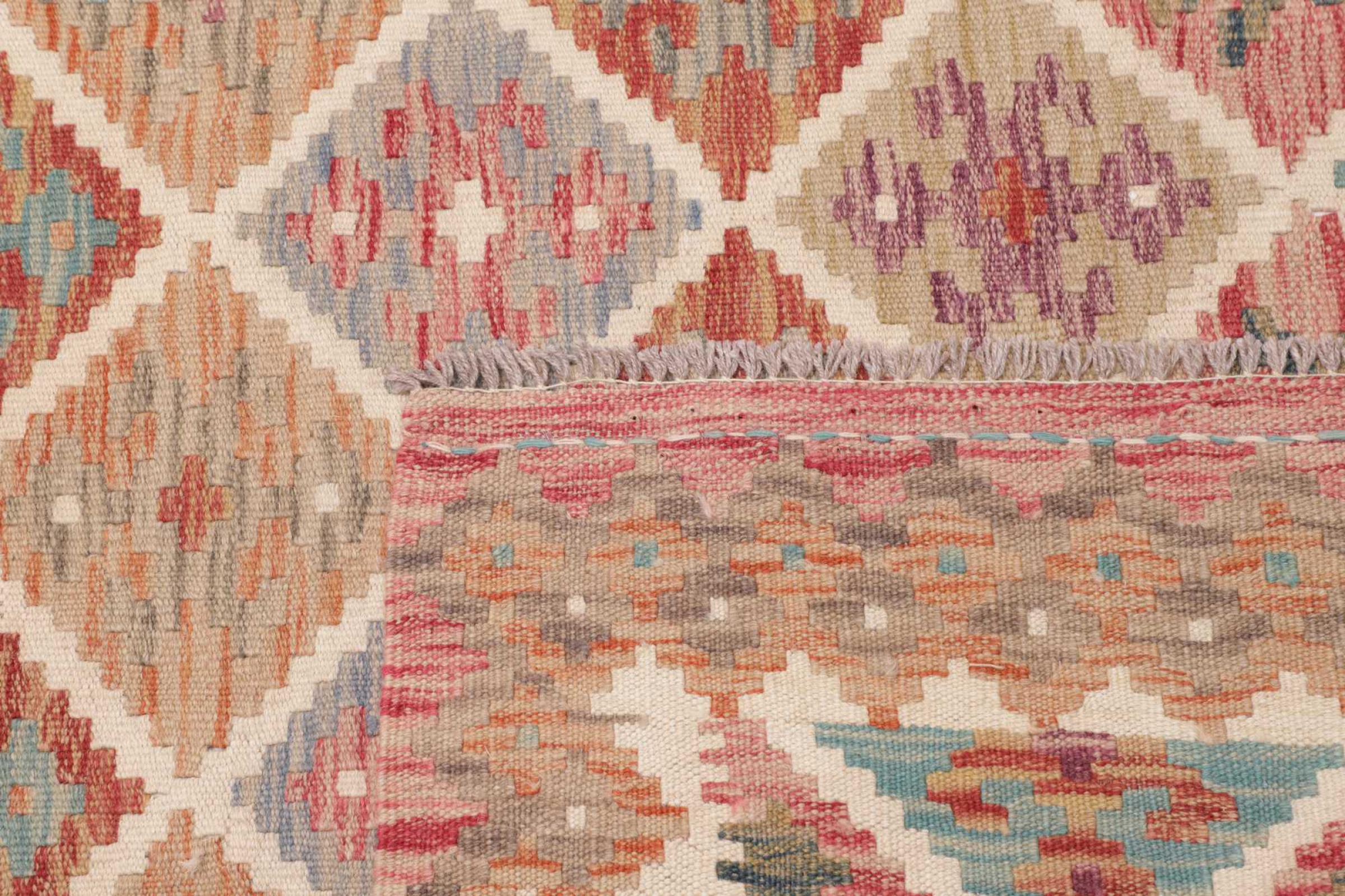 Deze handgeweven kilim Afghan is prachtig door de veelzijdige kleuren en het typische patroon. Het is handgeweven in Afghanistan van 100% schapenwol. Het is ongetwijfeld robuuster en duurzamer dan machinaal vervaardigde tapijten. Daarnaast heeft deze kelim een ​​heel eigen karakter. Een uniek stuk voor jou en je huis dat je nooit meer zult vinden.