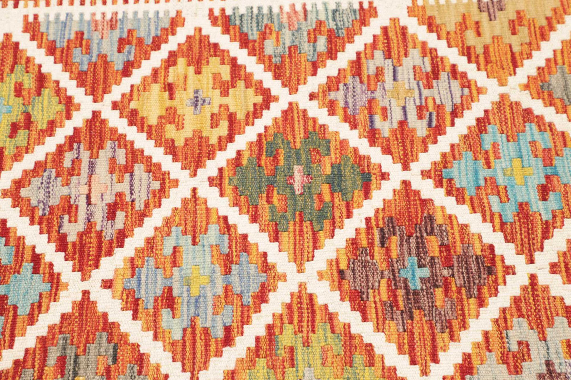 Deze handgeweven kilim Afghan is prachtig door de veelzijdige kleuren en het typische patroon. Het is handgeweven in Afghanistan van 100% schapenwol. Het is ongetwijfeld robuuster en duurzamer dan machinaal vervaardigde tapijten. Daarnaast heeft deze kelim een ​​heel eigen karakter. Een uniek stuk voor jou en je huis dat je nooit meer zult vinden.