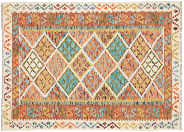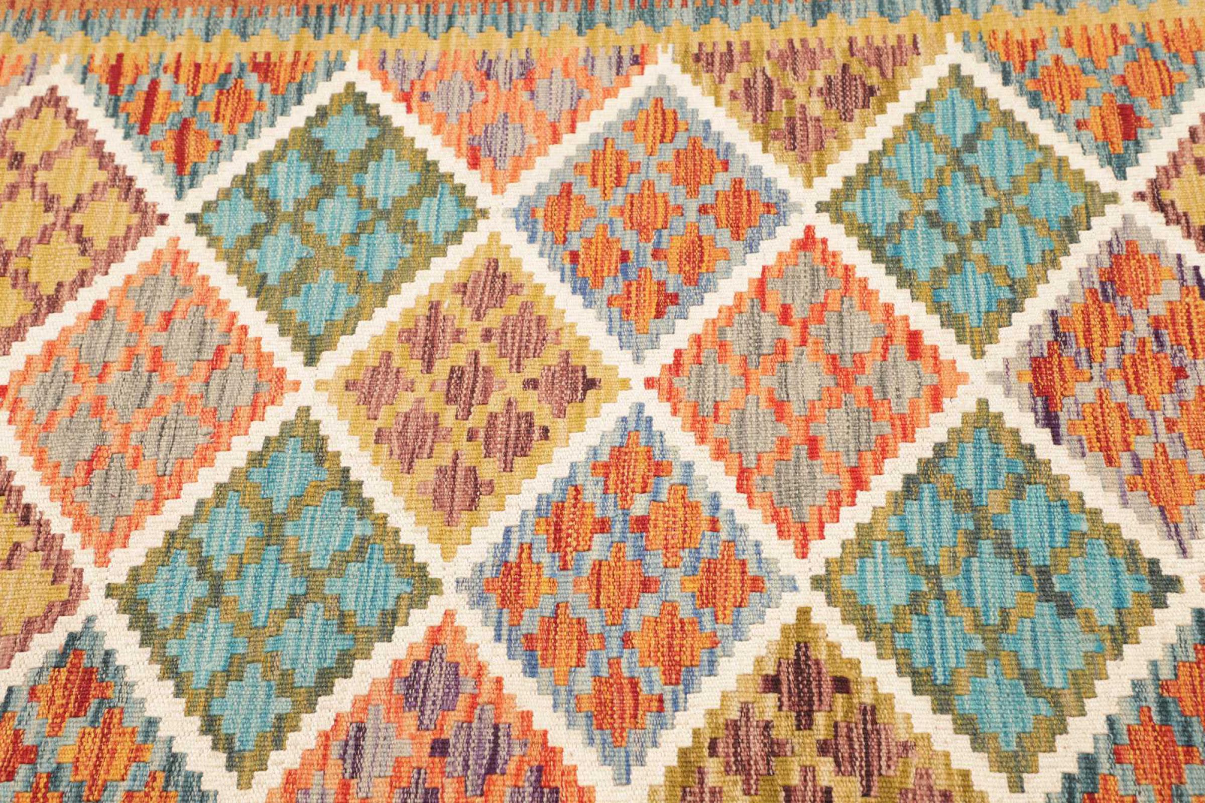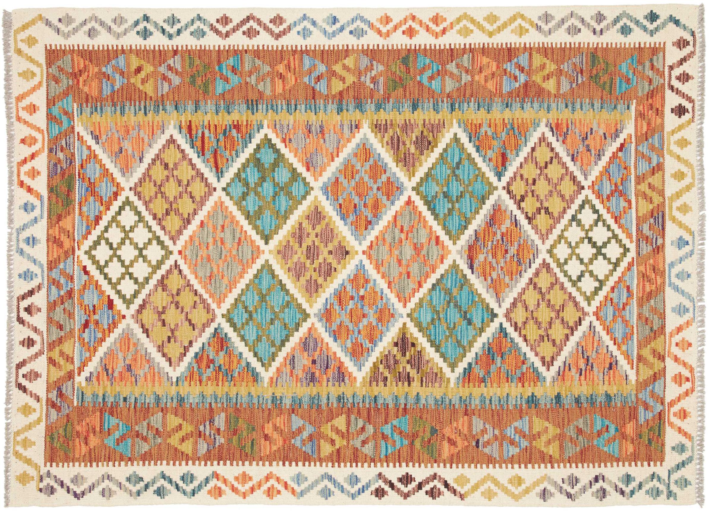 Deze handgeweven kilim Afghan is prachtig door de veelzijdige kleuren en het typische patroon. Het is handgeweven in Afghanistan van 100% schapenwol. Het is ongetwijfeld robuuster en duurzamer dan machinaal vervaardigde tapijten. Daarnaast heeft deze kelim een ​​heel eigen karakter. Een uniek stuk voor jou en je huis dat je nooit meer zult vinden.