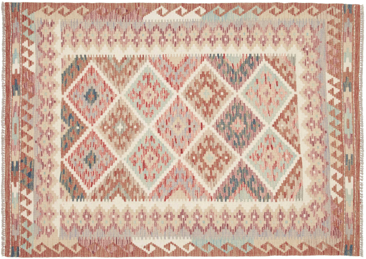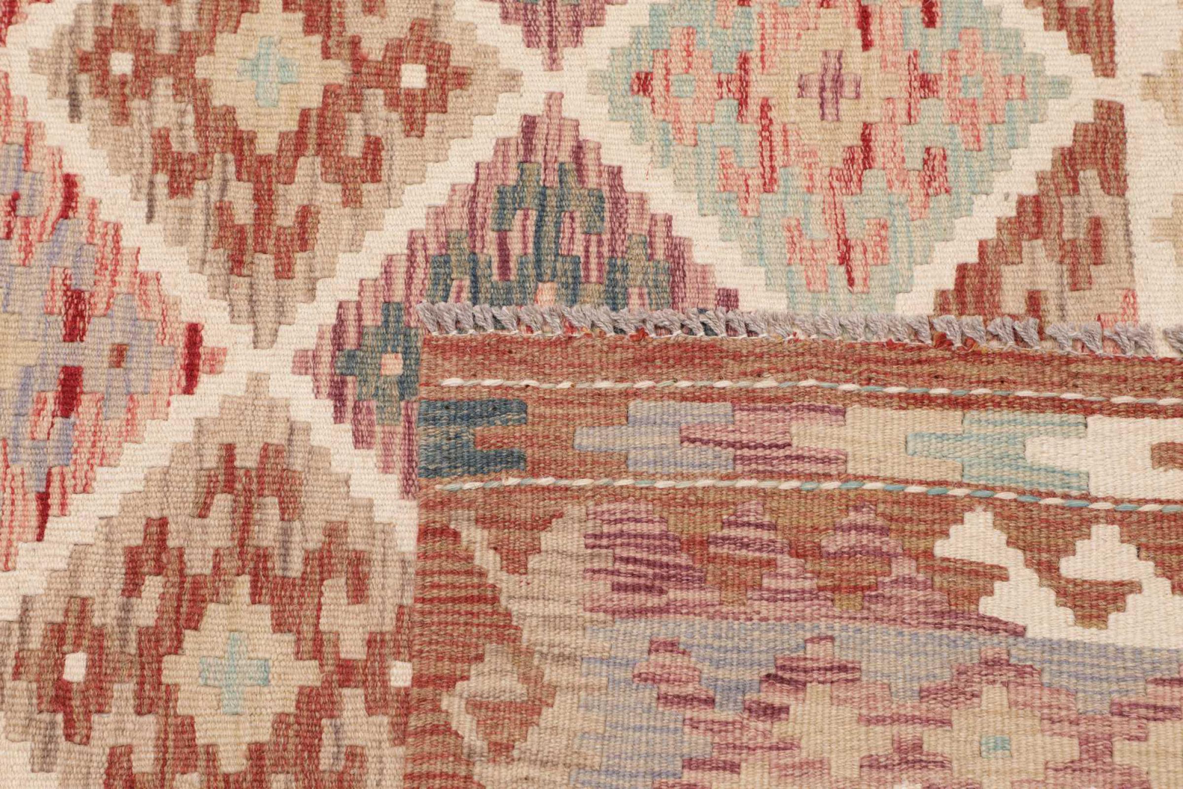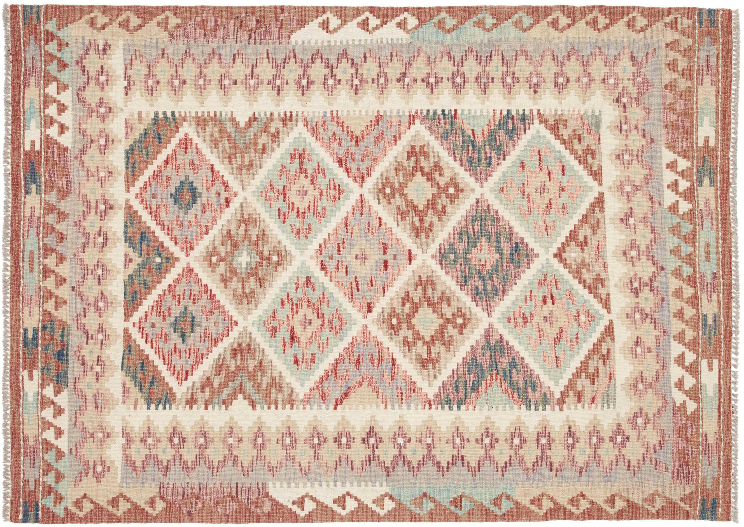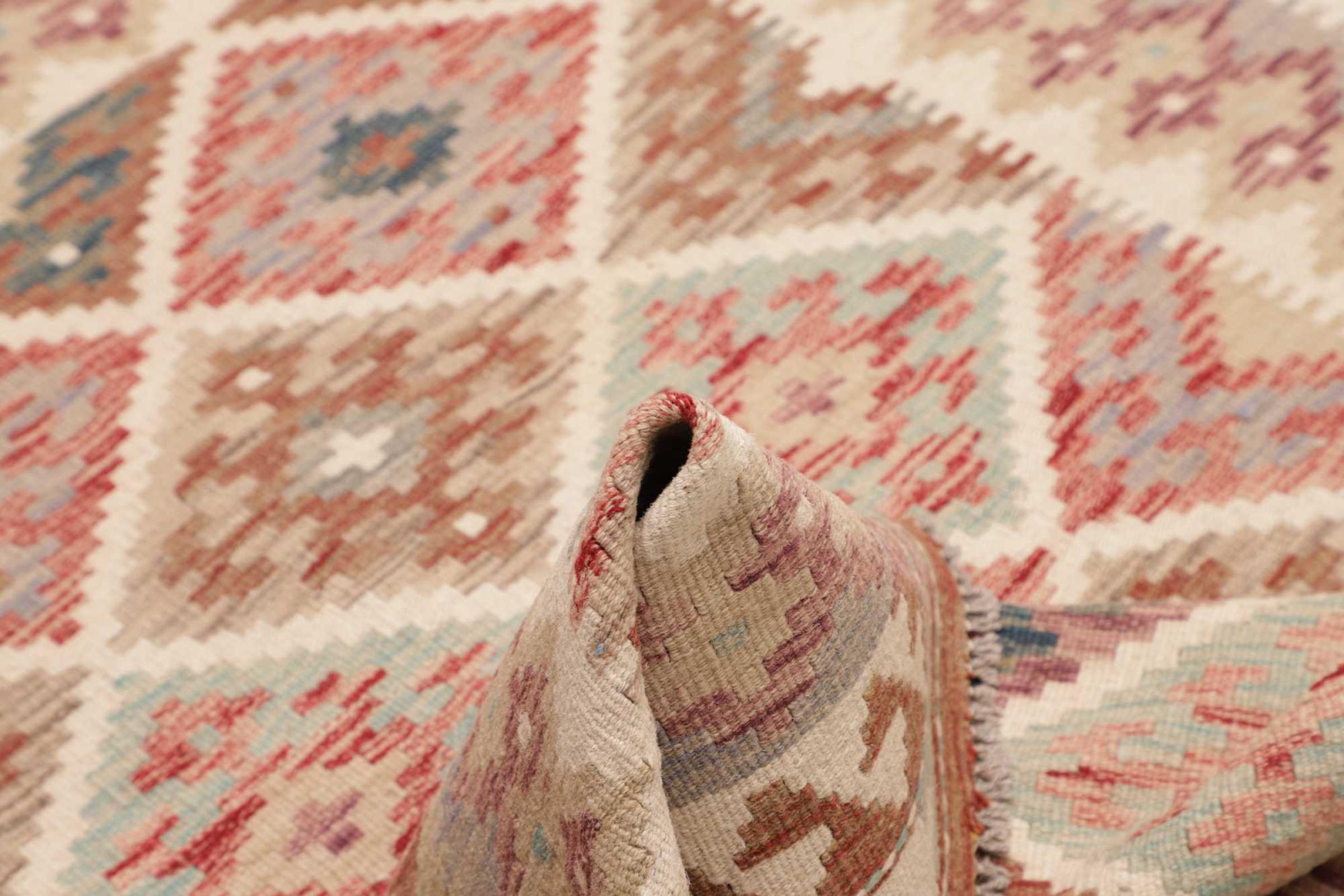 Deze handgeweven kilim Afghan is prachtig door de veelzijdige kleuren en het typische patroon. Het is handgeweven in Afghanistan van 100% schapenwol. Het is ongetwijfeld robuuster en duurzamer dan machinaal vervaardigde tapijten. Daarnaast heeft deze kelim een ​​heel eigen karakter. Een uniek stuk voor jou en je huis dat je nooit meer zult vinden.