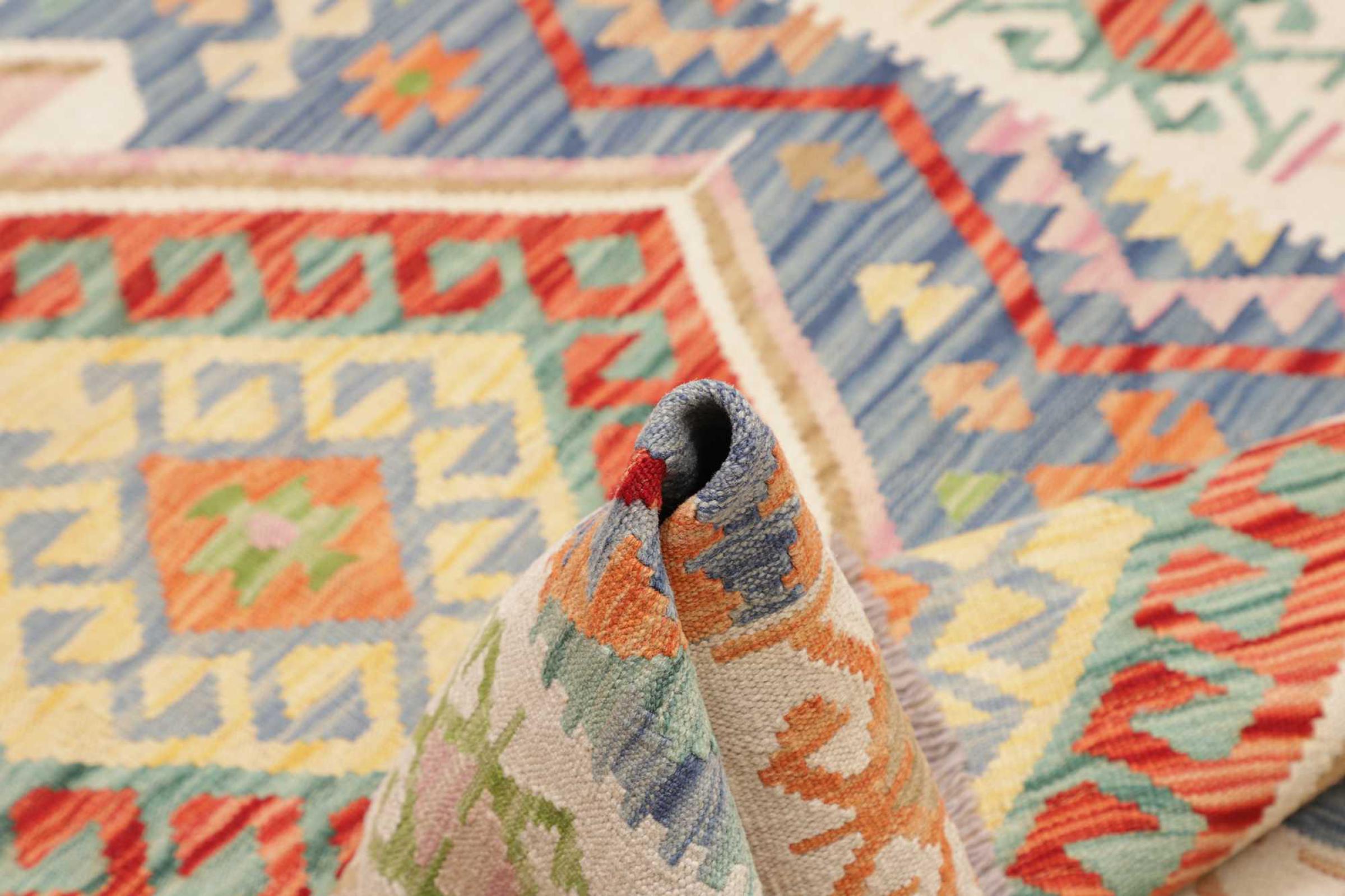 Deze handgeweven kilim Afghan is prachtig door de veelzijdige kleuren en het typische patroon. Het is handgeweven in Afghanistan van 100% schapenwol. Het is ongetwijfeld robuuster en duurzamer dan machinaal vervaardigde tapijten. Daarnaast heeft deze kelim een ​​heel eigen karakter. Een uniek stuk voor jou en je huis dat je nooit meer zult vinden.