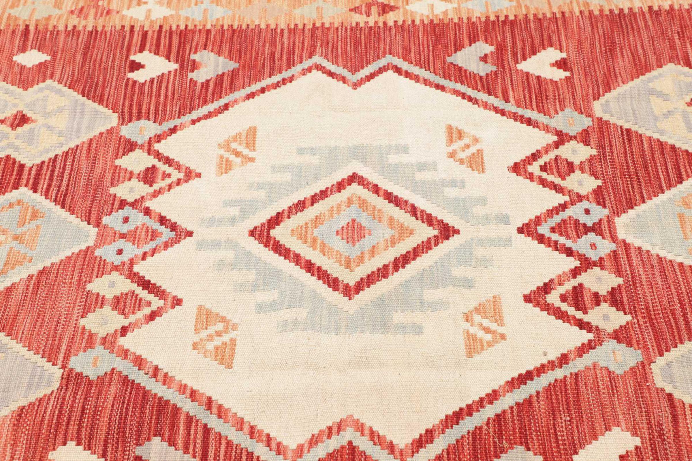 Deze handgeweven kilim Afghan is prachtig door de veelzijdige kleuren en het typische patroon. Het is handgeweven in Afghanistan van 100% schapenwol. Het is ongetwijfeld robuuster en duurzamer dan machinaal vervaardigde tapijten. Daarnaast heeft deze kelim een ​​heel eigen karakter. Een uniek stuk voor jou en je huis dat je nooit meer zult vinden.