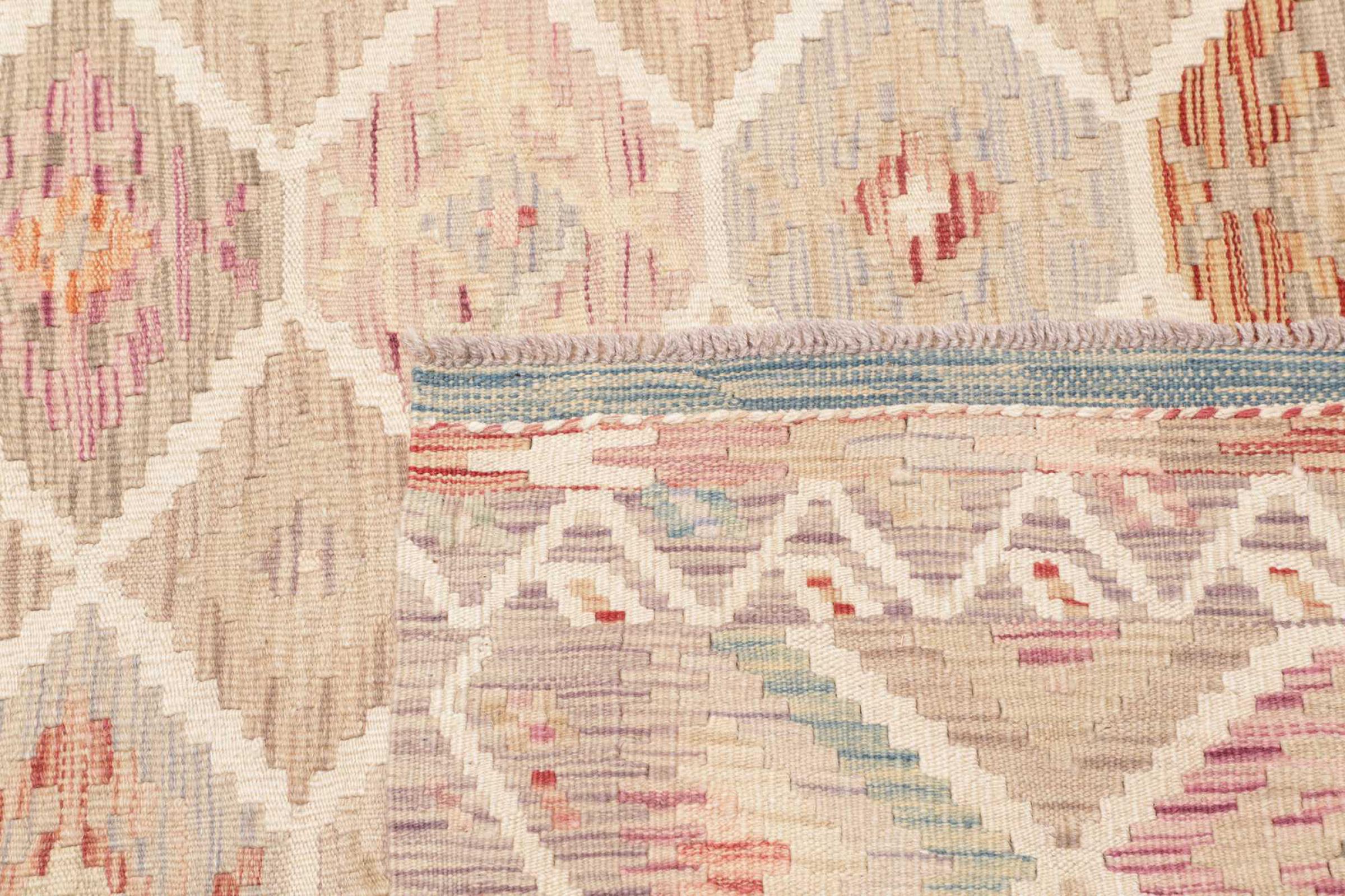 Deze handgeweven kilim Afghan is prachtig door de veelzijdige kleuren en het typische patroon. Het is handgeweven in Afghanistan van 100% schapenwol. Het is ongetwijfeld robuuster en duurzamer dan machinaal vervaardigde tapijten. Daarnaast heeft deze kelim een ​​heel eigen karakter. Een uniek stuk voor jou en je huis dat je nooit meer zult vinden.