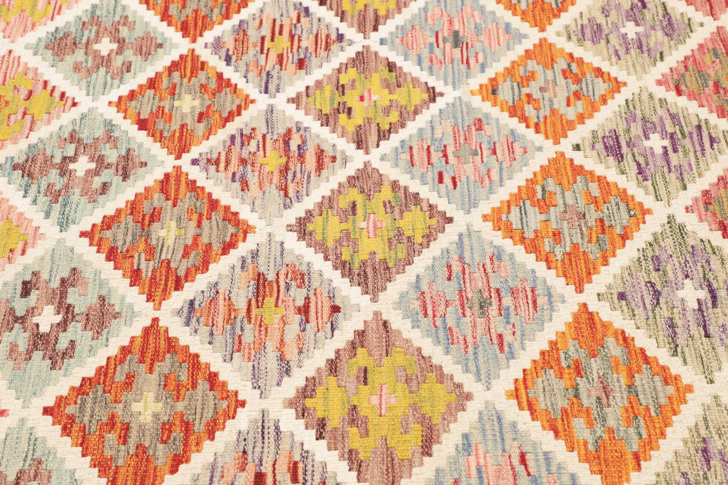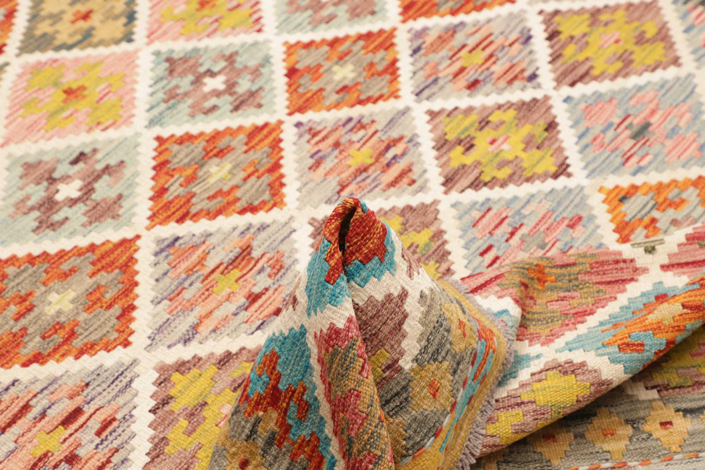 Deze handgeweven kilim Afghan is prachtig door de veelzijdige kleuren en het typische patroon. Het is handgeweven in Afghanistan van 100% schapenwol. Het is ongetwijfeld robuuster en duurzamer dan machinaal vervaardigde tapijten. Daarnaast heeft deze kelim een ​​heel eigen karakter. Een uniek stuk voor jou en je huis dat je nooit meer zult vinden.