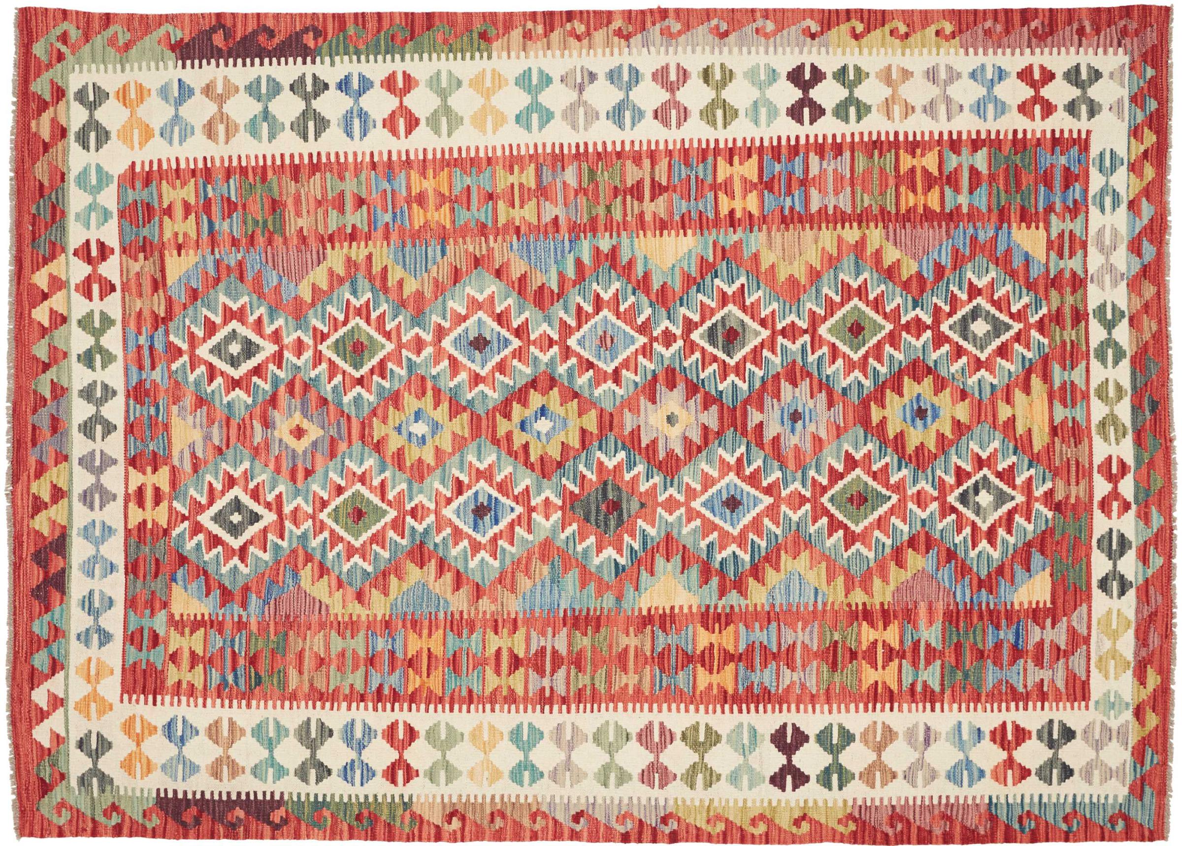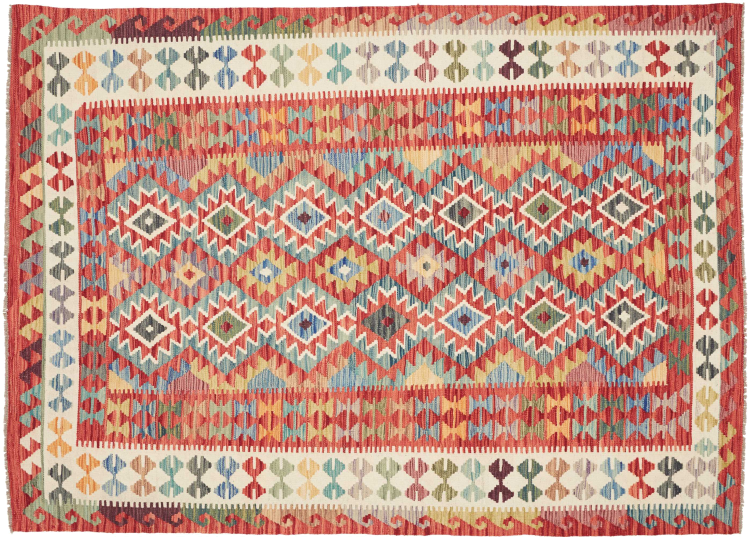 Deze handgeweven kilim Afghan is prachtig door de veelzijdige kleuren en het typische patroon. Het is handgeweven in Afghanistan van 100% schapenwol. Het is ongetwijfeld robuuster en duurzamer dan machinaal vervaardigde tapijten. Daarnaast heeft deze kelim een ​​heel eigen karakter. Een uniek stuk voor jou en je huis dat je nooit meer zult vinden.