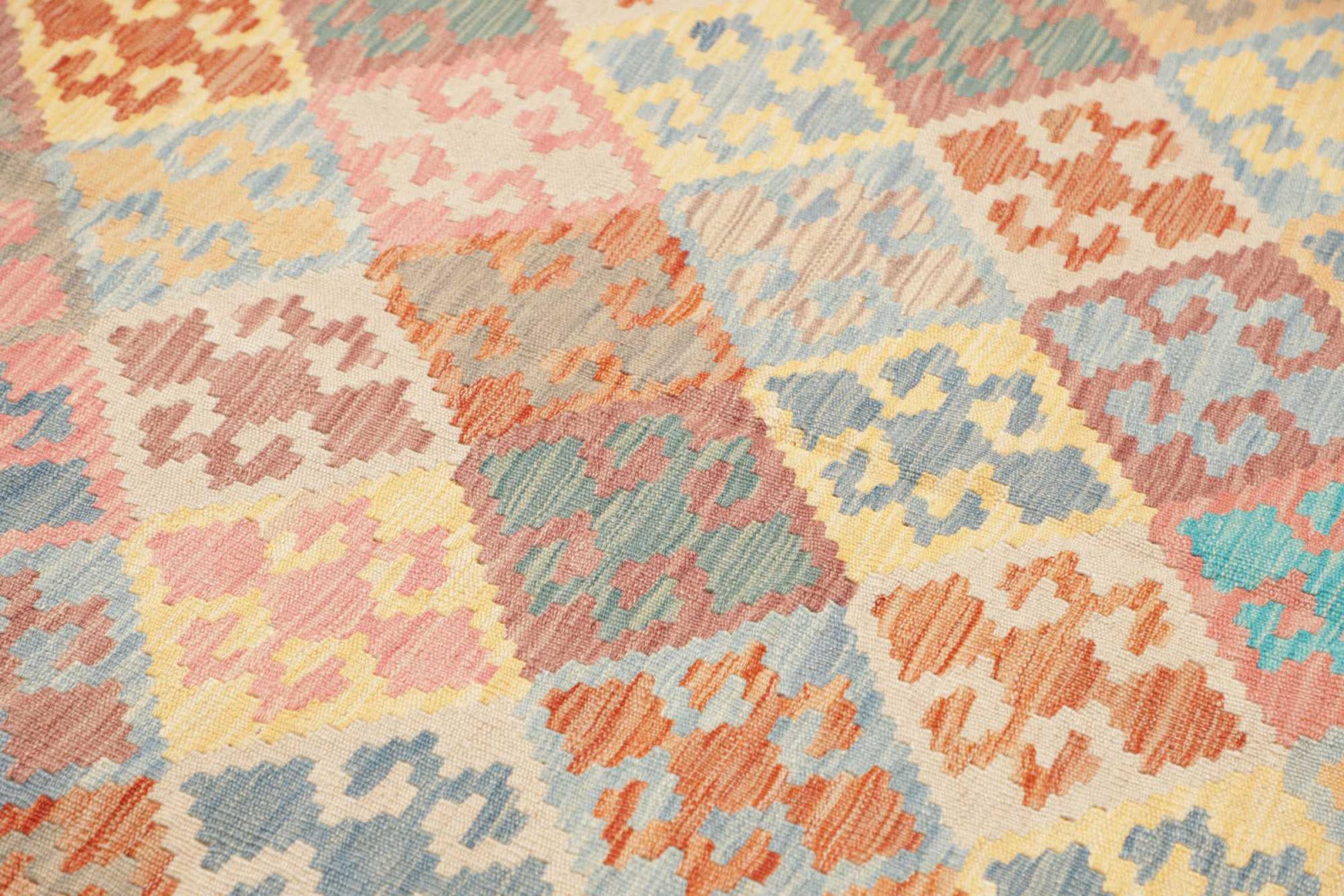 Deze handgeweven kilim Afghan is prachtig door de veelzijdige kleuren en het typische patroon. Het is handgeweven in Afghanistan van 100% schapenwol. Het is ongetwijfeld robuuster en duurzamer dan machinaal vervaardigde tapijten. Daarnaast heeft deze kelim een ​​heel eigen karakter. Een uniek stuk voor jou en je huis dat je nooit meer zult vinden.