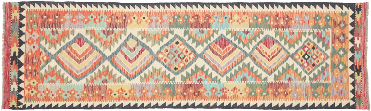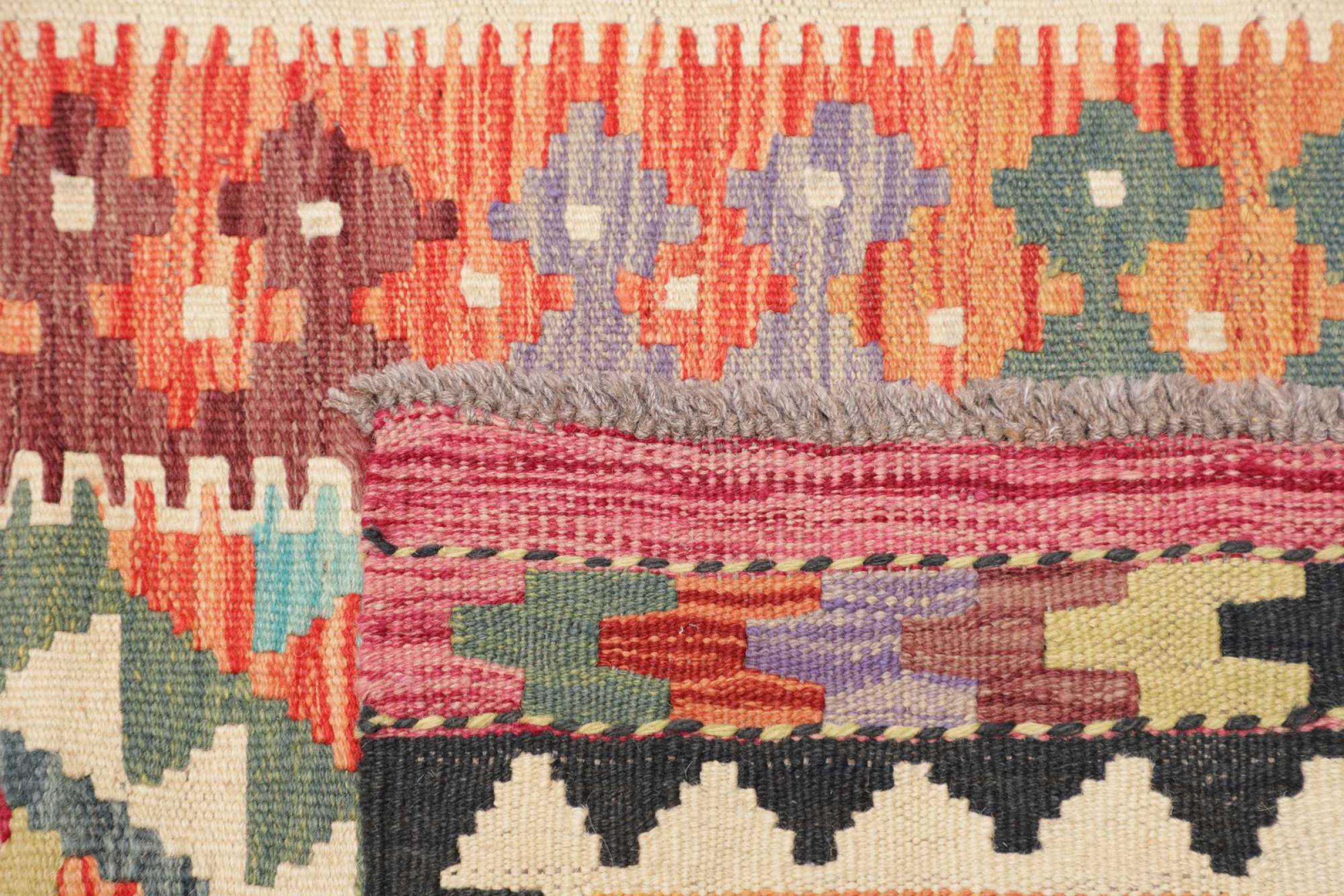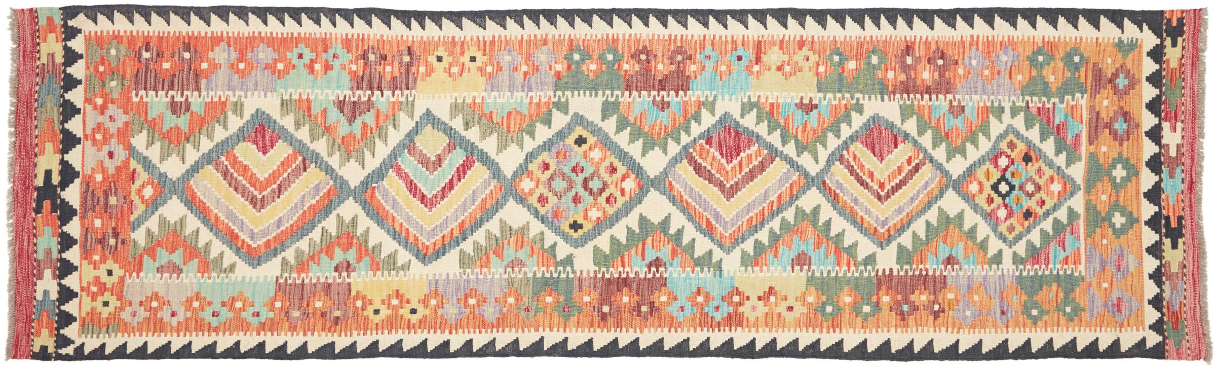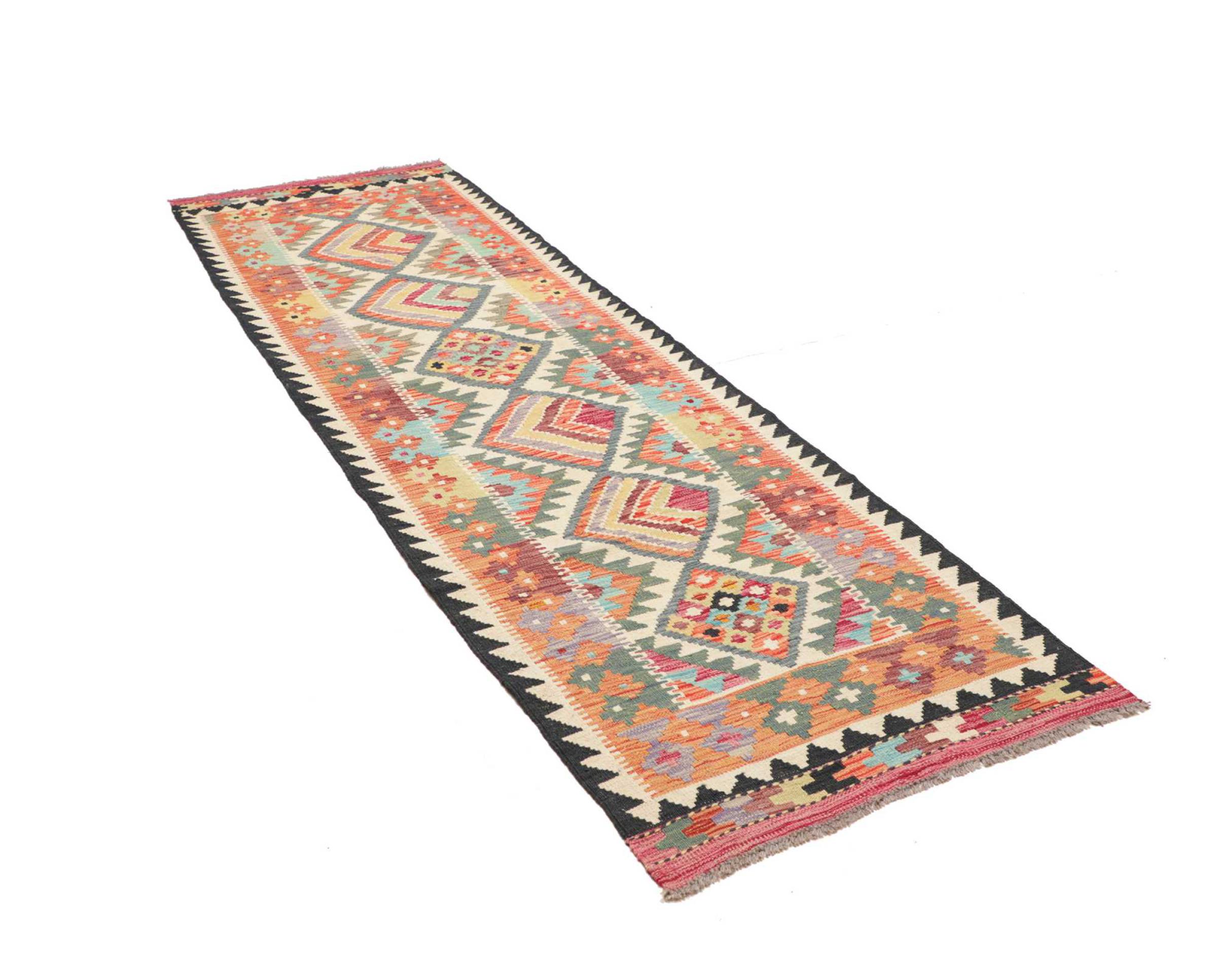Deze handgeweven kilim Afghan is prachtig door de veelzijdige kleuren en het typische patroon. Het is handgeweven in Afghanistan van 100% schapenwol. Het is ongetwijfeld robuuster en duurzamer dan machinaal vervaardigde tapijten. Daarnaast heeft deze kelim een ​​heel eigen karakter. Een uniek stuk voor jou en je huis dat je nooit meer zult vinden.
