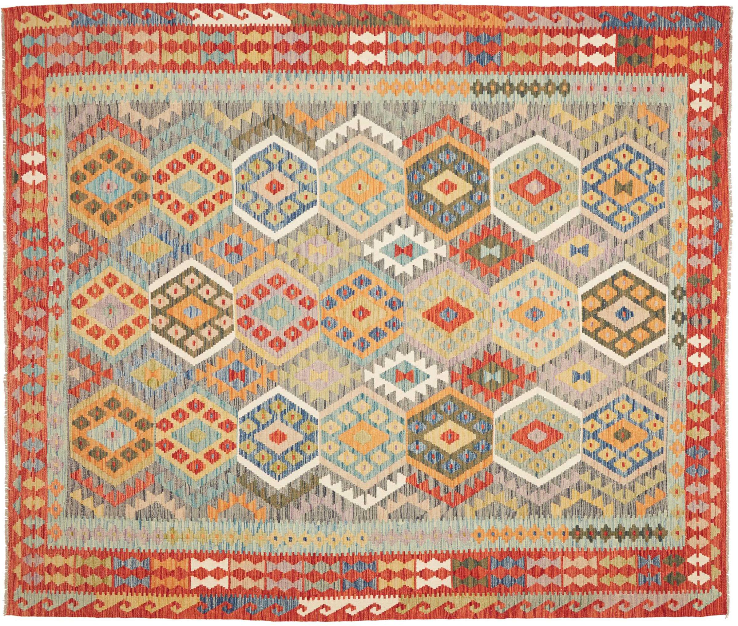 Tapijt ID: 291185006571099 Grootte: 292x251 cm Dikte: ap. 3 mm Verwerking: Handgeweven Pool: Hand gesponnen wol Schering: Katoen Oorsprong: Afghanistan Leeftijd: Nieuw Gewicht: ap. 11 kg Op voorraad: Uniek - Nog maar 1 op voorraad
