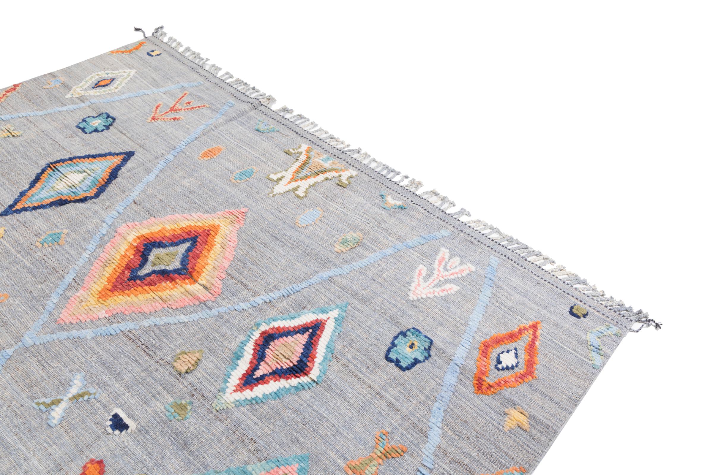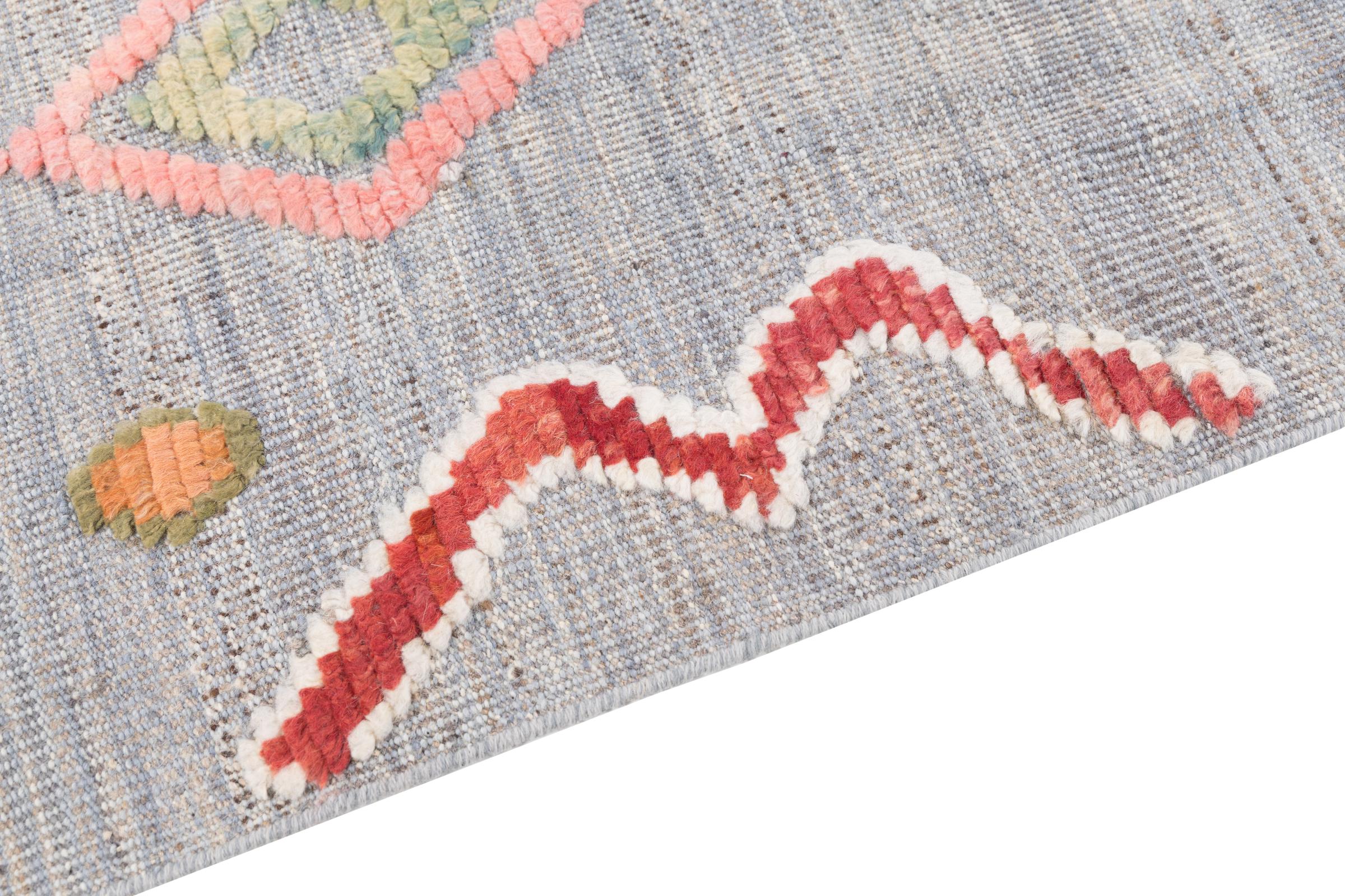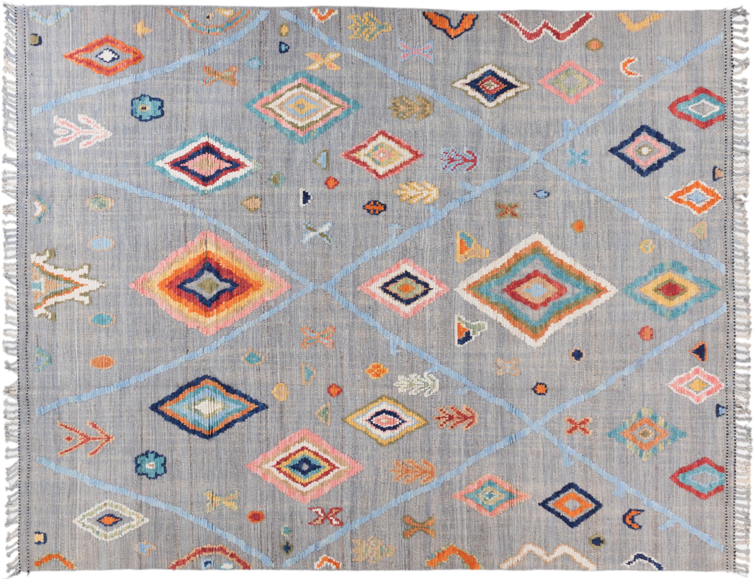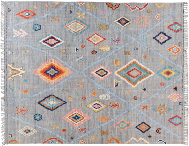 Dit tapijt is met de hand gemaakt op een weefgetouw als plat weefgetouw. Flatweave is de term die wordt gebruikt om tapijten zonder pool te beschrijven. Zoals de naam al belooft, zijn deze tapijten geweven en niet geknoopt. Dit resulteert in een vlak tapijt met een gestructureerd oppervlak. Platweefsels zijn niet zo zacht en meestal dunner dan geknoopte tapijten. Tegelijkertijd zijn ze veel minder complex te vervaardigen en kunnen ze meestal aan beide zijden (voor- en achterkant) worden gelegd. Hun patronen zijn meestal geometrisch, wat wordt bepaald door de stof.