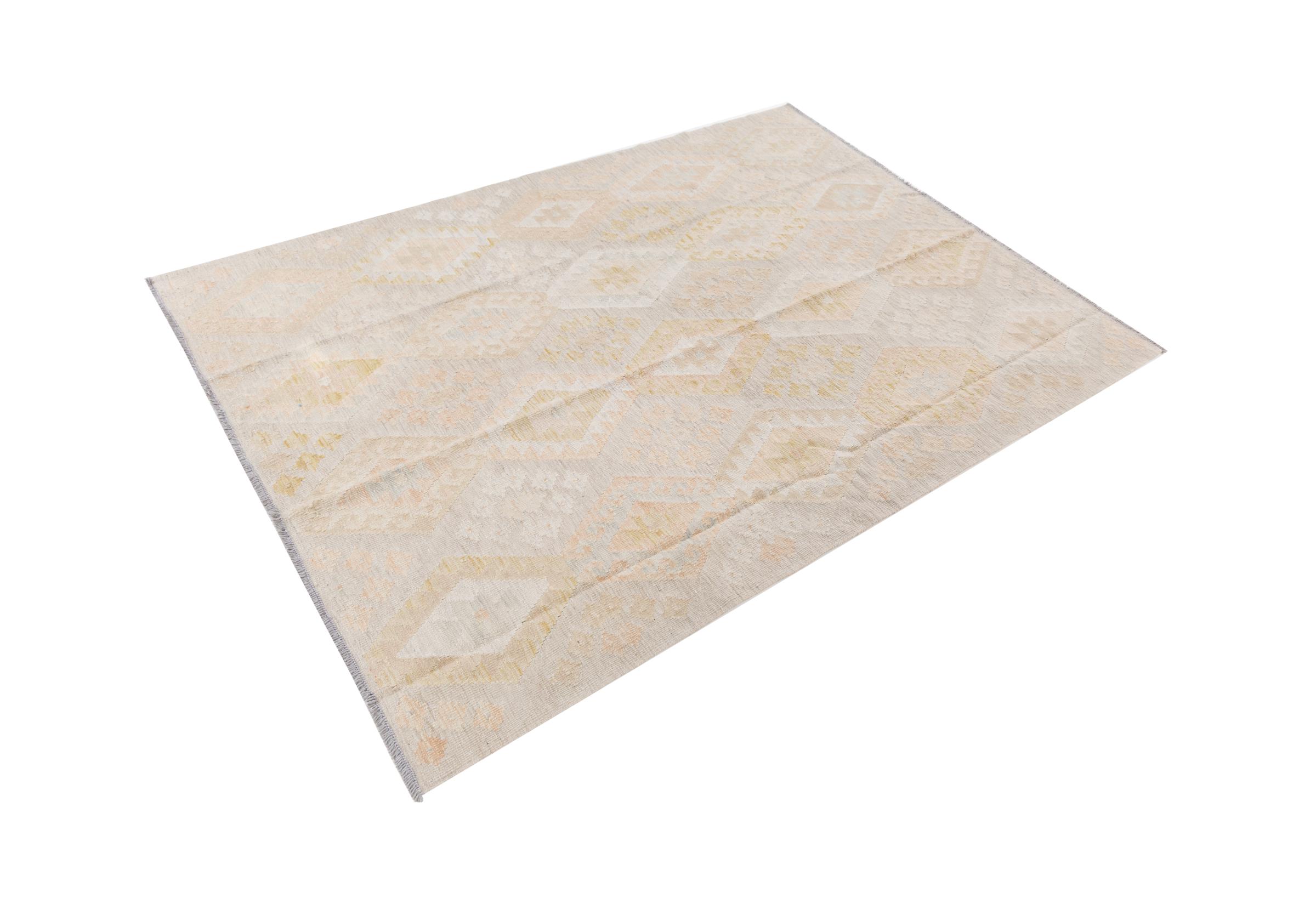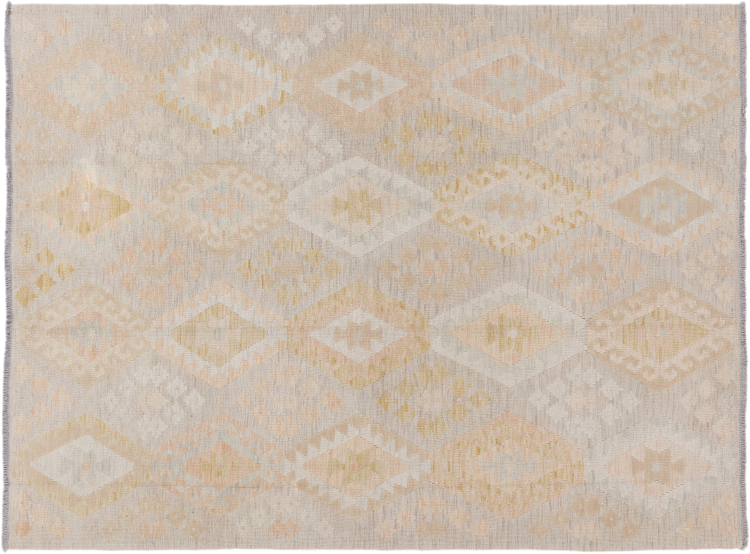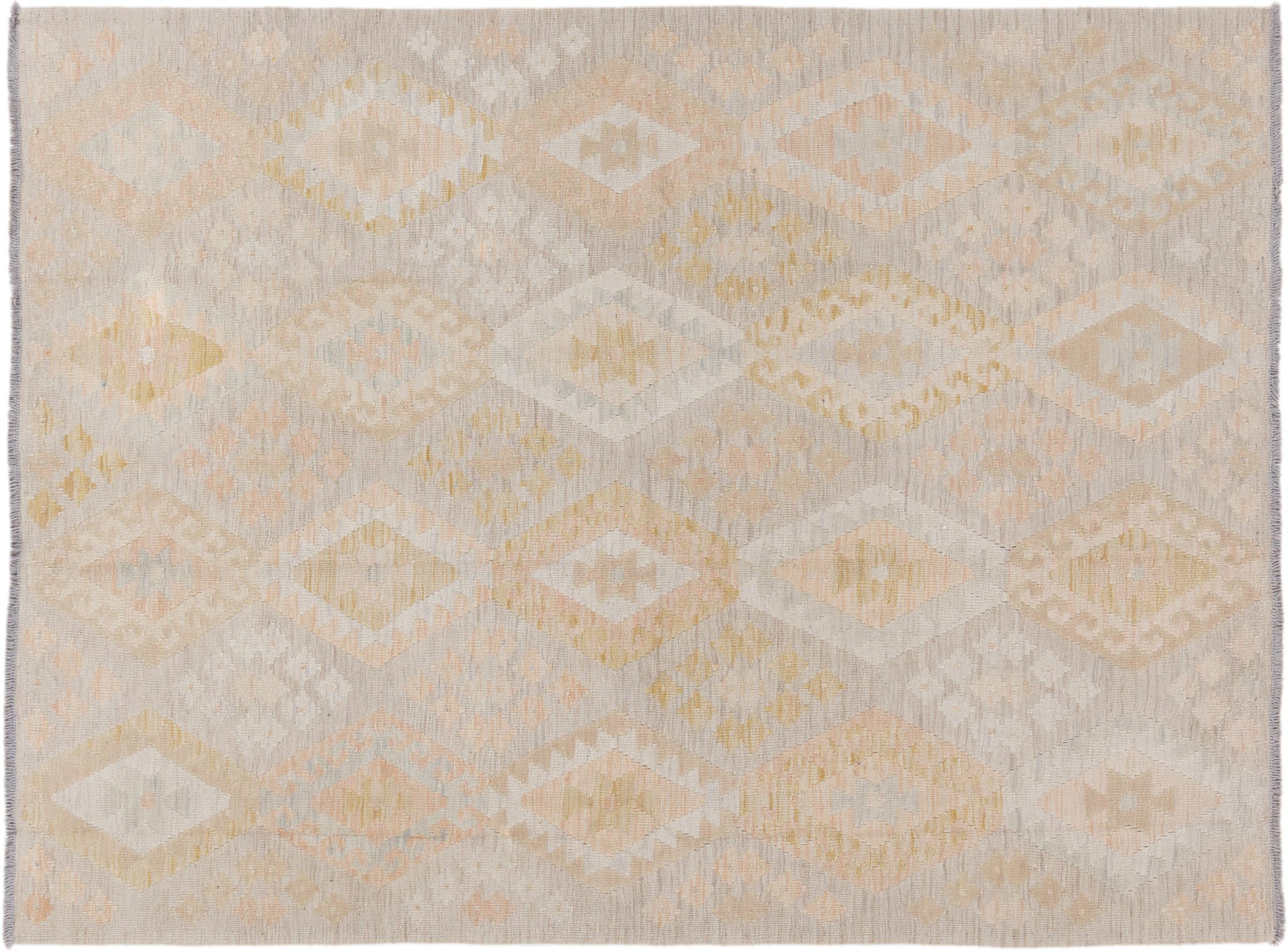 Tapijt ID: 2948860051690 Grootte: 198x147 cm Dikte: ap. 3 mm Verwerking: Handgeweven Pool: Hand gesponnen wol Schering: Wol Oorsprong: Afghanistan Leeftijd: Nieuw Gewicht: ap. 4 kg Ook wel bekend als Kilim, Qilim, Chilim, Afgan, Afghán Op voorraad: Uniek - Nog maar 1 op voorraad
