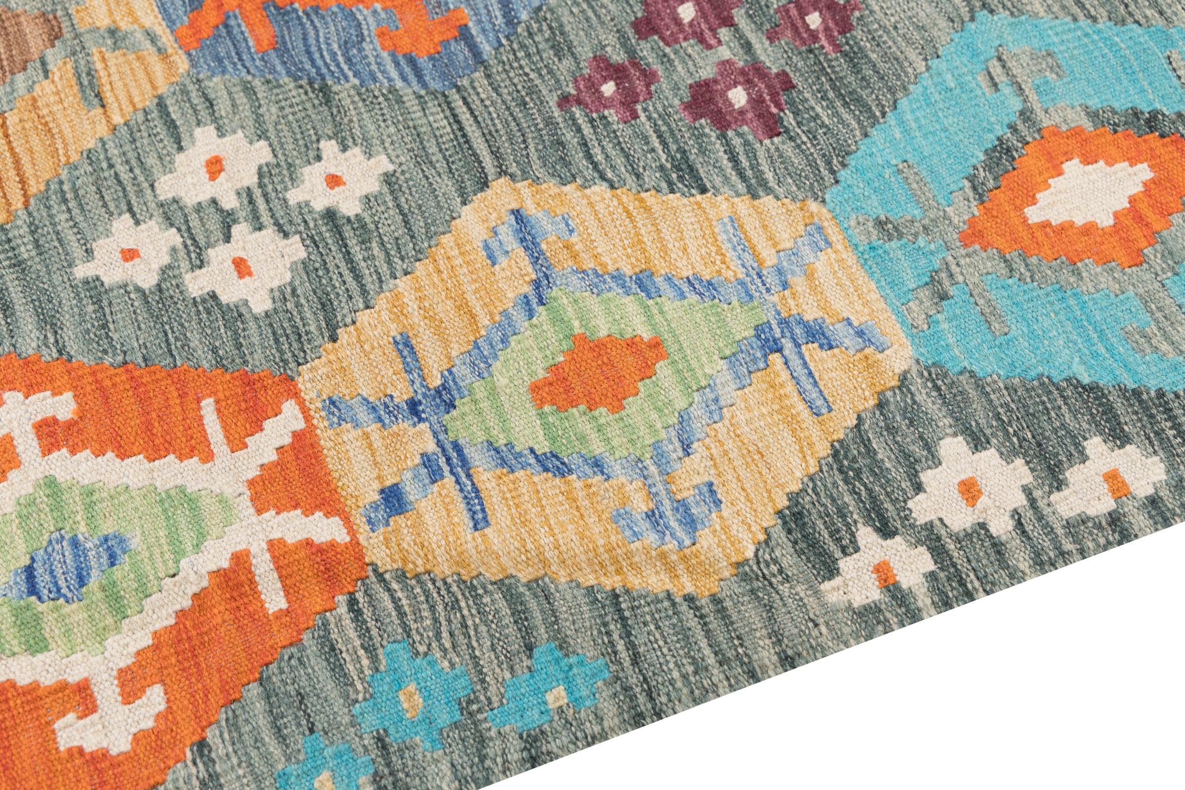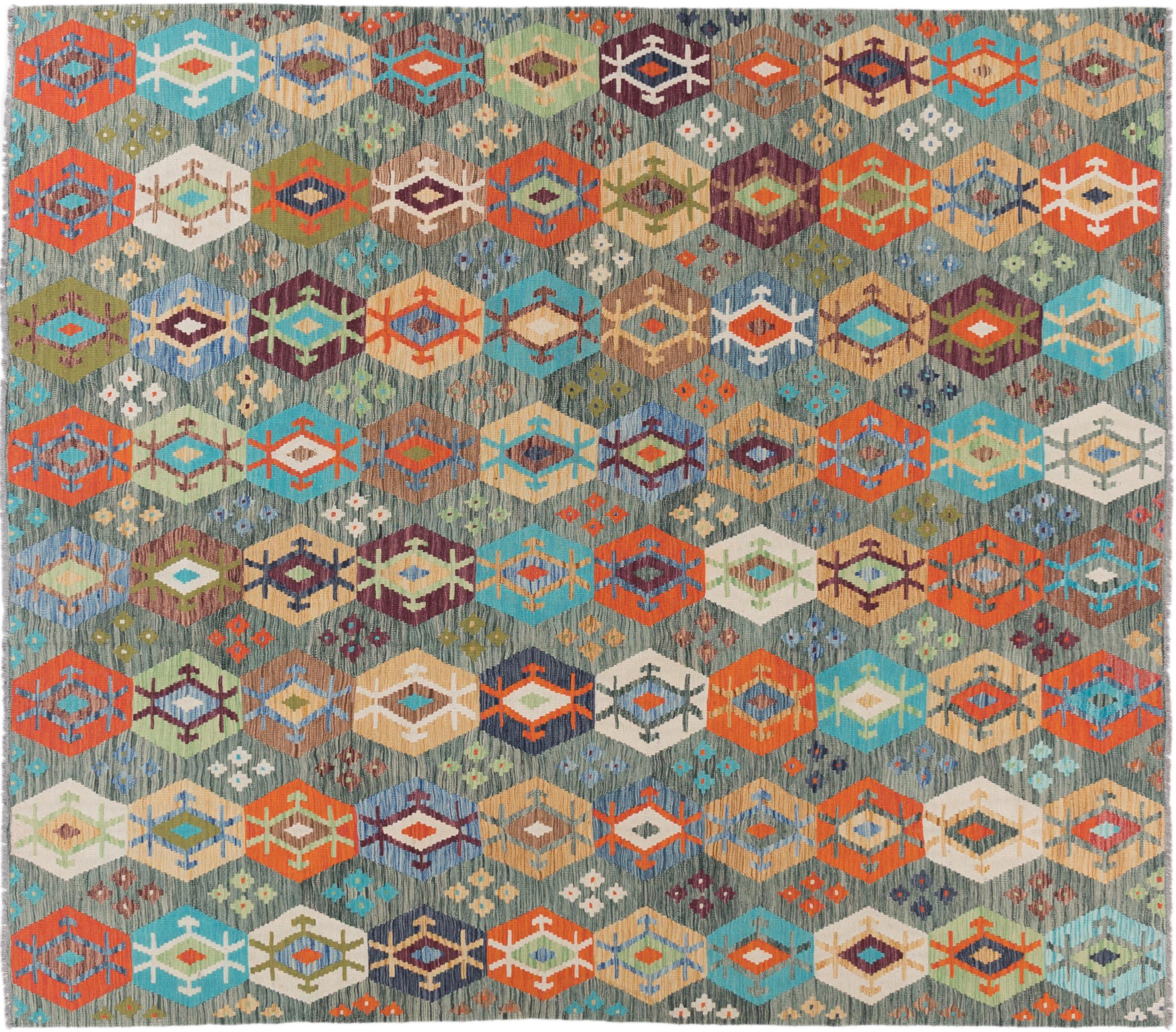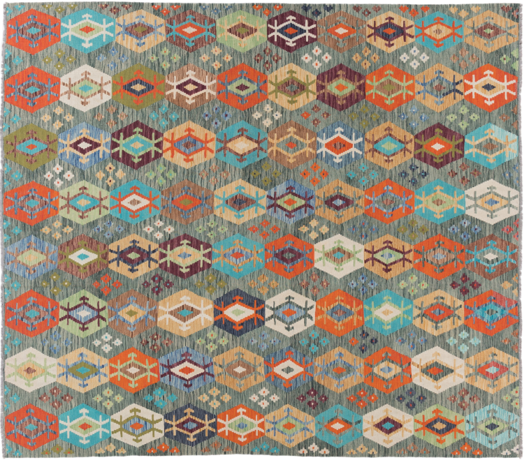 Tapijt ID: 294824005082 Grootte: 293x258 cm Dikte: ap. 3 mm Verwerking: Handgeweven Pool: Hand gesponnen wol Schering: Wol Oorsprong: Afghanistan Leeftijd: Nieuw Gewicht: ap. 11 kg Ook wel bekend als Kilim, Qilim, Chilim, Afgan, Afghán Op voorraad: Uniek - Nog maar 1 op voorraad