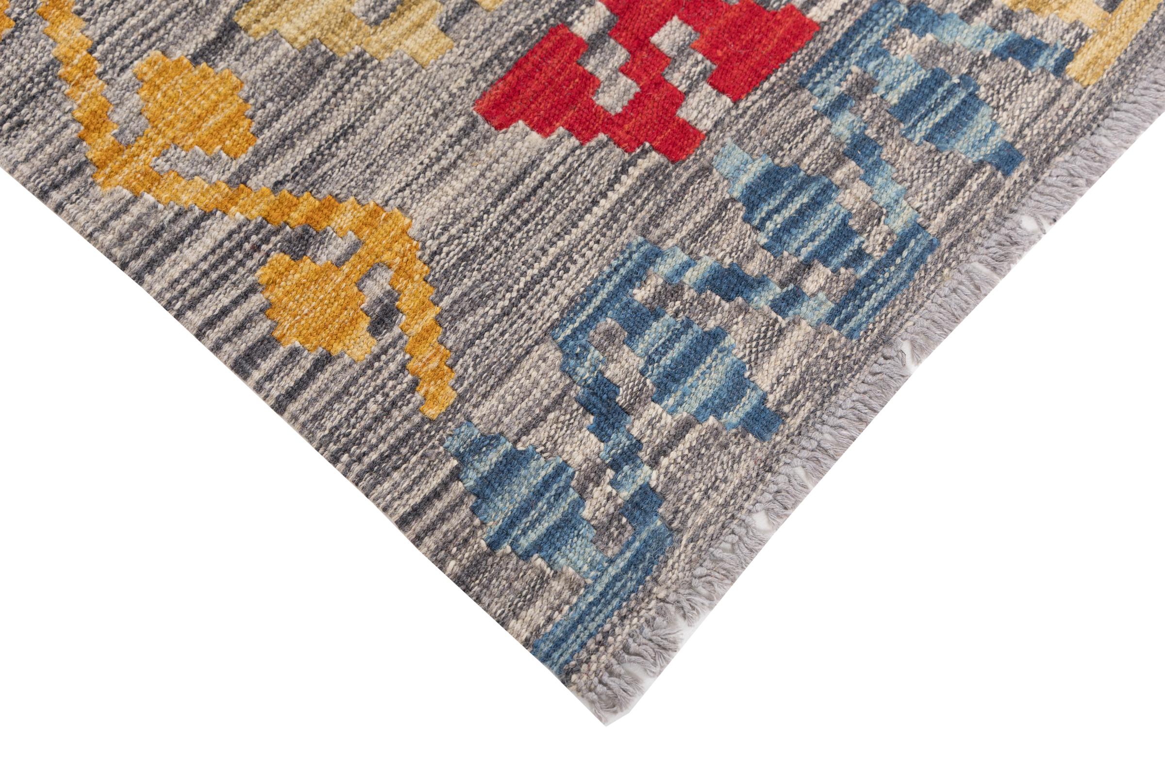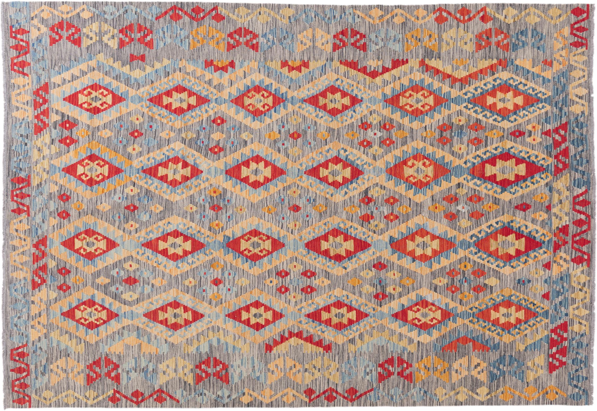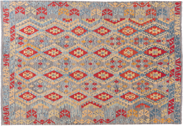 Tapijt ID: 2942570051441 Grootte: 297x208 cm Dikte: ap. 3 mm Verwerking: Handgeweven Pool: Hand gesponnen wol Schering: Wol Oorsprong: Afghanistan Leeftijd: Nieuw Gewicht: ap. 9 kg Ook wel bekend als Kilim, Qilim, Chilim, Afgan, Afghán Op voorraad: Uniek - Nog maar 1 op voorraad