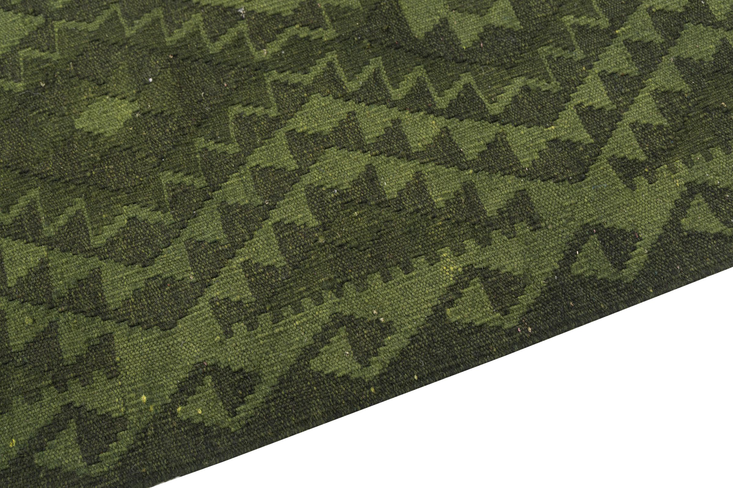 Dit tapijt is met de hand gemaakt op een weefgetouw als plat weefgetouw. Flatweave is de term die wordt gebruikt om tapijten zonder pool te beschrijven. Zoals de naam al belooft, zijn deze tapijten geweven en niet geknoopt. Dit resulteert in een vlak tapijt met een gestructureerd oppervlak. Platweefsels zijn niet zo zacht en meestal dunner dan geknoopte tapijten. Tegelijkertijd zijn ze veel minder complex te vervaardigen en kunnen ze meestal aan beide zijden (voor- en achterkant) worden gelegd. Hun patronen zijn meestal geometrisch, wat wordt bepaald door de stof.