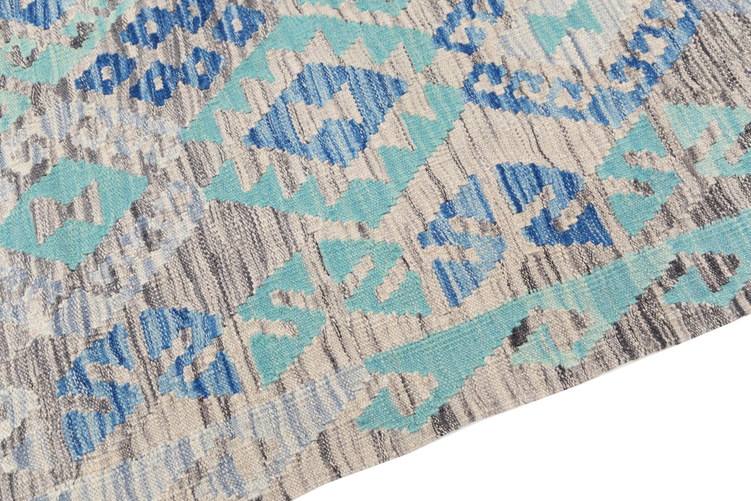 Dit tapijt is met de hand gemaakt op een weefgetouw als plat weefgetouw. Flatweave is de term die wordt gebruikt om tapijten zonder pool te beschrijven. Zoals de naam al belooft, zijn deze tapijten geweven en niet geknoopt. Dit resulteert in een vlak tapijt met een gestructureerd oppervlak. Platweefsels zijn niet zo zacht en meestal dunner dan geknoopte tapijten. Tegelijkertijd zijn ze veel minder complex te vervaardigen en kunnen ze meestal aan beide zijden (voor- en achterkant) worden gelegd. Hun patronen zijn meestal geometrisch, wat wordt bepaald door de stof.