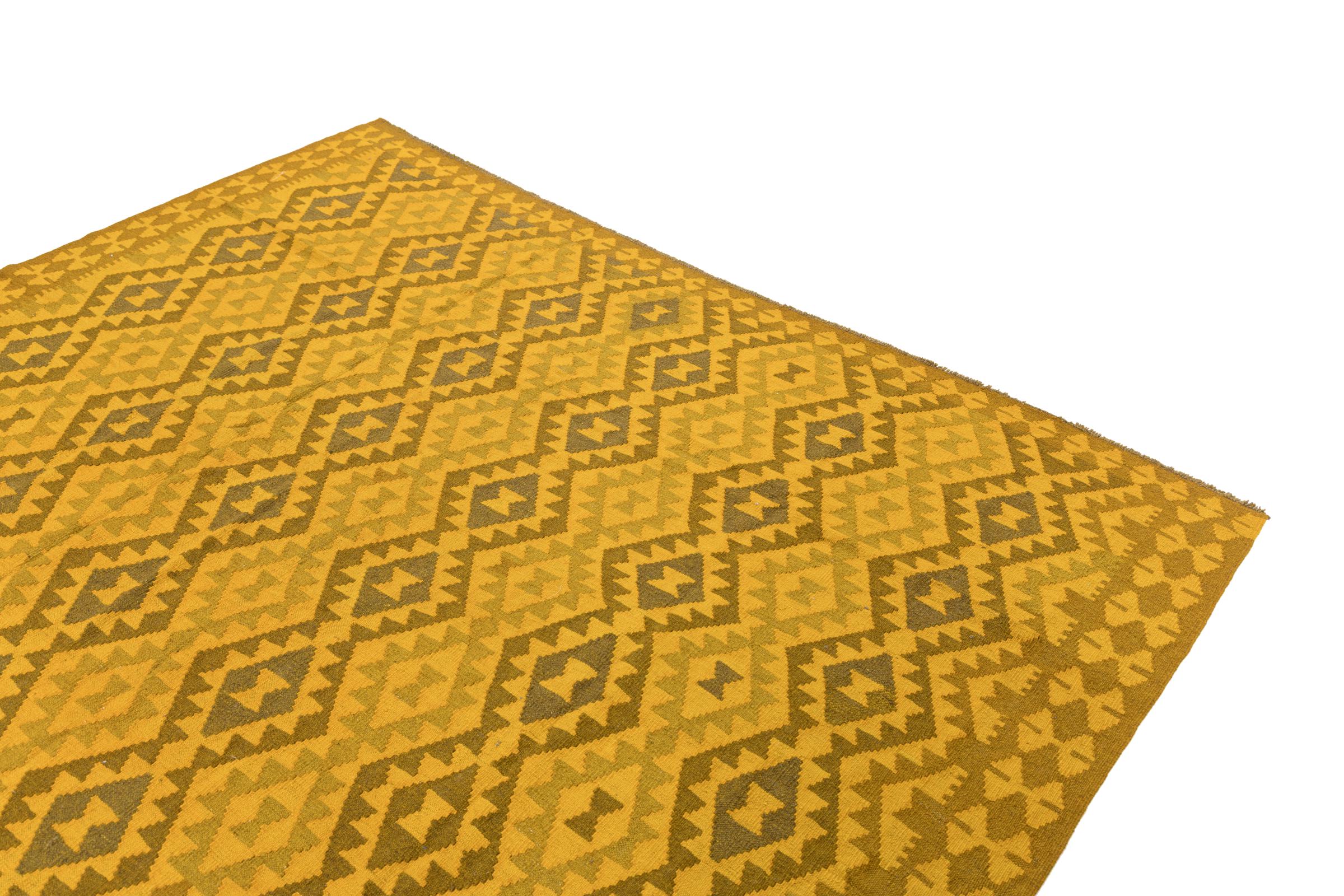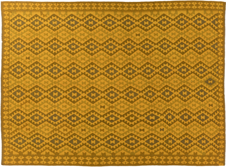 Dit tapijt is met de hand gemaakt op een weefgetouw als plat weefgetouw. Flatweave is de term die wordt gebruikt om tapijten zonder pool te beschrijven. Zoals de naam al belooft, zijn deze tapijten geweven en niet geknoopt. Dit resulteert in een vlak tapijt met een gestructureerd oppervlak. Platweefsels zijn niet zo zacht en meestal dunner dan geknoopte tapijten. Tegelijkertijd zijn ze veel minder complex te vervaardigen en kunnen ze meestal aan beide zijden (voor- en achterkant) worden gelegd. Hun patronen zijn meestal geometrisch, wat wordt bepaald door de stof.