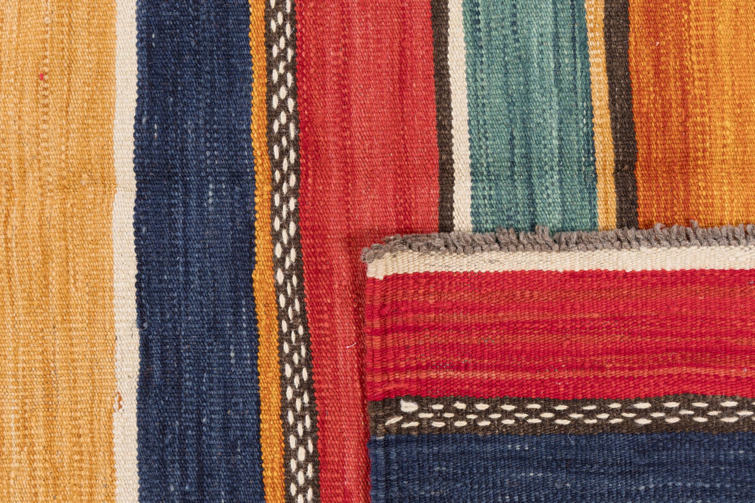 Dit tapijt is met de hand gemaakt op een weefgetouw als plat weefgetouw. Flatweave is de term die wordt gebruikt om tapijten zonder pool te beschrijven. Zoals de naam al belooft, zijn deze tapijten geweven en niet geknoopt. Dit resulteert in een vlak tapijt met een gestructureerd oppervlak. Platweefsels zijn niet zo zacht en meestal dunner dan geknoopte tapijten. Tegelijkertijd zijn ze veel minder complex te vervaardigen en kunnen ze meestal aan beide zijden (voor- en achterkant) worden gelegd. Hun patronen zijn meestal geometrisch, wat wordt bepaald door de stof.