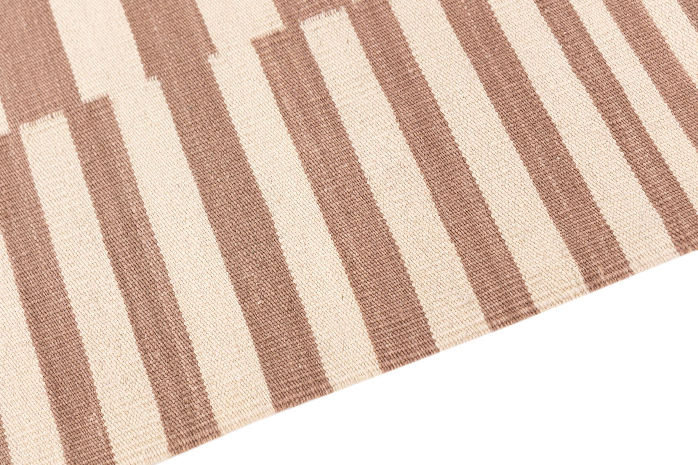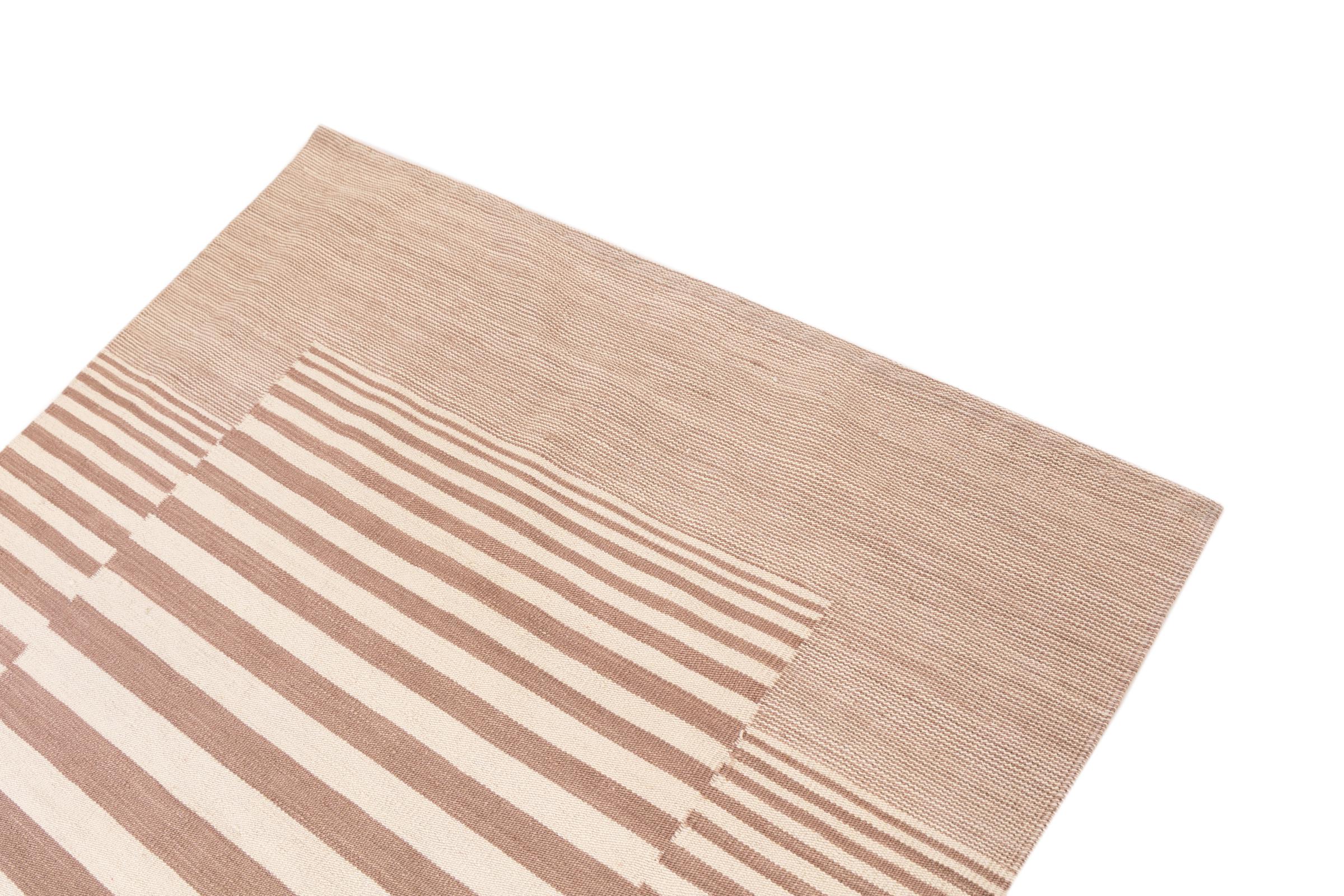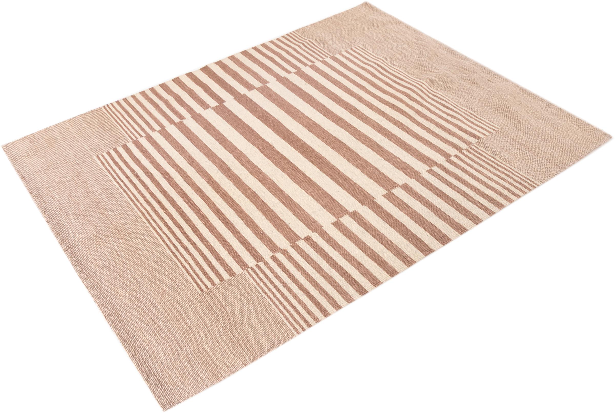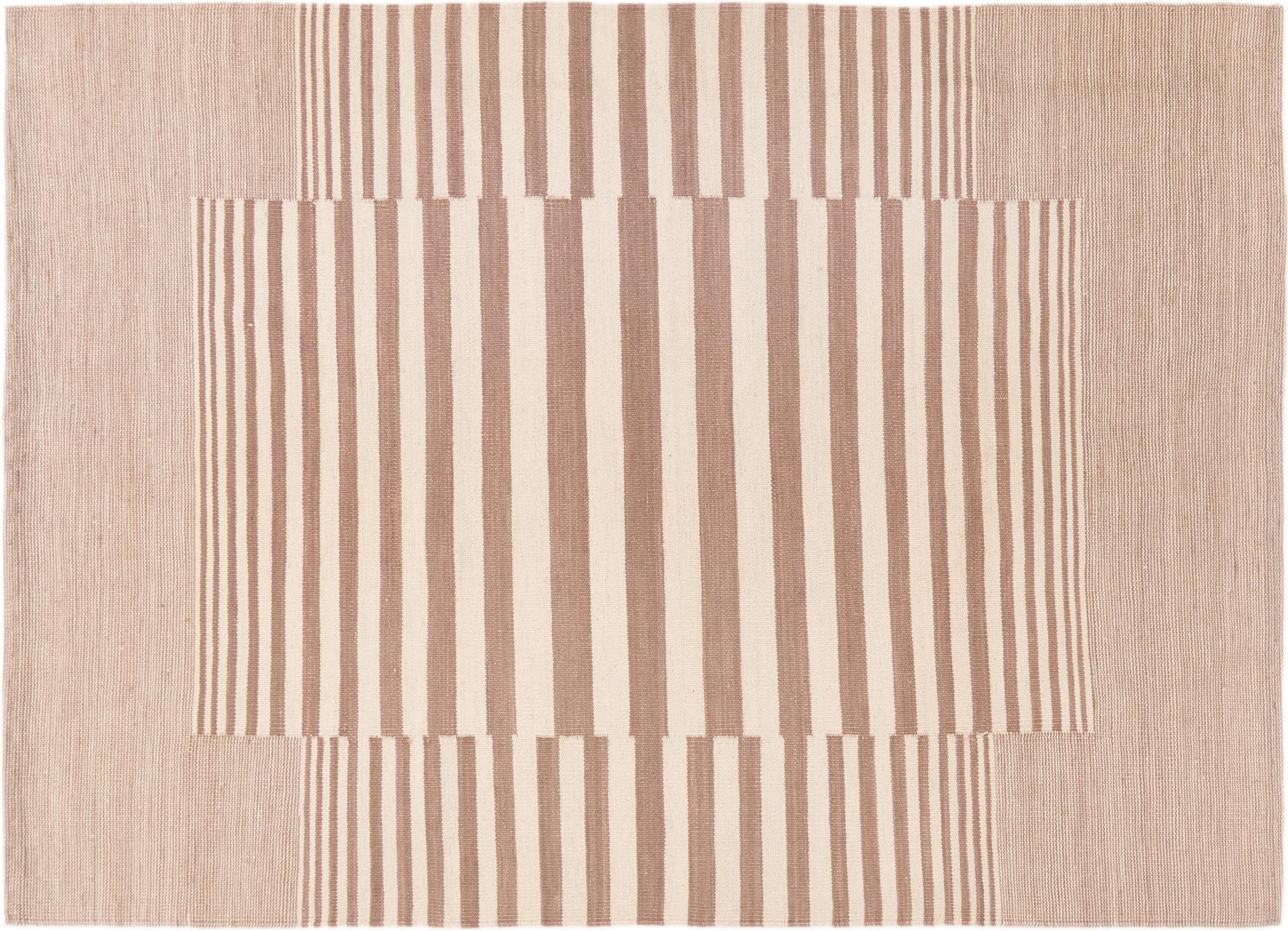 Dit tapijt is met de hand gemaakt op een weefgetouw als plat weefgetouw. Flatweave is de term die wordt gebruikt om tapijten zonder pool te beschrijven. Zoals de naam al belooft, zijn deze tapijten geweven en niet geknoopt. Dit resulteert in een vlak tapijt met een gestructureerd oppervlak. Platweefsels zijn niet zo zacht en meestal dunner dan geknoopte tapijten. Tegelijkertijd zijn ze veel minder complex te vervaardigen en kunnen ze meestal aan beide zijden (voor- en achterkant) worden gelegd. Hun patronen zijn meestal geometrisch, wat wordt bepaald door de stof.
