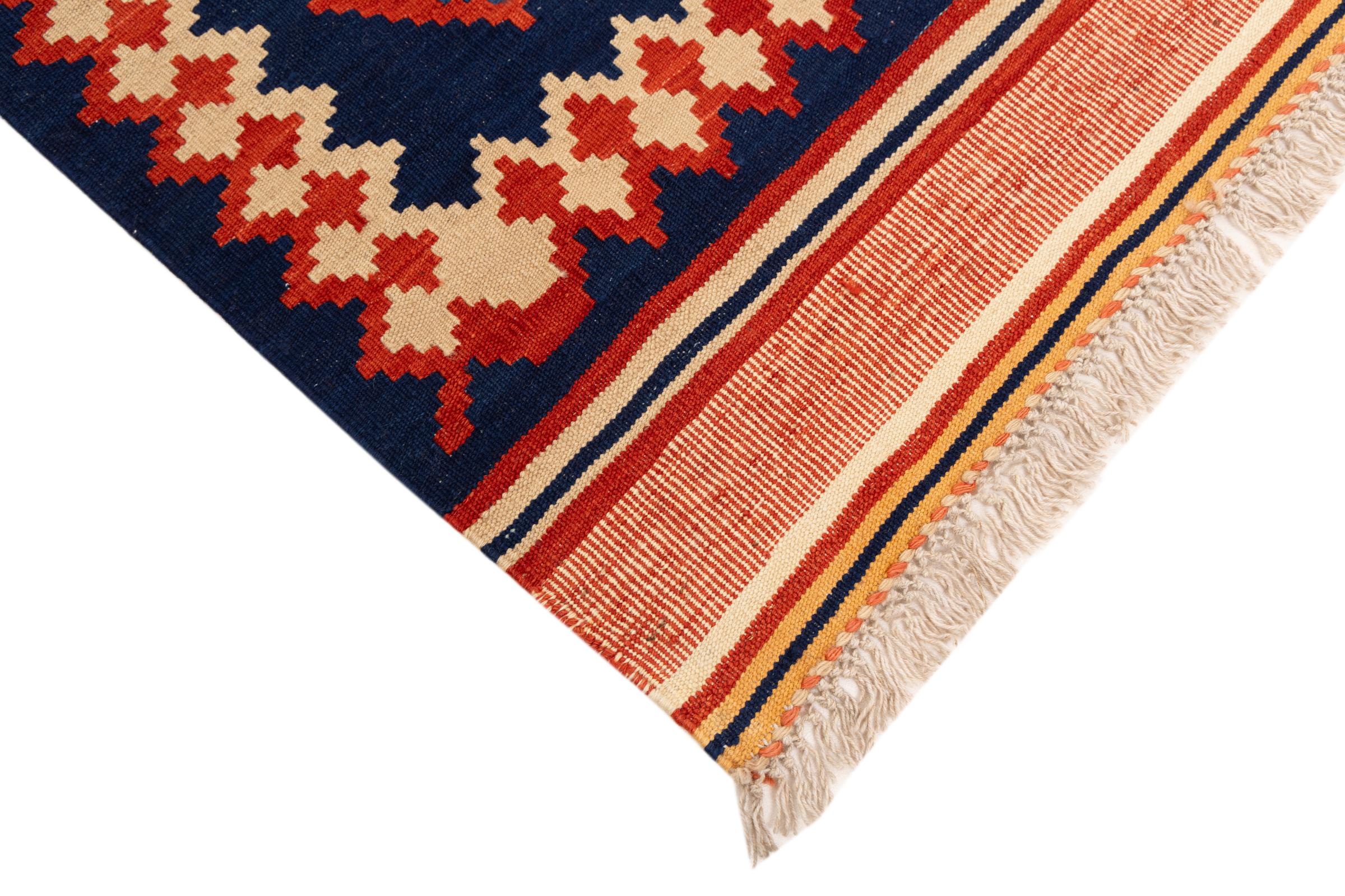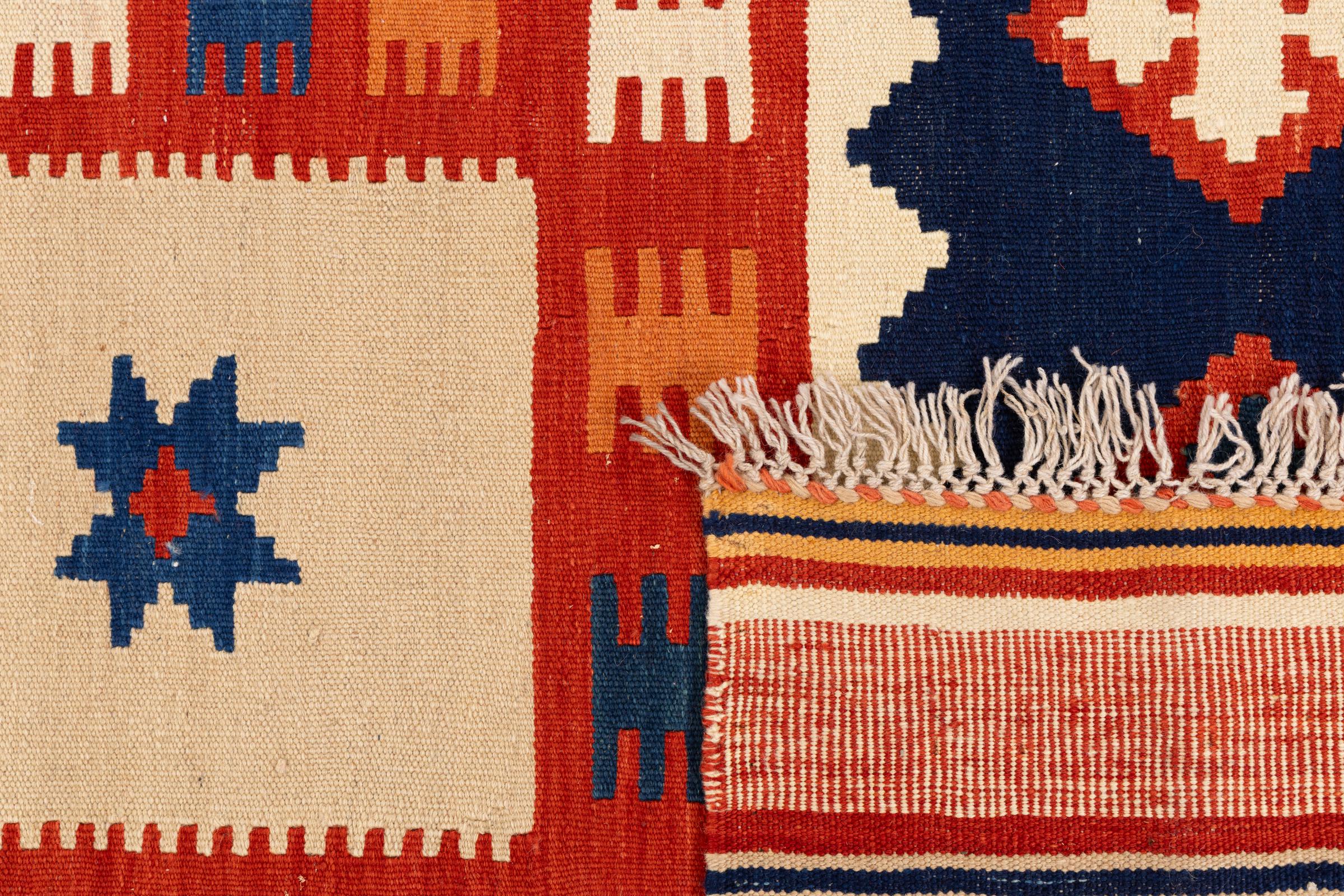 Dit tapijt is met de hand gemaakt op een weefgetouw als plat weefgetouw. Flatweave is de term die wordt gebruikt om tapijten zonder pool te beschrijven. Zoals de naam al belooft, zijn deze tapijten geweven en niet geknoopt. Dit resulteert in een vlak tapijt met een gestructureerd oppervlak. Platweefsels zijn niet zo zacht en meestal dunner dan geknoopte tapijten. Tegelijkertijd zijn ze veel minder complex te vervaardigen en kunnen ze meestal aan beide zijden (voor- en achterkant) worden gelegd. Hun patronen zijn meestal geometrisch, wat wordt bepaald door de stof.