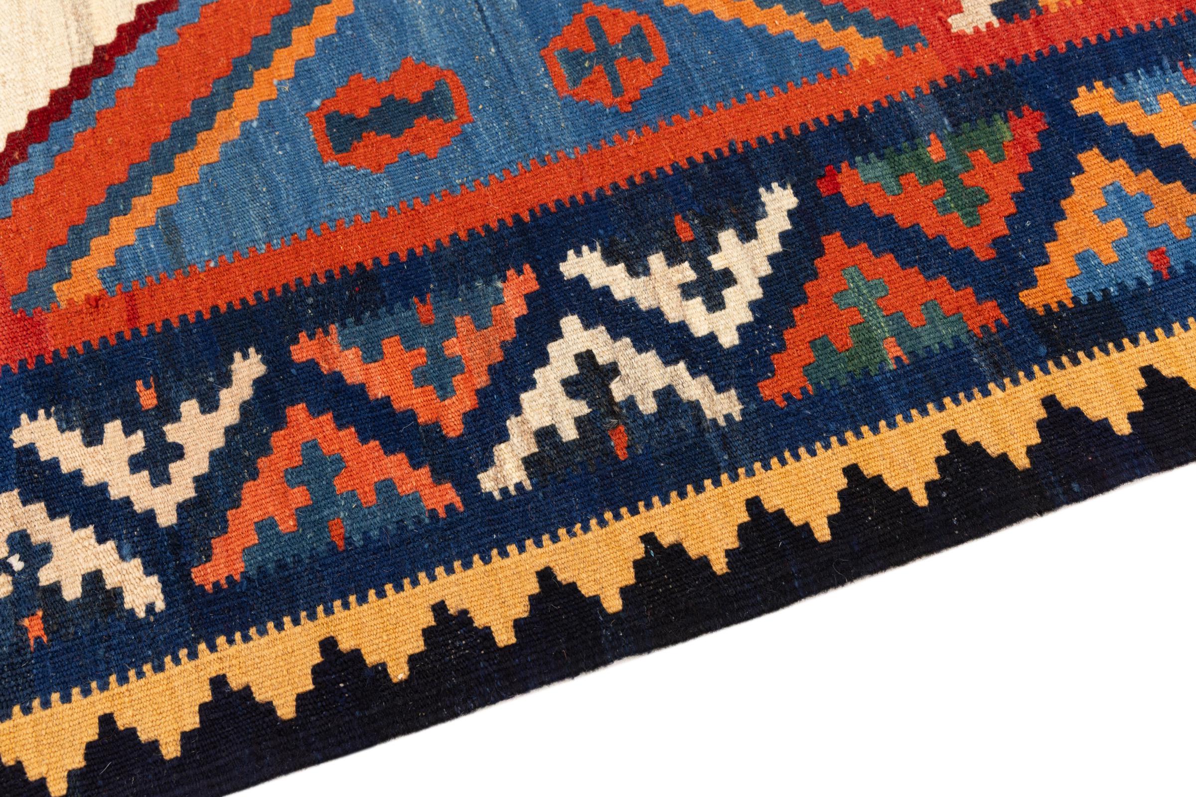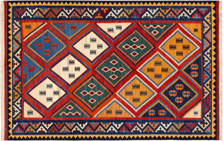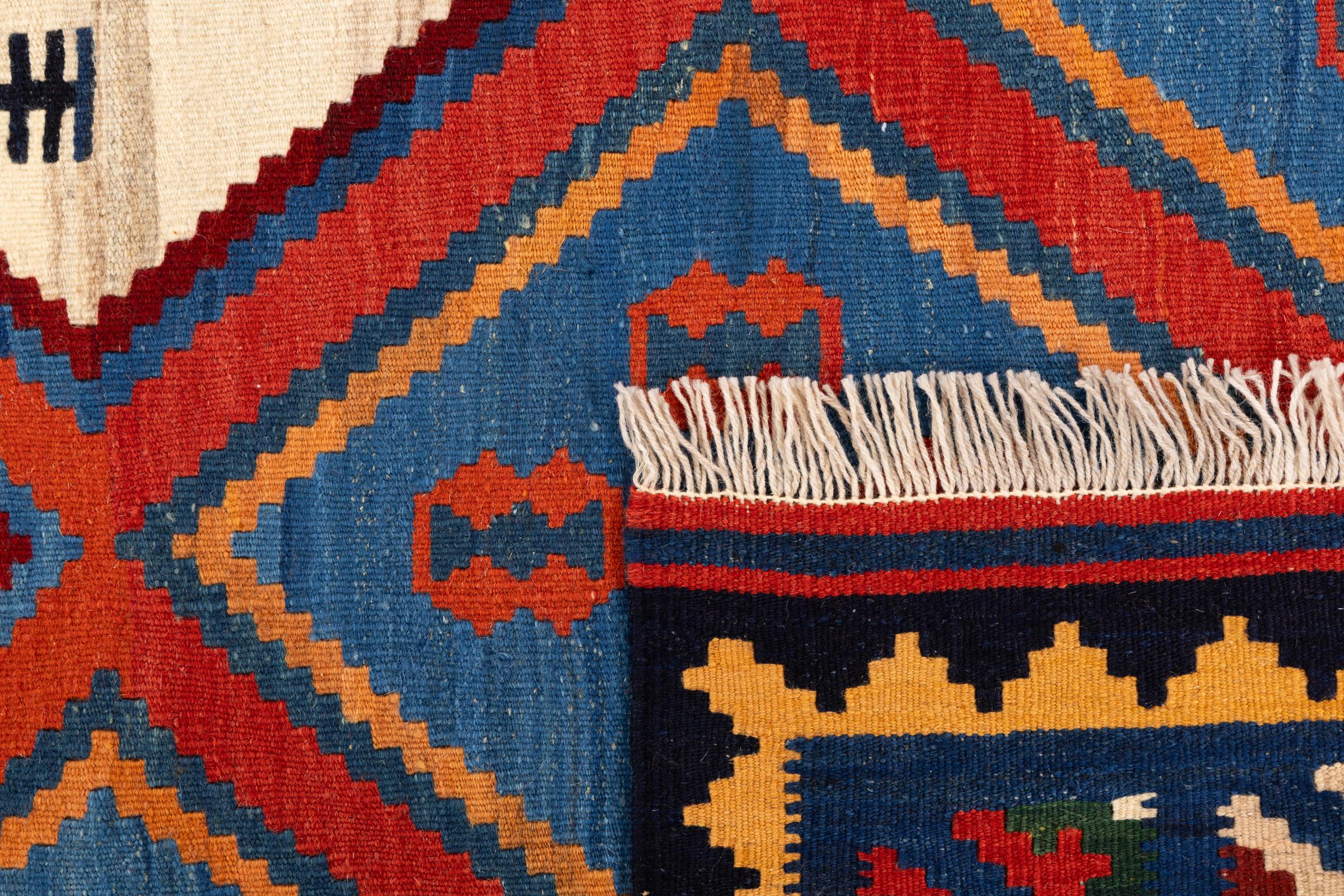 Dit tapijt is met de hand gemaakt op een weefgetouw als plat weefgetouw. Flatweave is de term die wordt gebruikt om tapijten zonder pool te beschrijven. Zoals de naam al belooft, zijn deze tapijten geweven en niet geknoopt. Dit resulteert in een vlak tapijt met een gestructureerd oppervlak. Platweefsels zijn niet zo zacht en meestal dunner dan geknoopte tapijten. Tegelijkertijd zijn ze veel minder complex te vervaardigen en kunnen ze meestal aan beide zijden (voor- en achterkant) worden gelegd. Hun patronen zijn meestal geometrisch, wat wordt bepaald door de stof.