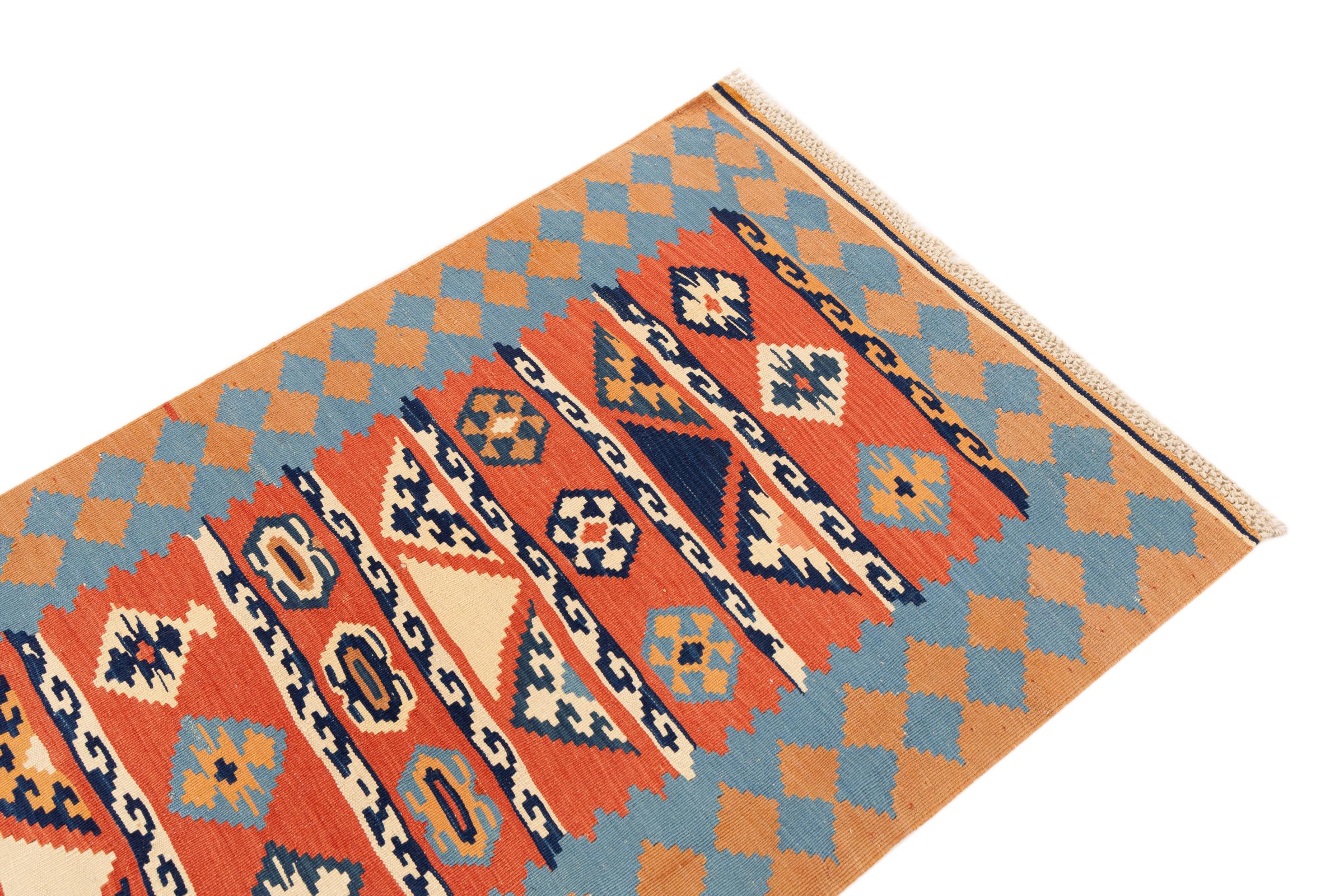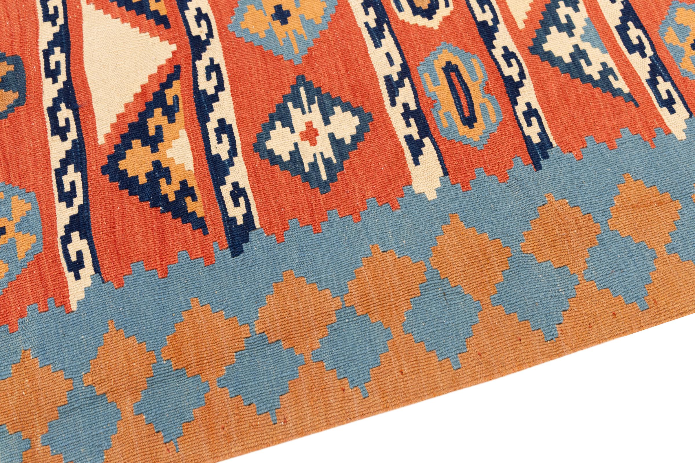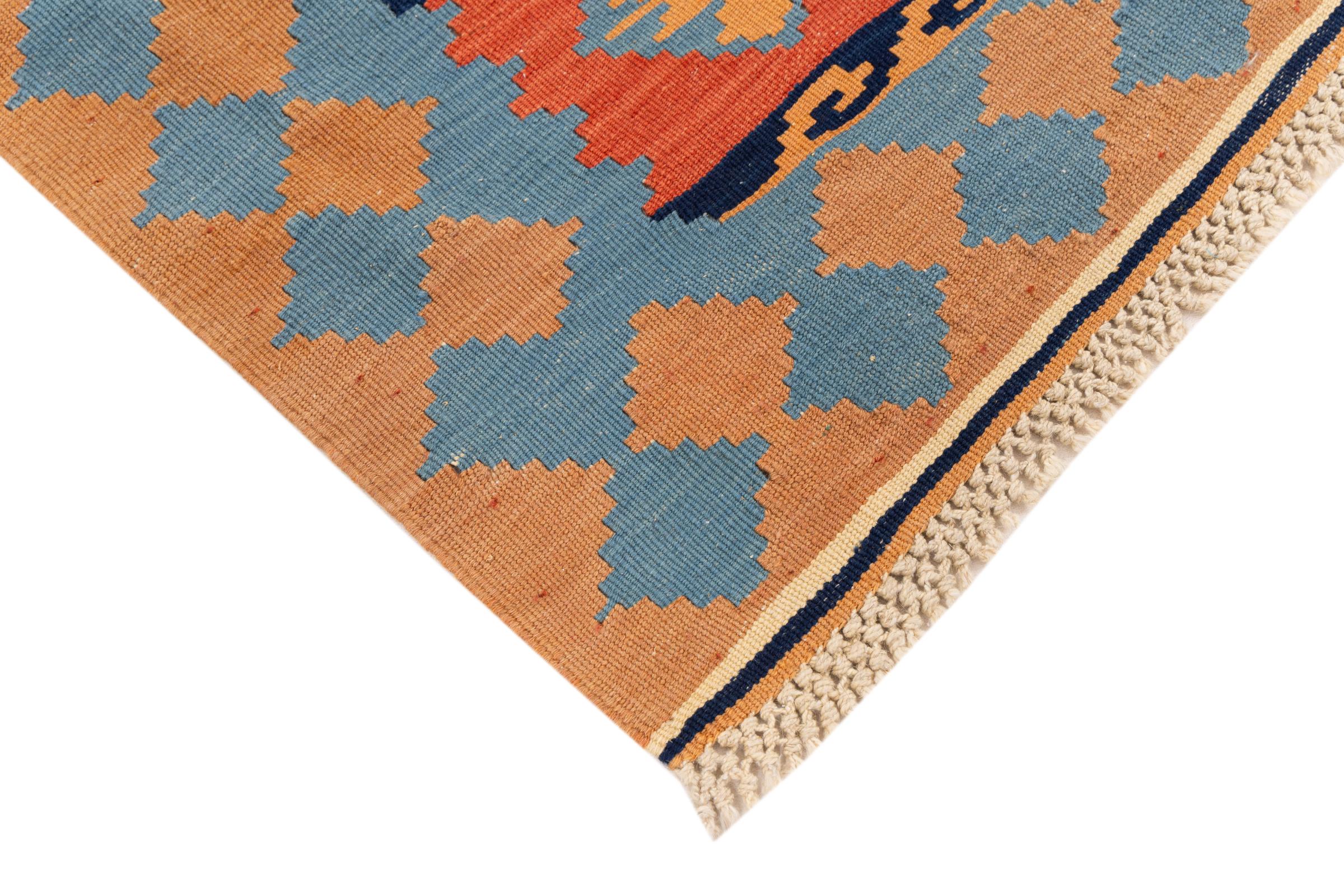 Dit tapijt is met de hand gemaakt op een weefgetouw als plat weefgetouw. Flatweave is de term die wordt gebruikt om tapijten zonder pool te beschrijven. Zoals de naam al belooft, zijn deze tapijten geweven en niet geknoopt. Dit resulteert in een vlak tapijt met een gestructureerd oppervlak. Platweefsels zijn niet zo zacht en meestal dunner dan geknoopte tapijten. Tegelijkertijd zijn ze veel minder complex te vervaardigen en kunnen ze meestal aan beide zijden (voor- en achterkant) worden gelegd. Hun patronen zijn meestal geometrisch, wat wordt bepaald door de stof.