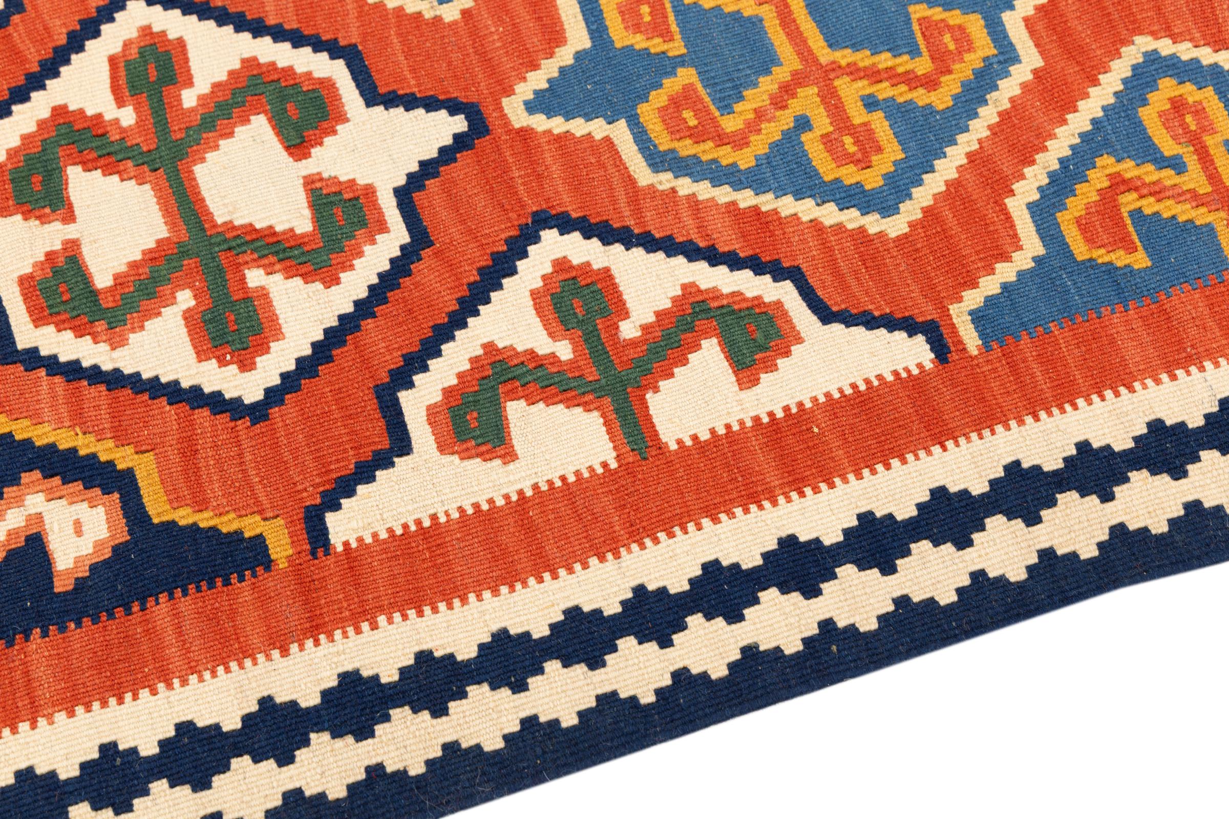 Dit tapijt is met de hand gemaakt op een weefgetouw als plat weefgetouw. Flatweave is de term die wordt gebruikt om tapijten zonder pool te beschrijven. Zoals de naam al belooft, zijn deze tapijten geweven en niet geknoopt. Dit resulteert in een vlak tapijt met een gestructureerd oppervlak. Platweefsels zijn niet zo zacht en meestal dunner dan geknoopte tapijten. Tegelijkertijd zijn ze veel minder complex te vervaardigen en kunnen ze meestal aan beide zijden (voor- en achterkant) worden gelegd. Hun patronen zijn meestal geometrisch, wat wordt bepaald door de stof.