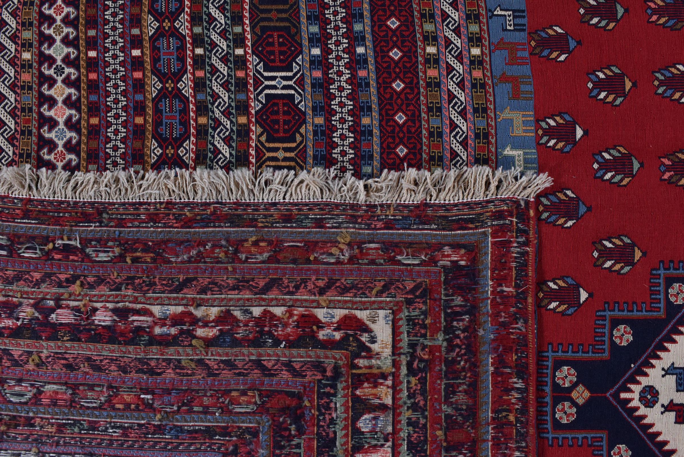 Dit tapijt is met de hand gemaakt op een weefgetouw als plat weefgetouw. Flatweave is de term die wordt gebruikt om tapijten zonder pool te beschrijven. Zoals de naam al belooft, zijn deze tapijten geweven en niet geknoopt. Dit resulteert in een vlak tapijt met een gestructureerd oppervlak. Platweefsels zijn niet zo zacht en meestal dunner dan geknoopte tapijten. Tegelijkertijd zijn ze veel minder complex te vervaardigen en kunnen ze meestal aan beide zijden (voor- en achterkant) worden gelegd. Hun patronen zijn meestal geometrisch, wat wordt bepaald door de stof.