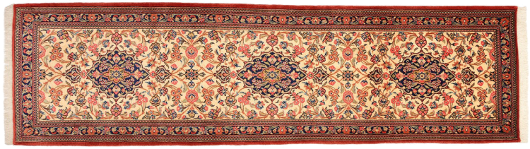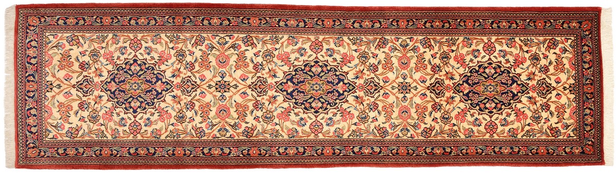 Tapijt ID: 1557400669216 Grootte: 294x82 cm Dikte: ap. 10 mm Knoopdichtheid: 320 000 - 350 000 / m² Verwerking: Handgeknoopte Pool: Hand gesponnen wol Schering: Katoen Oorsprong: Perzië / Iran Leeftijd: Nieuw Gewicht: ap. 8 kg Op voorraad: Uniek - Nog maar 1 op voorraad