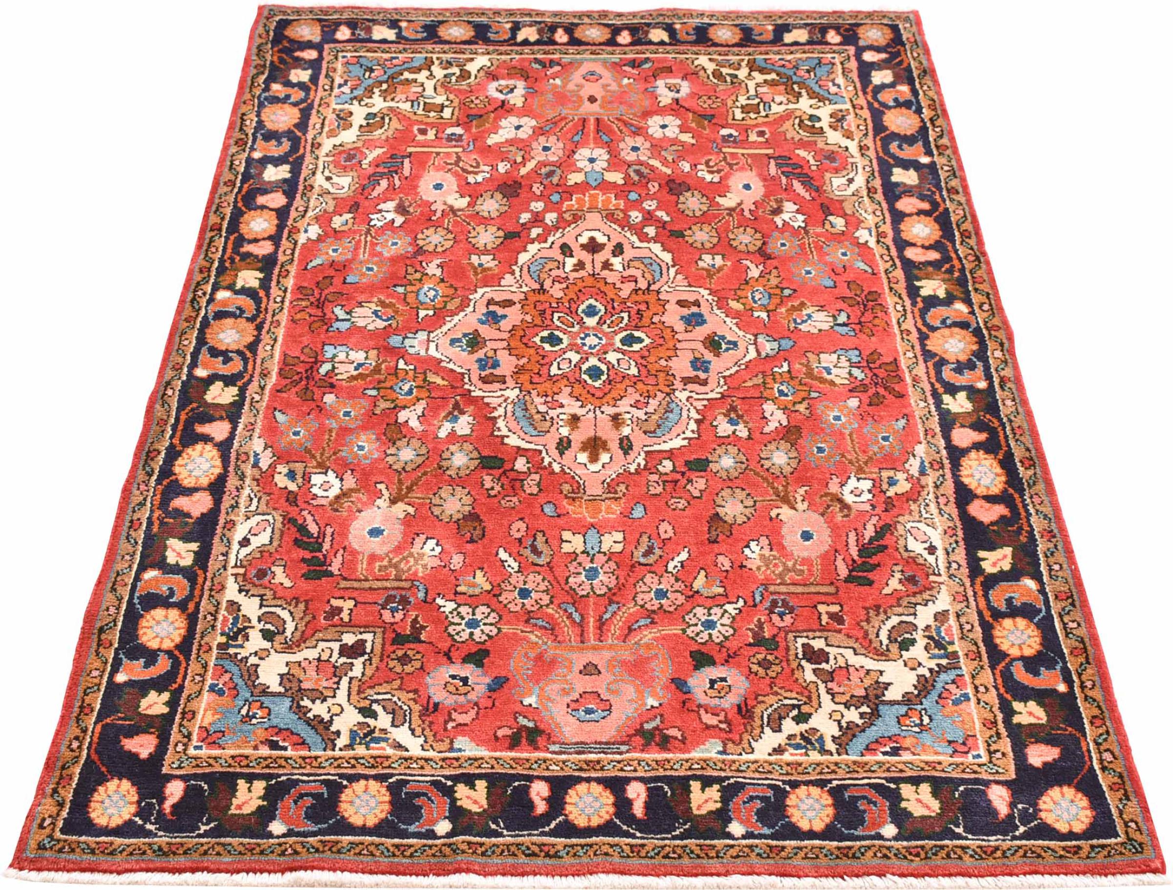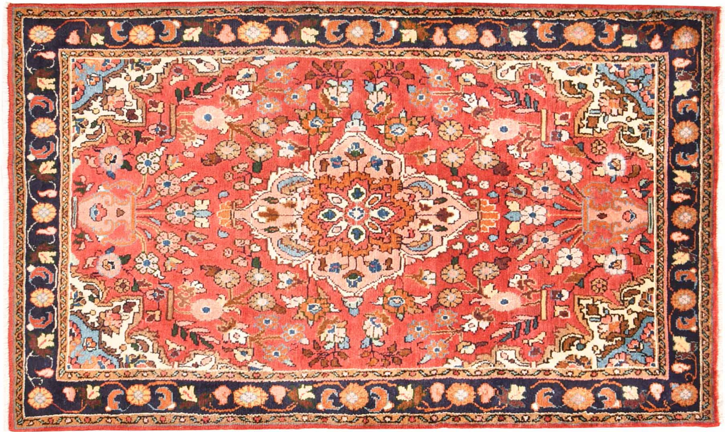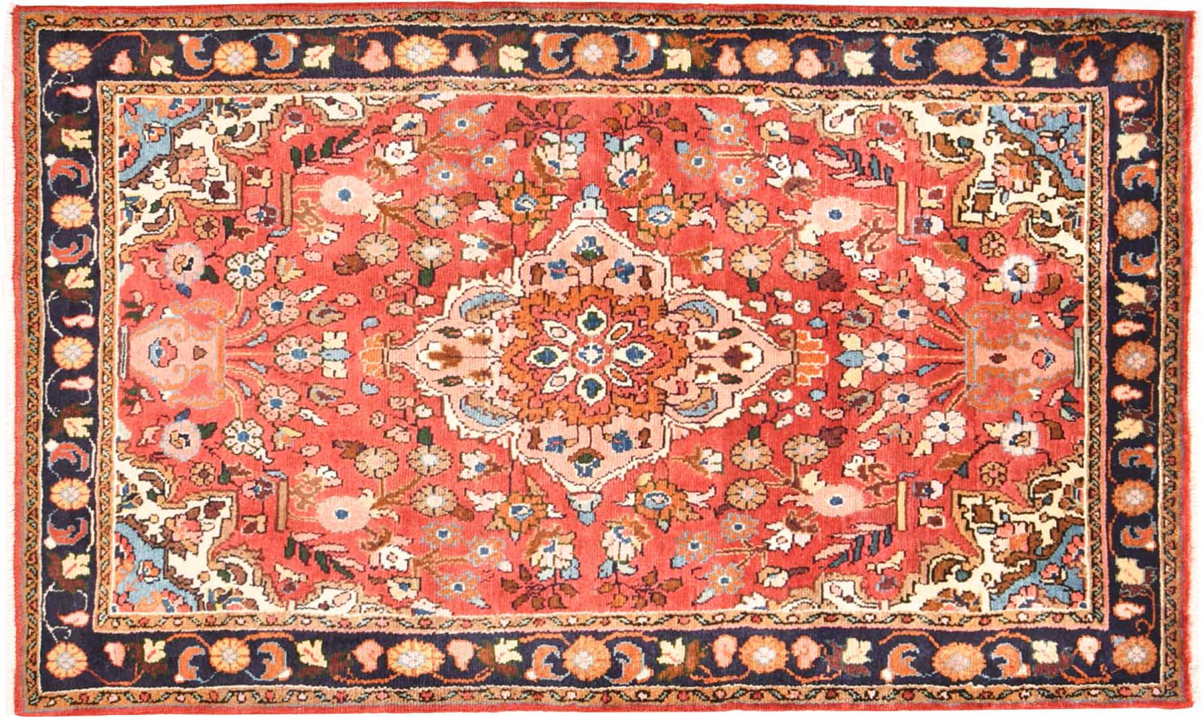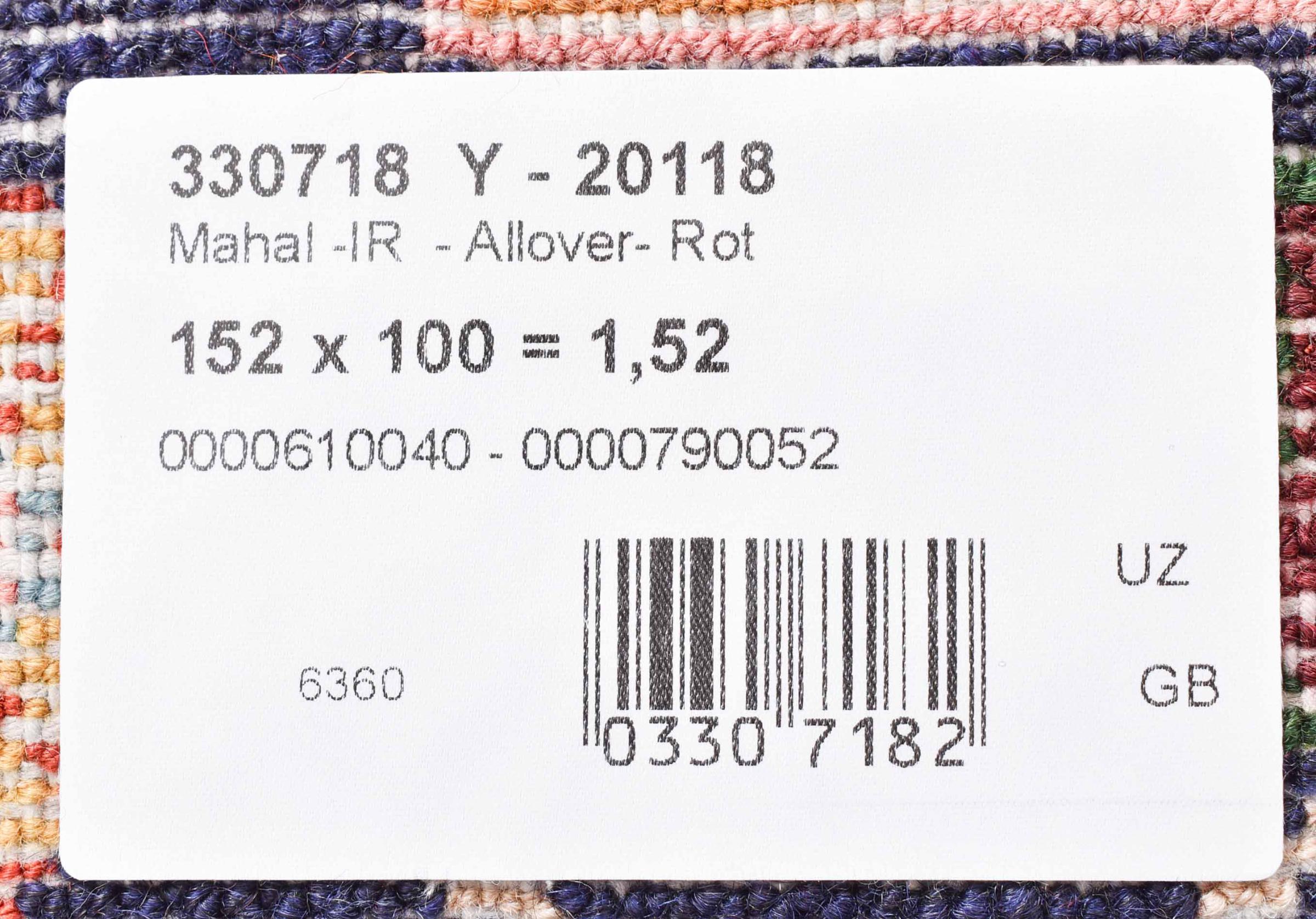 Tapijt ID: 300985003902787 Grootte: 153x99 cm Dikte: ap. 12 mm Knoopdichtheid: 128 000 - 160 000 / m² Verwerking: Handgeknoopte Pool: Hand gesponnen wol Schering: Katoen Oorsprong: Perzië / Iran Leeftijd: Nieuw Gewicht: ap. 5 kg Ook wel bekend als Mahalat Op voorraad: Uniek - Nog maar 1 op voorraad