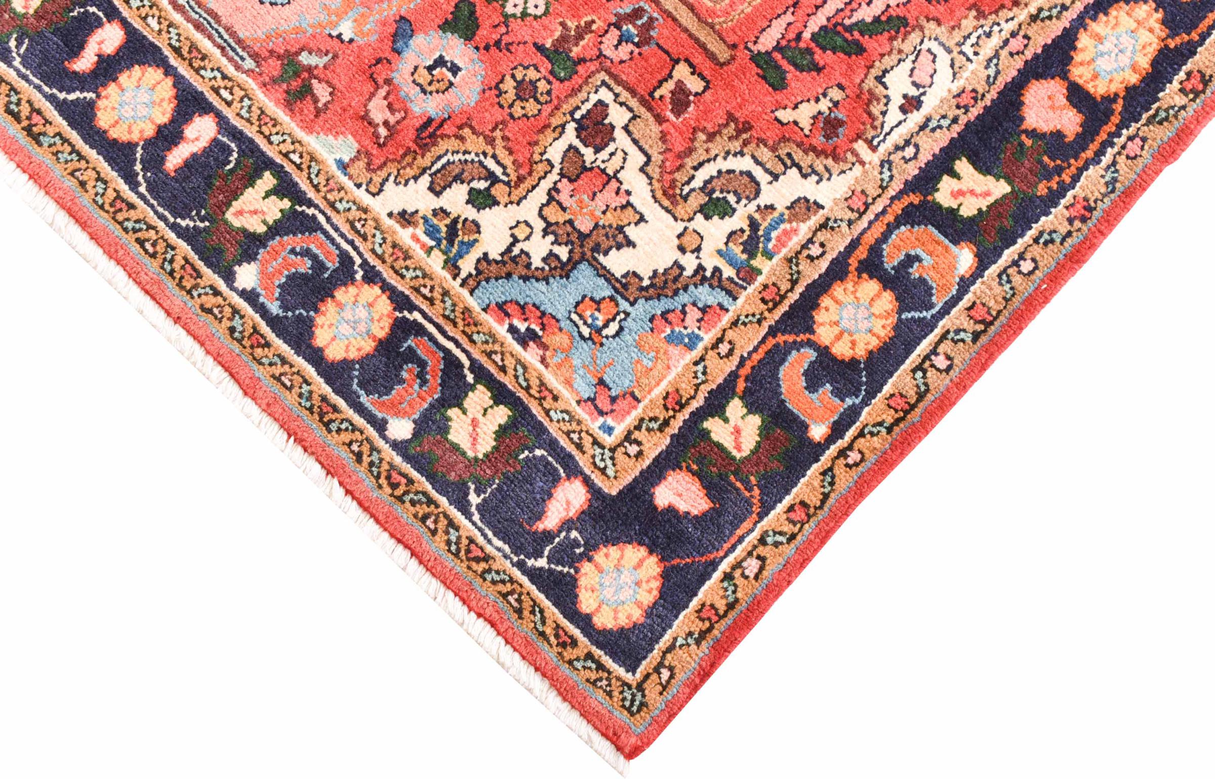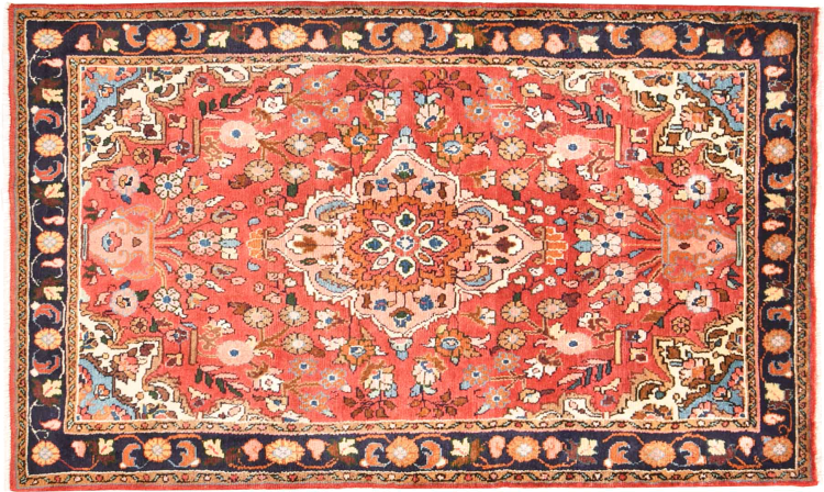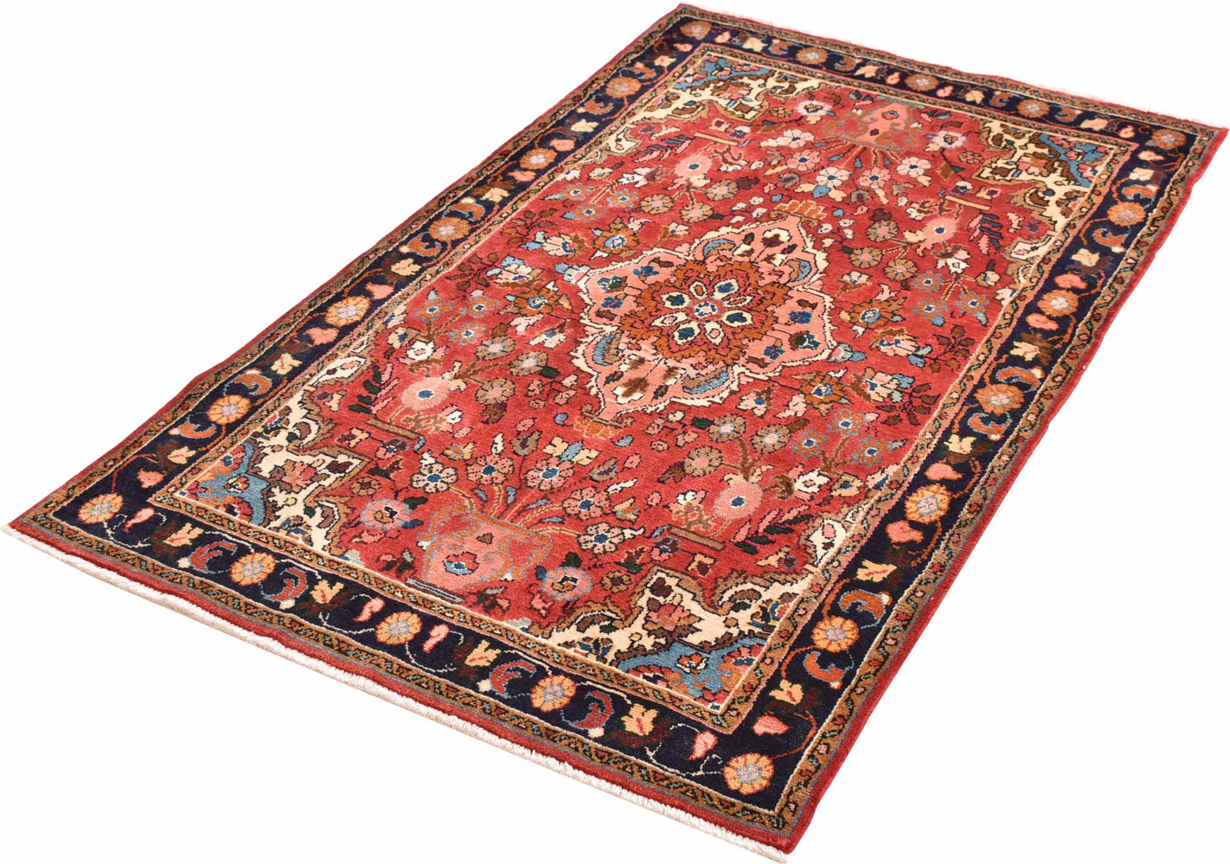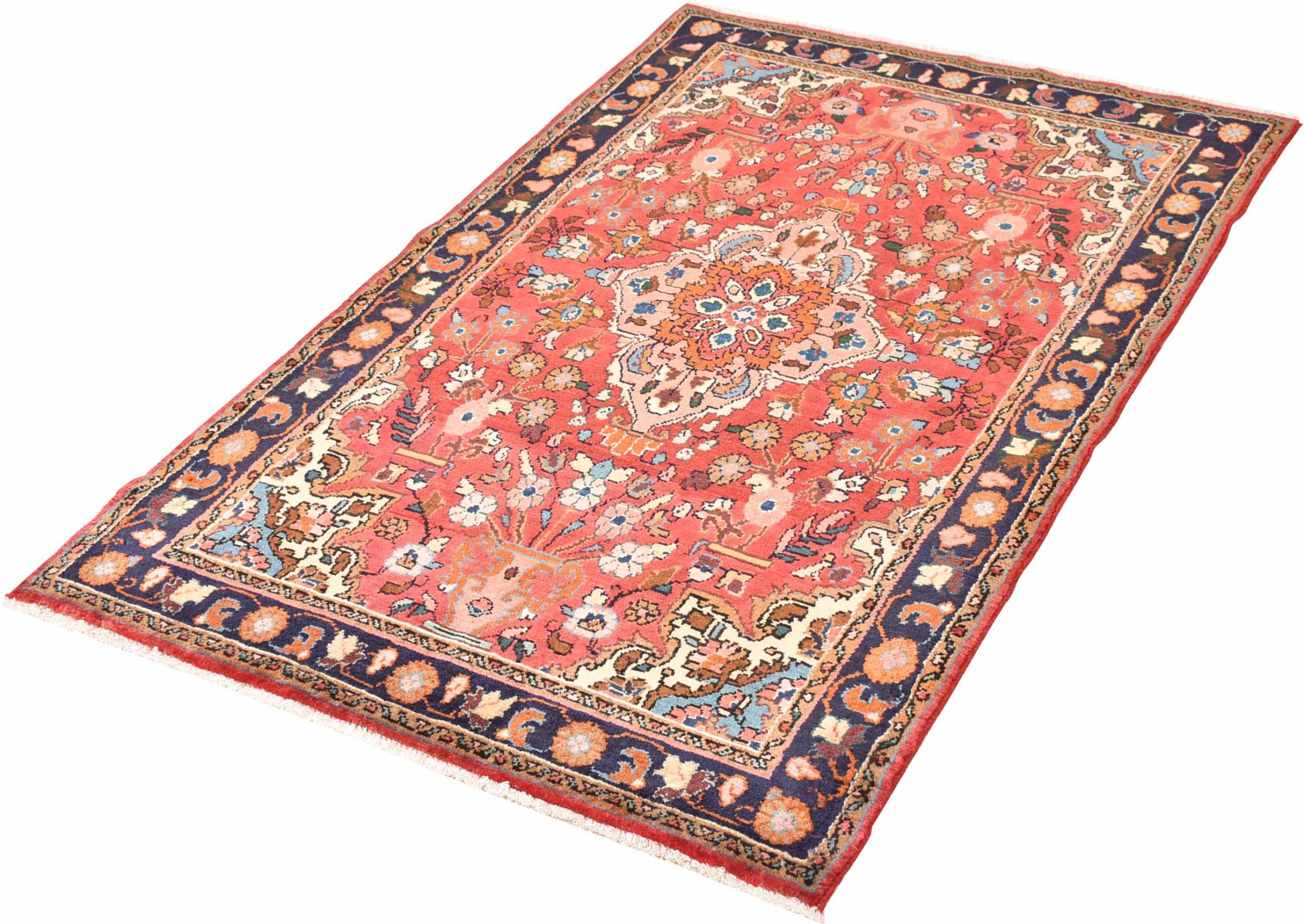 Tapijt ID: 300985003902787 Grootte: 153x99 cm Dikte: ap. 12 mm Knoopdichtheid: 128 000 - 160 000 / m² Verwerking: Handgeknoopte Pool: Hand gesponnen wol Schering: Katoen Oorsprong: Perzië / Iran Leeftijd: Nieuw Gewicht: ap. 5 kg Ook wel bekend als Mahalat Op voorraad: Uniek - Nog maar 1 op voorraad