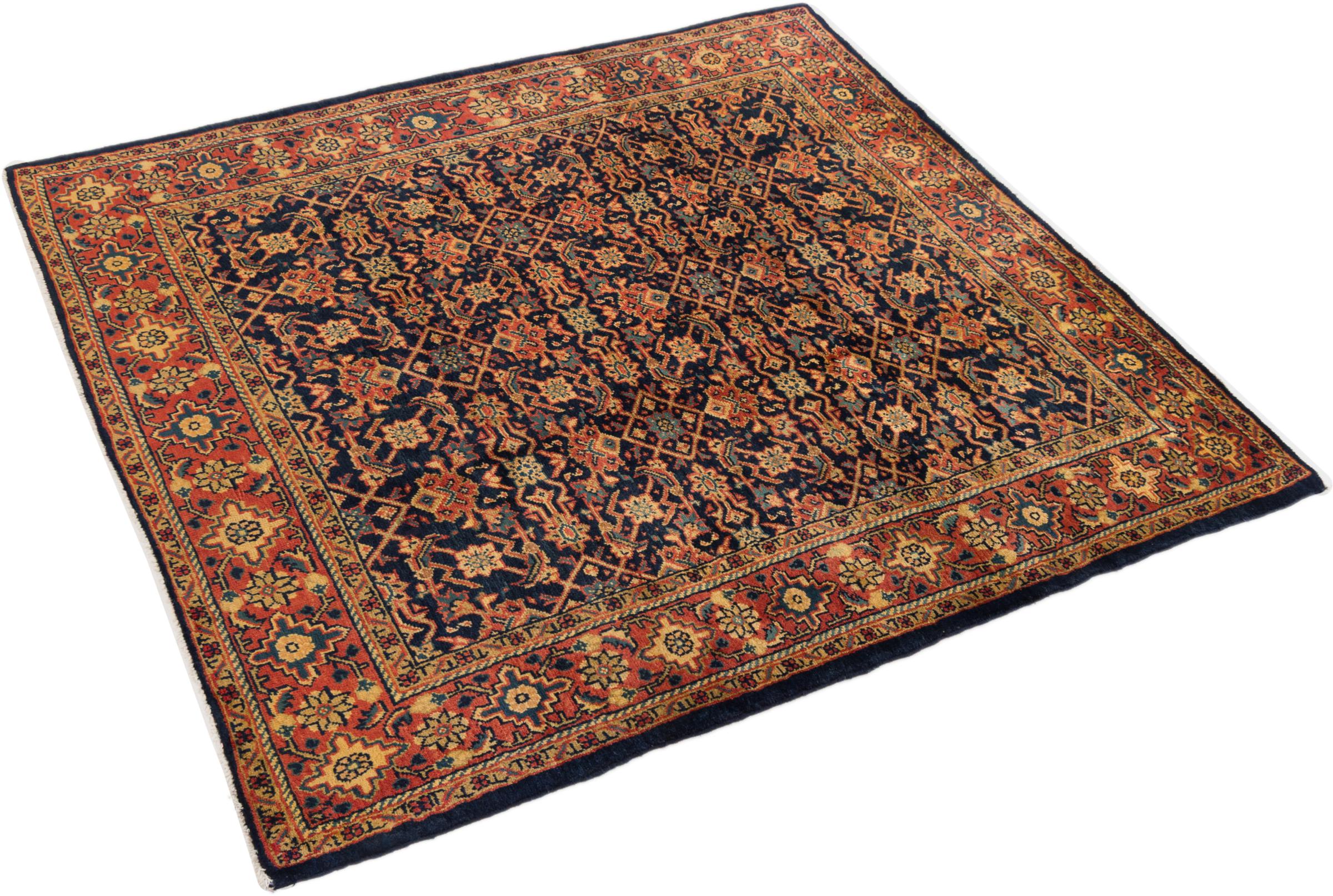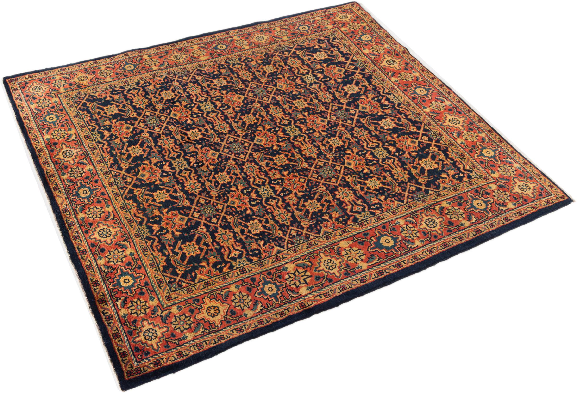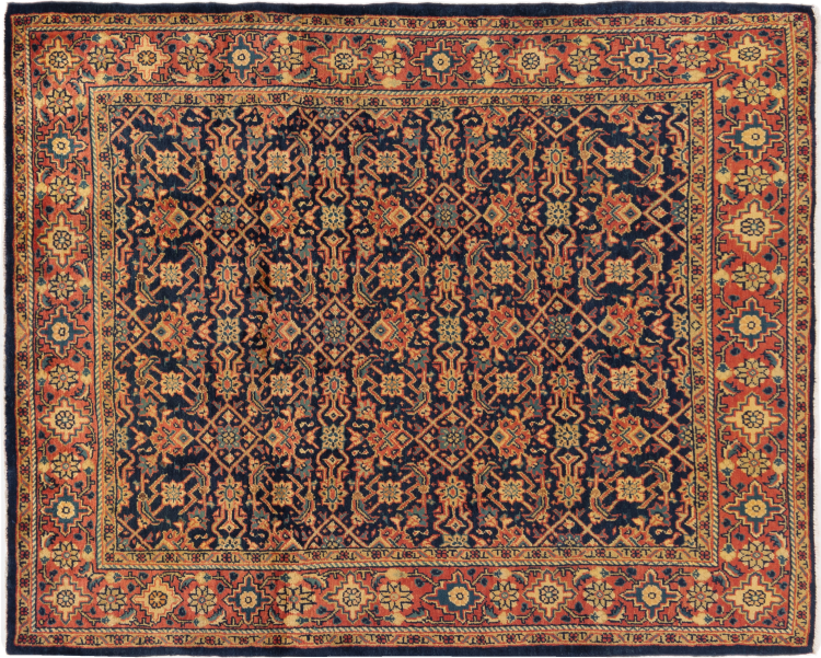 Tapijt ID: 296273005614 Grootte: 213x173 cm Dikte: ap. 12 mm Knoopdichtheid: 72 000 - 90 000 / m² Verwerking: Handgeknoopte Pool: Hand gesponnen wol Schering: Katoen Oorsprong: Perzië / Iran Leeftijd: Oud/Semi antiek, boven 50 jaar Gewicht: ap. 13 kg Ook wel bekend als Mahalat Op voorraad: Uniek - Nog maar 1 op voorraad