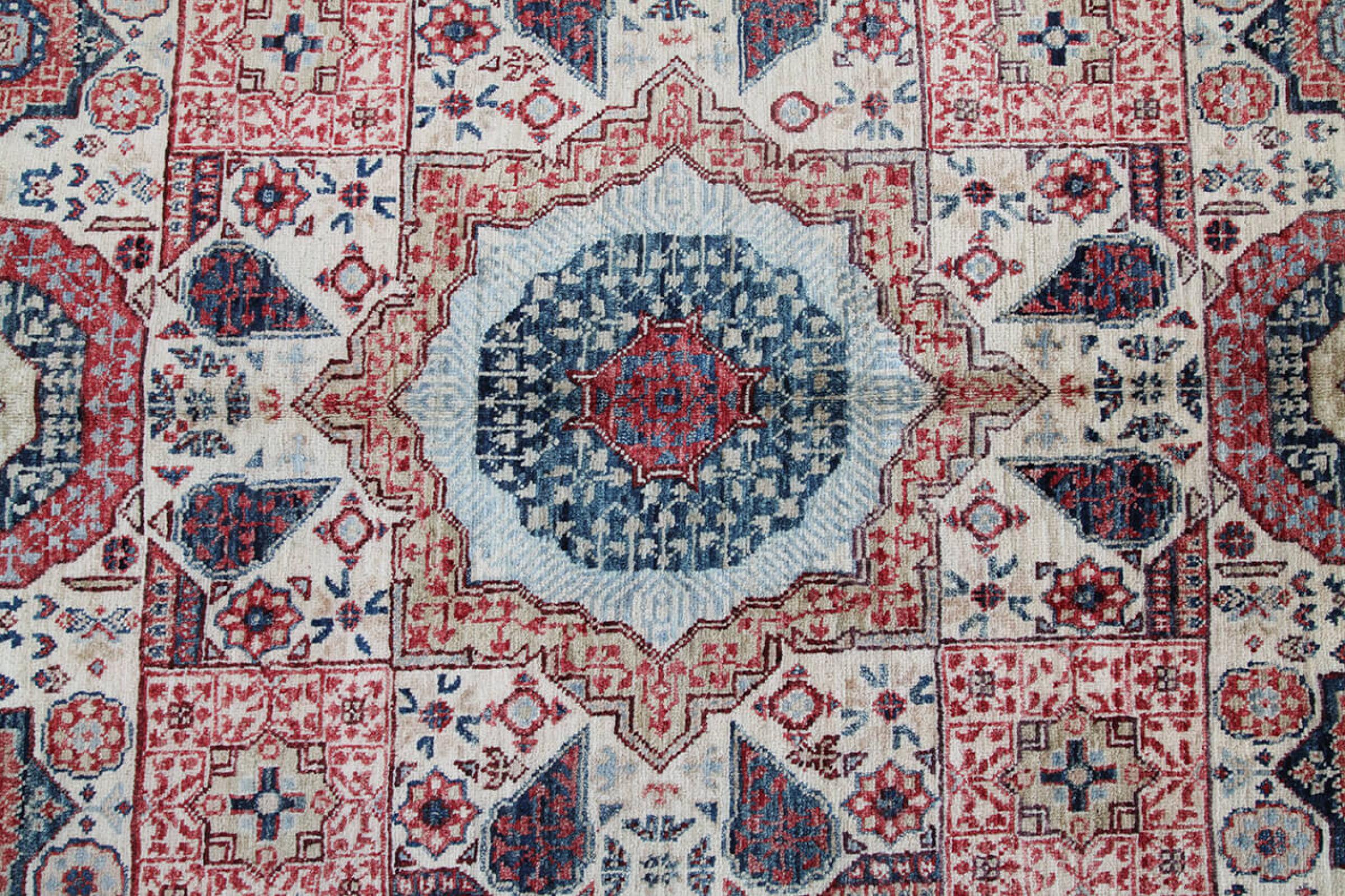 Deze Mamluk is met de hand geknoopt en maakt indruk met zijn opwindende elegantie. Het ontwerp is extravagant en uniek, maar niet erg bekend. De kleuren van het oosterse tapijt zijn modieus gecombineerd en de unieke motieven brengen gegarandeerd leven en bewondering in uw kamer.