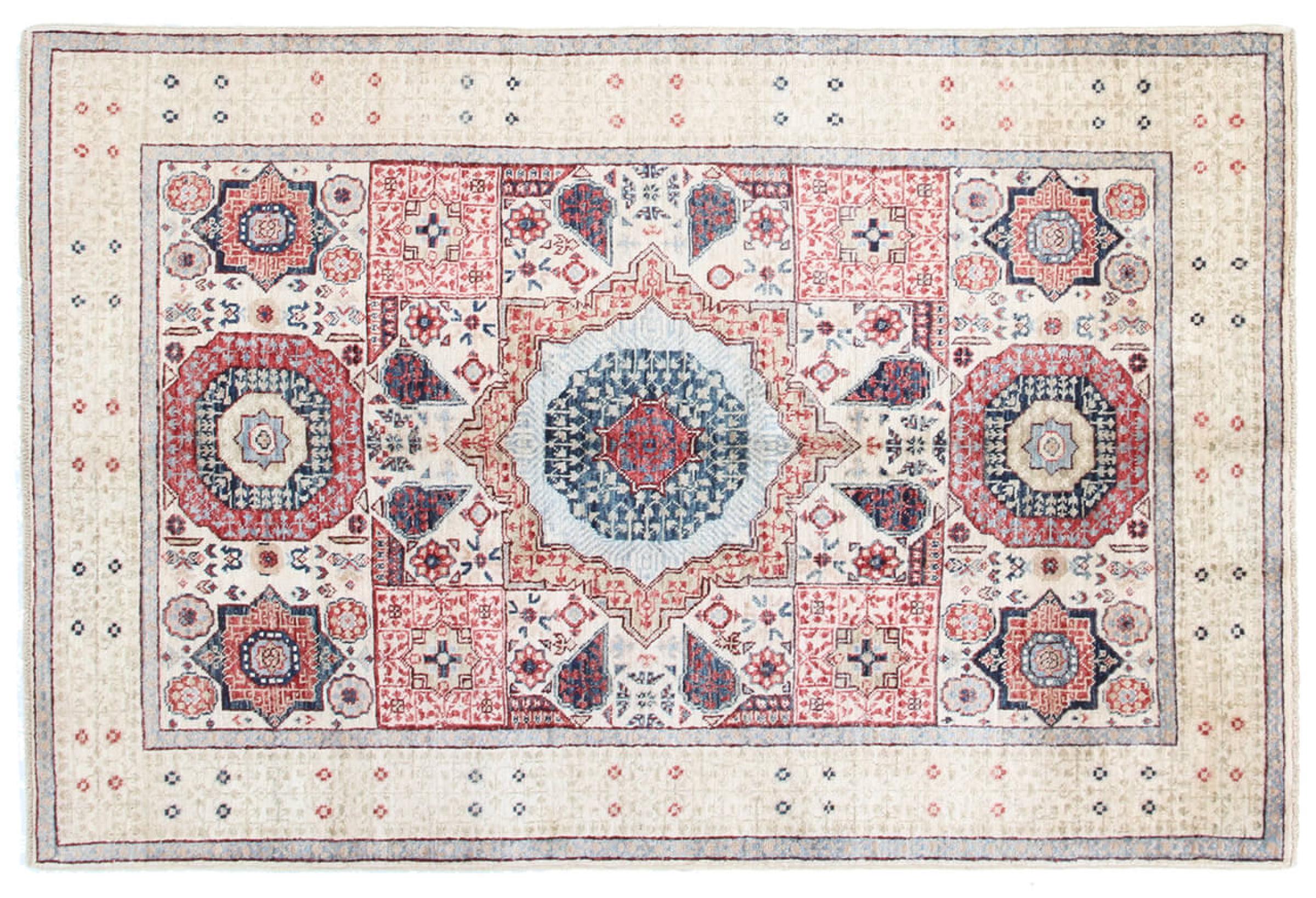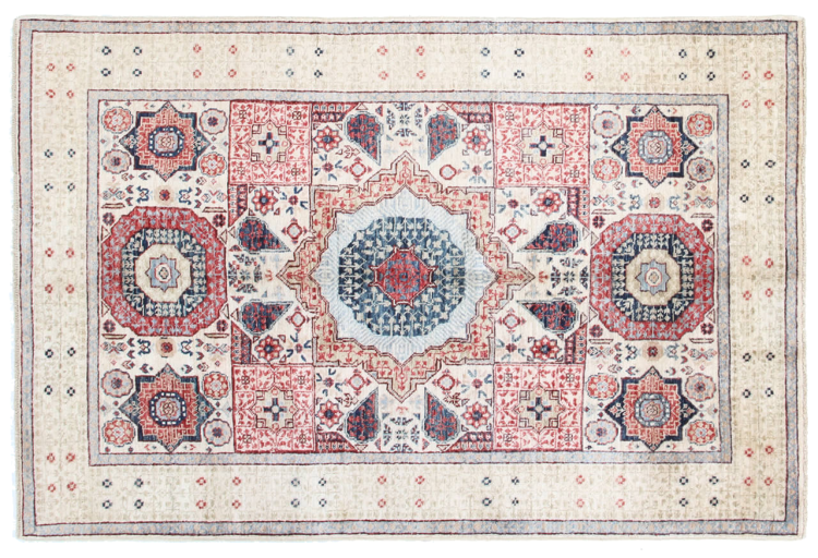 Tapijt ID: 290807009815138 Grootte: 179x118 cm Dikte: ap. 6 mm Knoopdichtheid: 200 000 - 250 000 / m² Verwerking: Handgeknoopte Pool: Hand gesponnen wol Schering: Katoen Oorsprong: Pakistan Leeftijd: Nieuw Gewicht: ap. 6 kg Op voorraad: Uniek - Nog maar 1 op voorraad