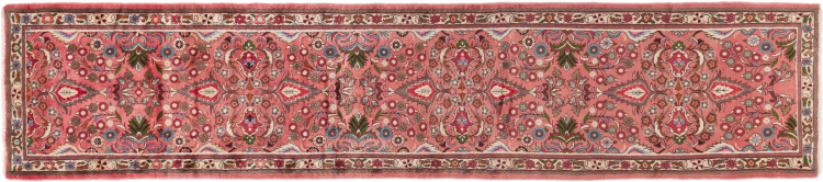 Tapijt ID: 296128001753 Grootte: 376x78 cm Dikte: ap. 12 mm Knoopdichtheid: 320 000 - 360 000 / m² Verwerking: Handgeknoopte Pool: Hand gesponnen wol Schering: Katoen Oorsprong: Perzië / Iran Leeftijd: Nieuw Gewicht: ap. 10 kg Ook wel bekend als Meriban Op voorraad: Uniek - Nog maar 1 op voorraad