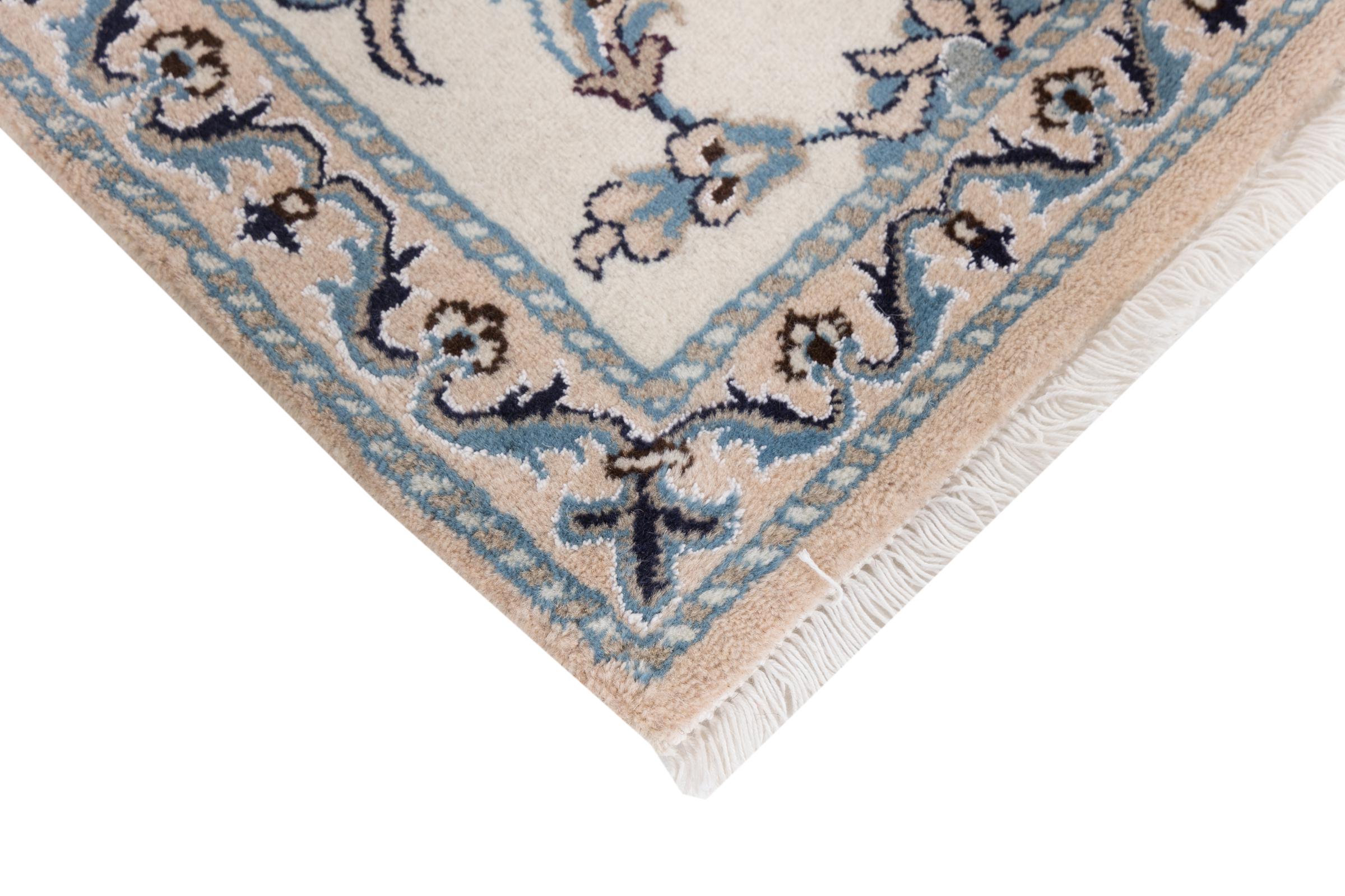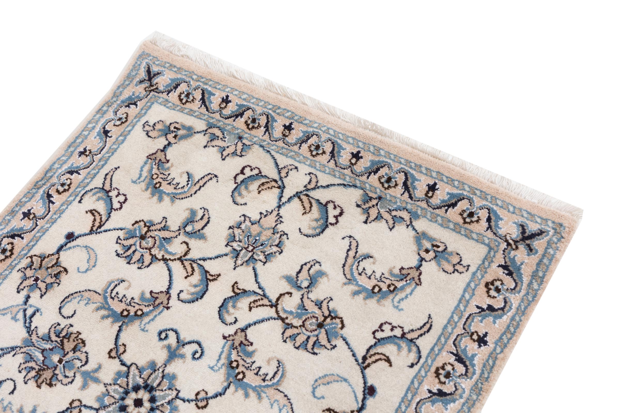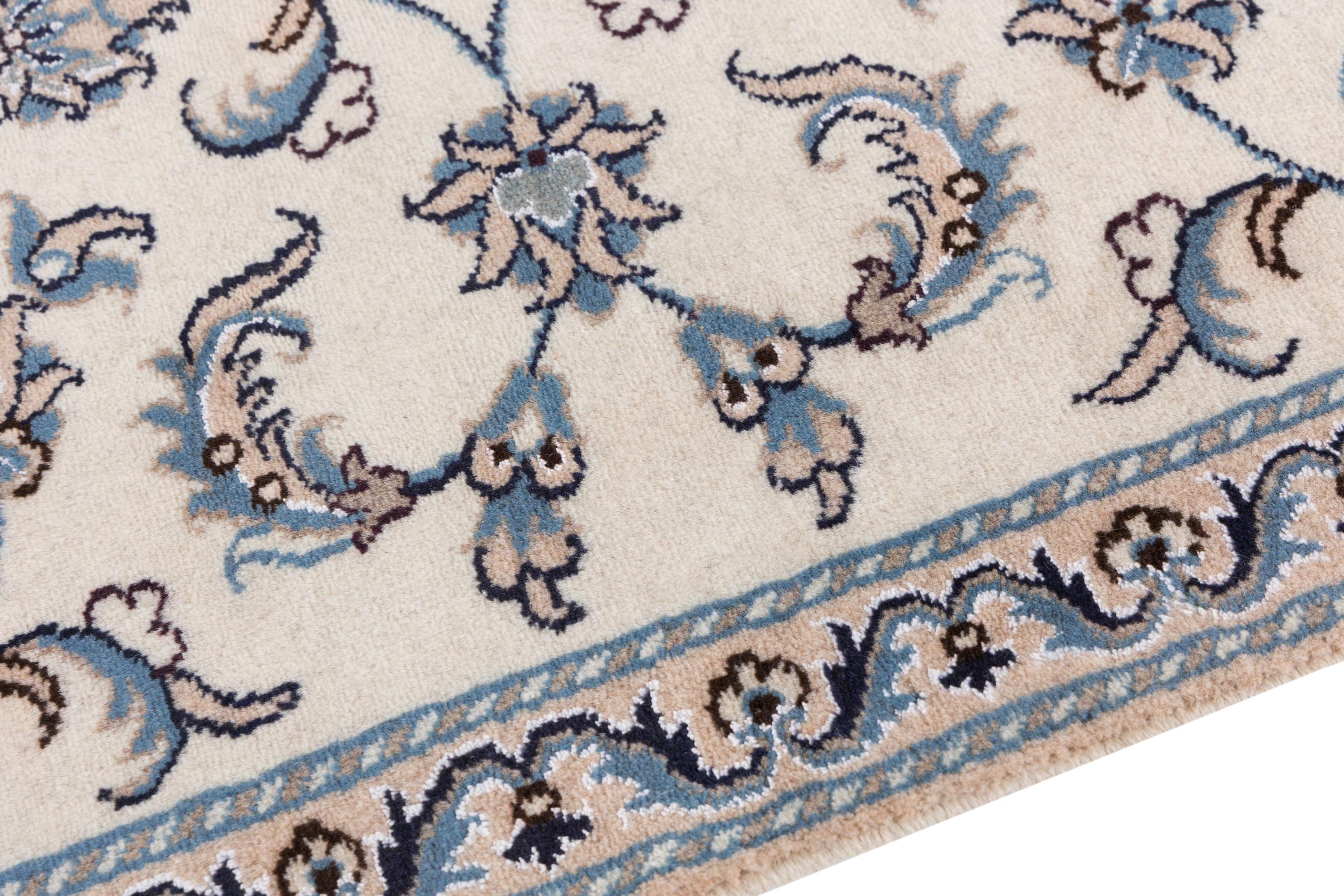 Dit Nain tapijt is geclassificeerd als 12La. Het heeft een elegante en verfijnde look met zijn typische Nain-kleuring. Dit Perzische tapijt werd met de hand geknoopt in de stad Nain, gelegen aan het westelijke uiteinde van de Dasht-e-Kavir woestijn, uit wol van hoge kwaliteit en natuurlijke zijde. Met zijn grootte van 12La is het niet zo fijn gedetailleerd met ornamenten als een Nain 9La of 6La.