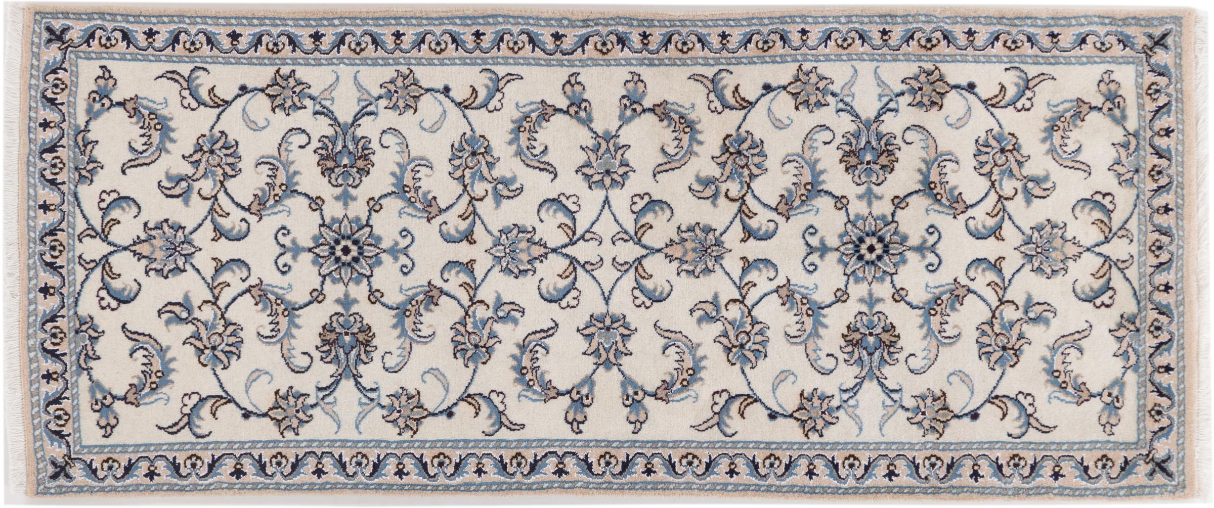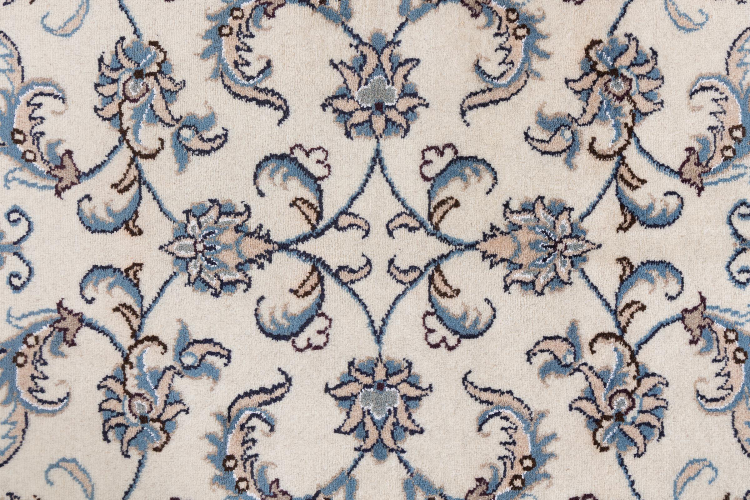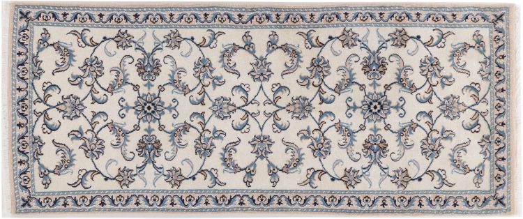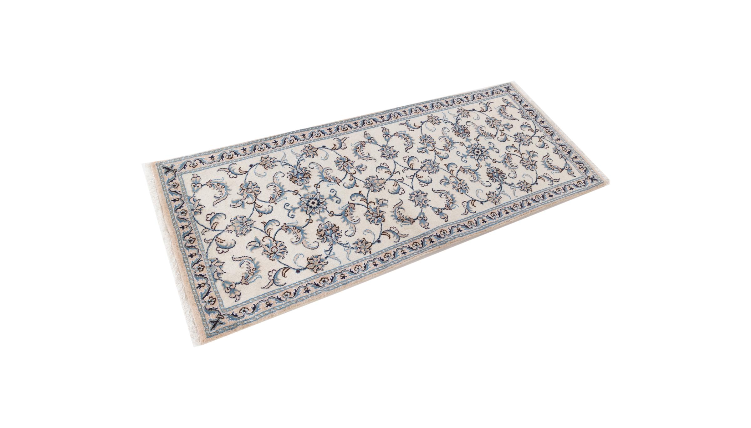 Dit Nain tapijt is geclassificeerd als 12La. Het heeft een elegante en verfijnde look met zijn typische Nain-kleuring. Dit Perzische tapijt werd met de hand geknoopt in de stad Nain, gelegen aan het westelijke uiteinde van de Dasht-e-Kavir woestijn, uit wol van hoge kwaliteit en natuurlijke zijde. Met zijn grootte van 12La is het niet zo fijn gedetailleerd met ornamenten als een Nain 9La of 6La.