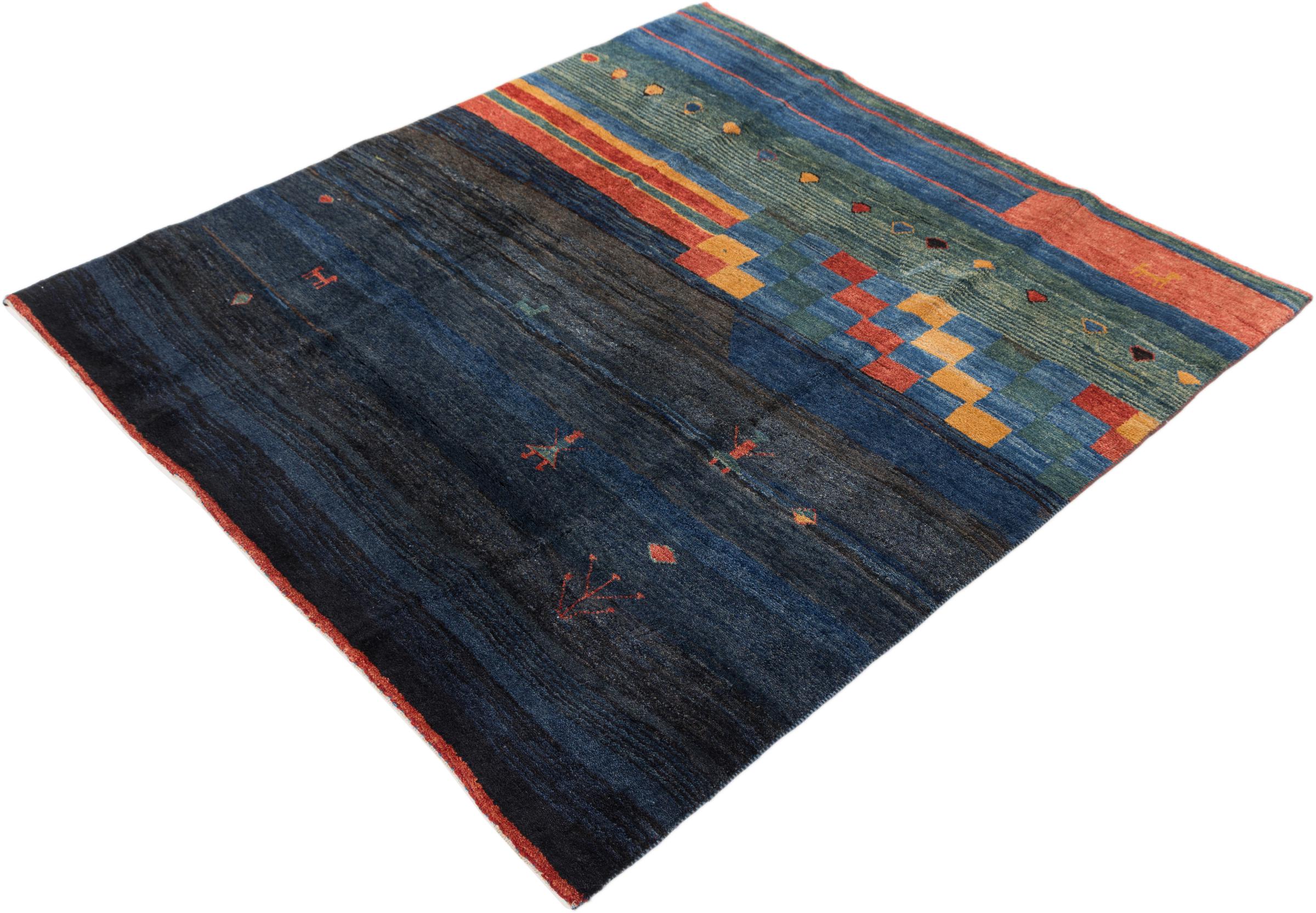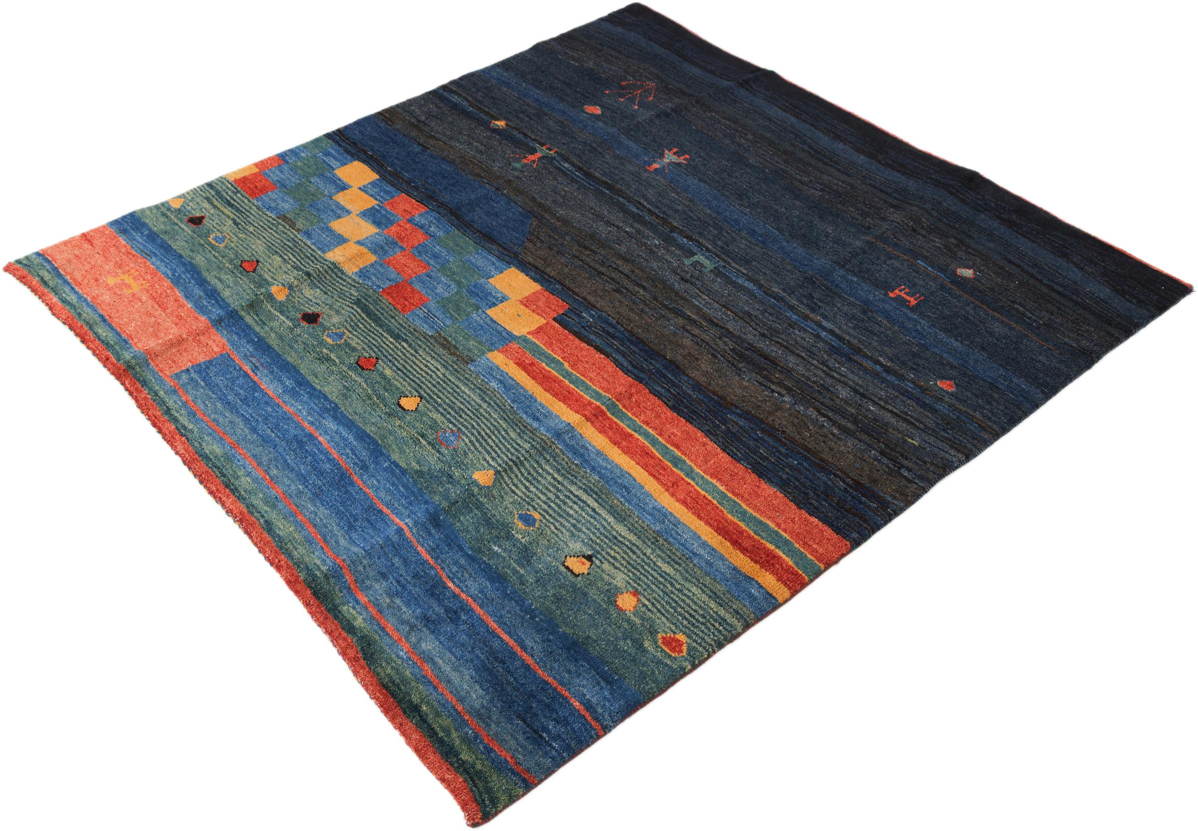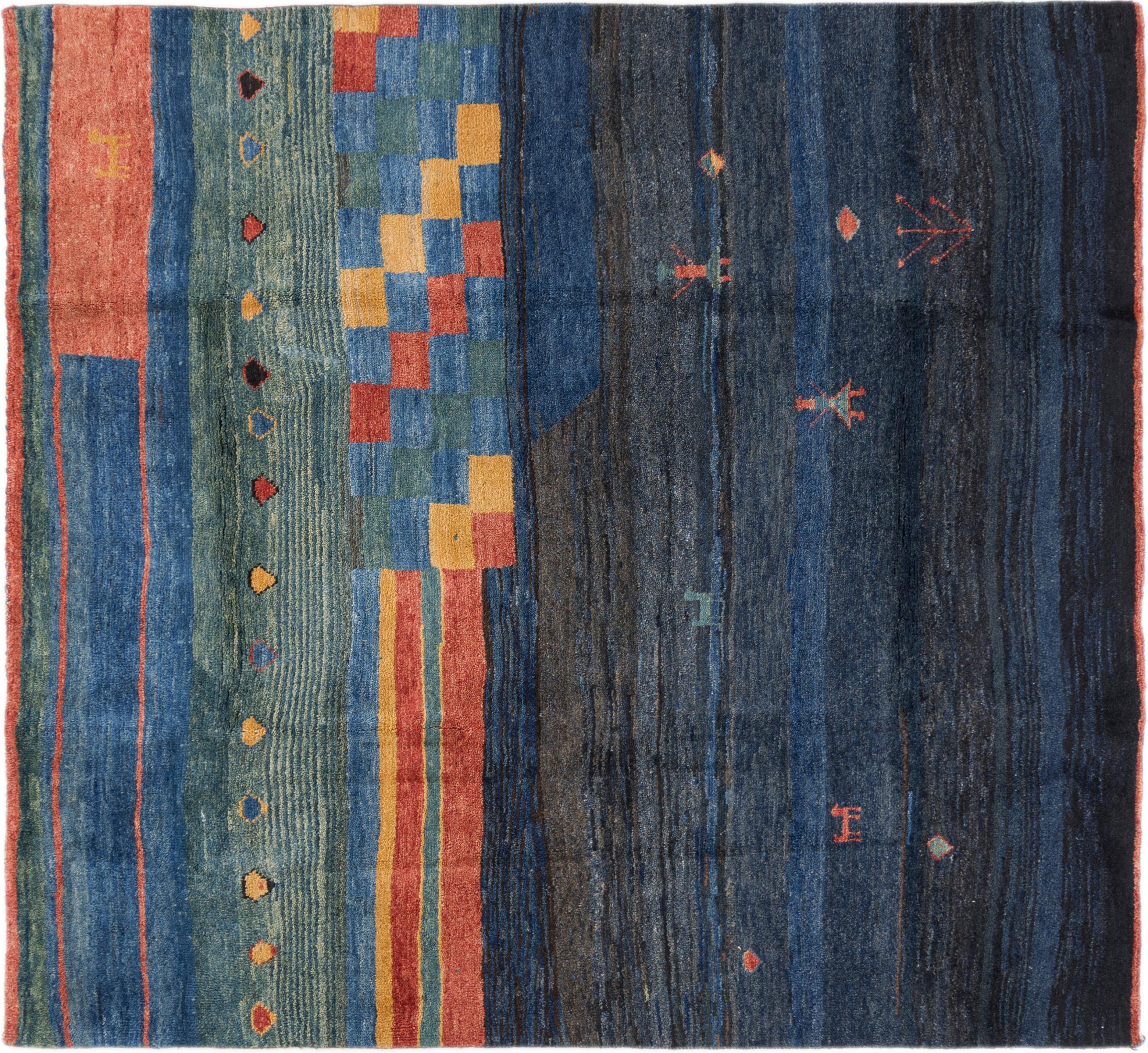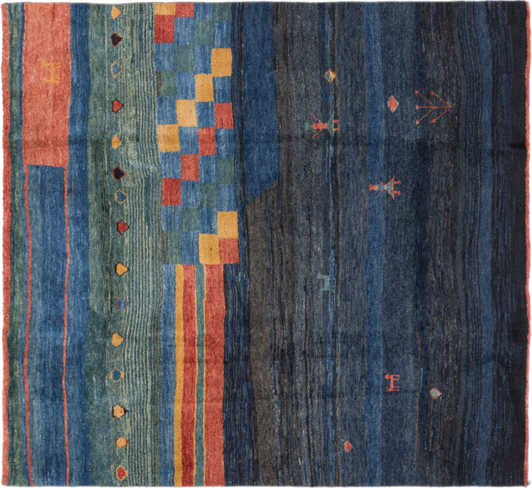 Tapijt ID: 296231007694 Grootte: 182x170 cm Dikte: ap. 18 mm Knoopdichtheid: 72 000 - 90 000 / m² Verwerking: Handgeknoopte Pool: Hand gesponnen wol Schering: Wol Oorsprong: Perzië / Iran Leeftijd: Nieuw Gewicht: ap. 15 kg Ook wel bekend als Gabbe, Ghabbeh Op voorraad: Uniek - Nog maar 1 op voorraad