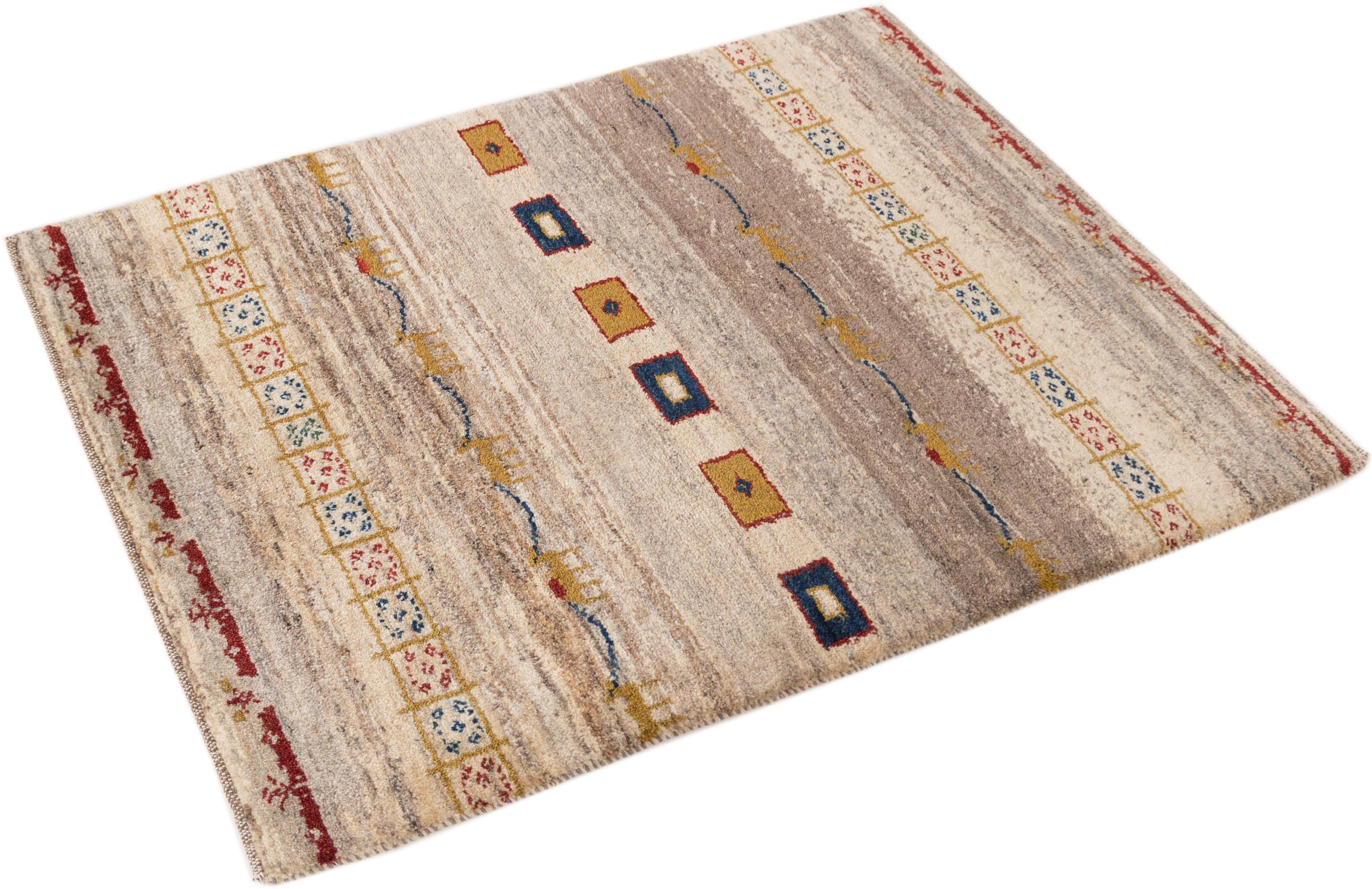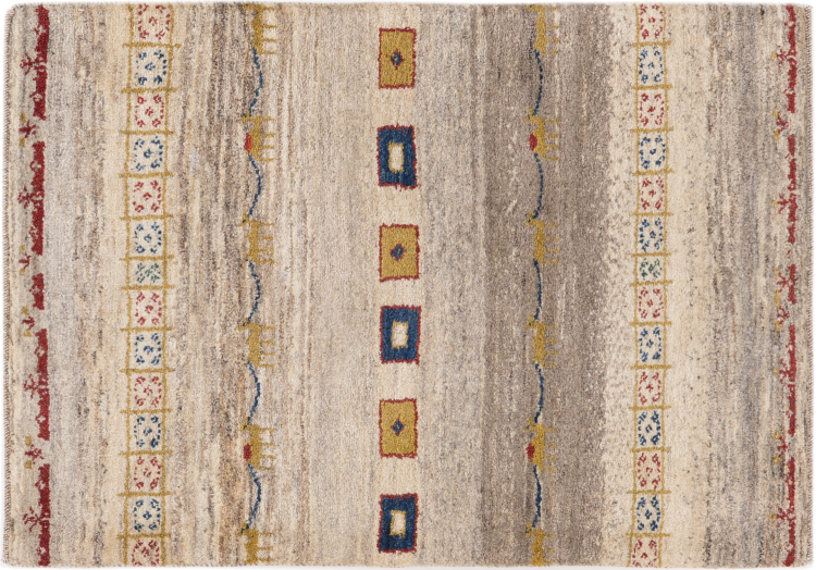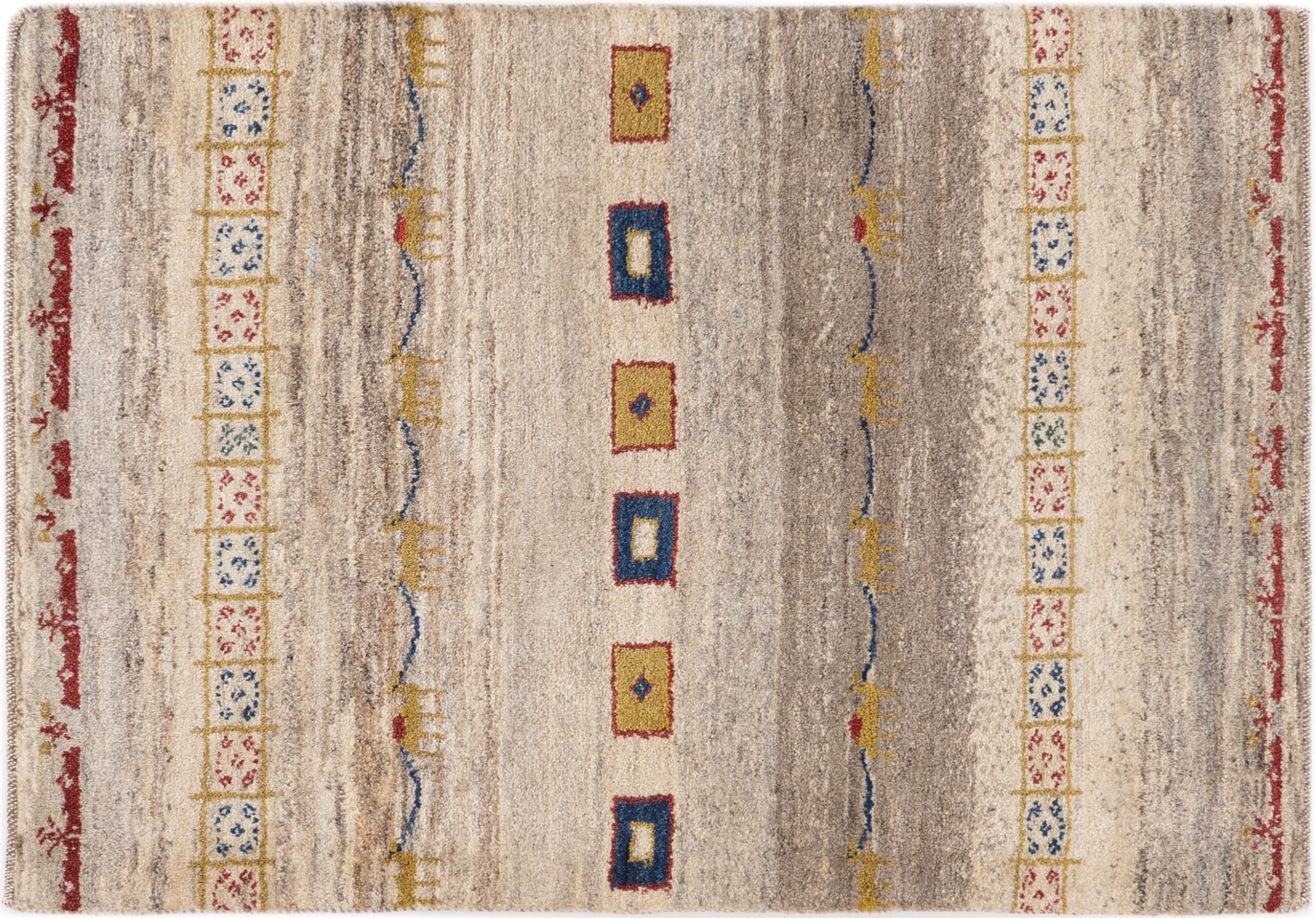 Tapijt ID: 2988060010301 Grootte: 120x84 cm Dikte: ap. 18 mm Knoopdichtheid: 32 000 - 40 000 / m² Verwerking: Handgeknoopte Pool: Hand gesponnen wol Schering: Wol Oorsprong: Perzië / Iran Leeftijd: Nieuw Gewicht: ap. 5 kg Ook wel bekend als Gabbe, Ghabbeh Op voorraad: Uniek - Nog maar 1 op voorraad