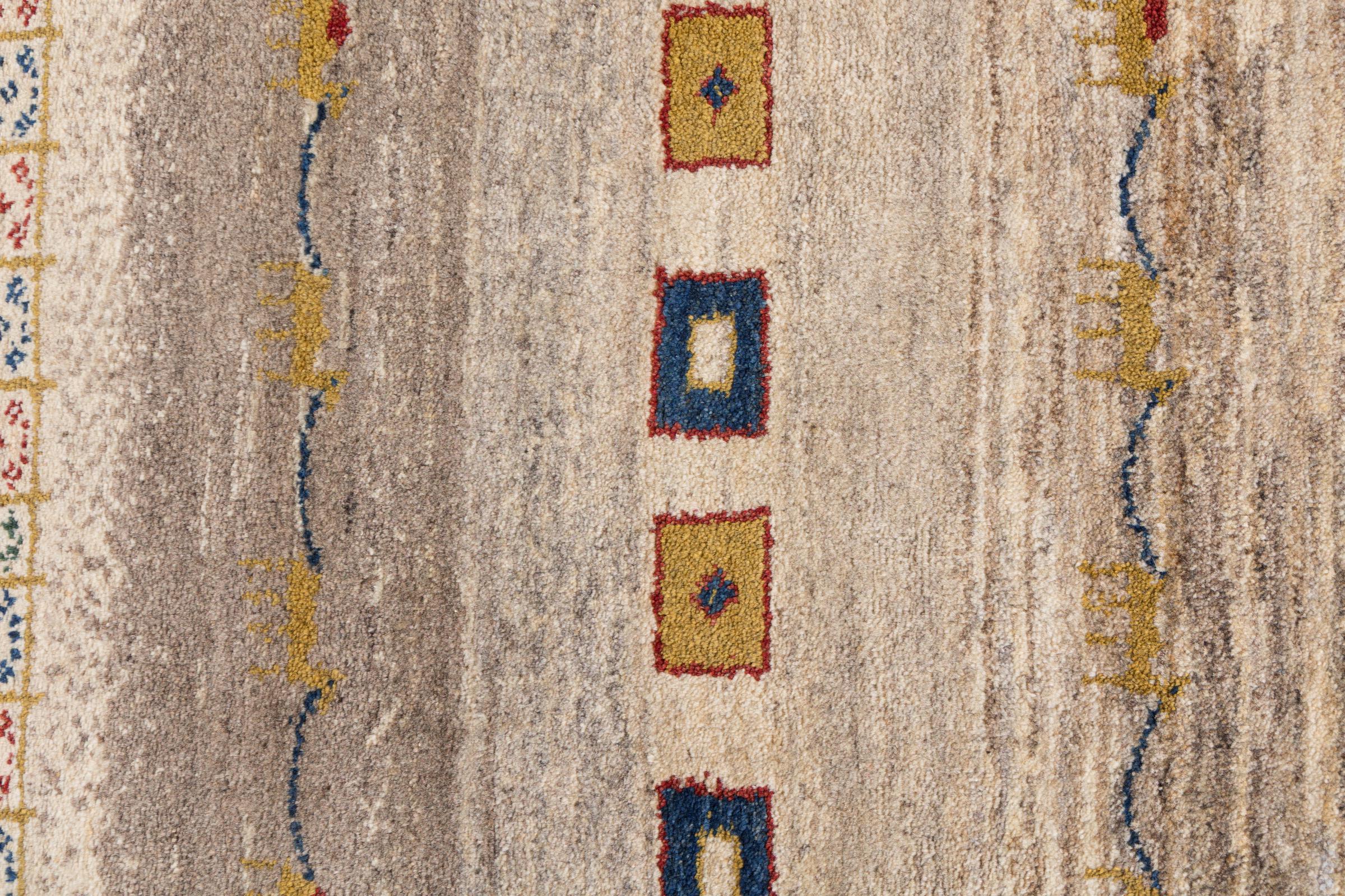 Deze handgeknoopte Perzische Gabbeh valt meteen op door zijn hoogwaardige en zeer robuuste pool. Het werd met de hand geknoopt door Ghashghai-nomaden in de provincie Fars in het zuiden van Perzië van de beste lokale schapenwol. Voor het verven van de wol worden natuurlijke plantaardige kleurstoffen gebruikt. Hierdoor is het een zeer waardevolle toevoeging aan de kinderkamer. Deze Perzische Gabbeh vertegenwoordigt de hoogste klasse Gabbeh-tapijten.