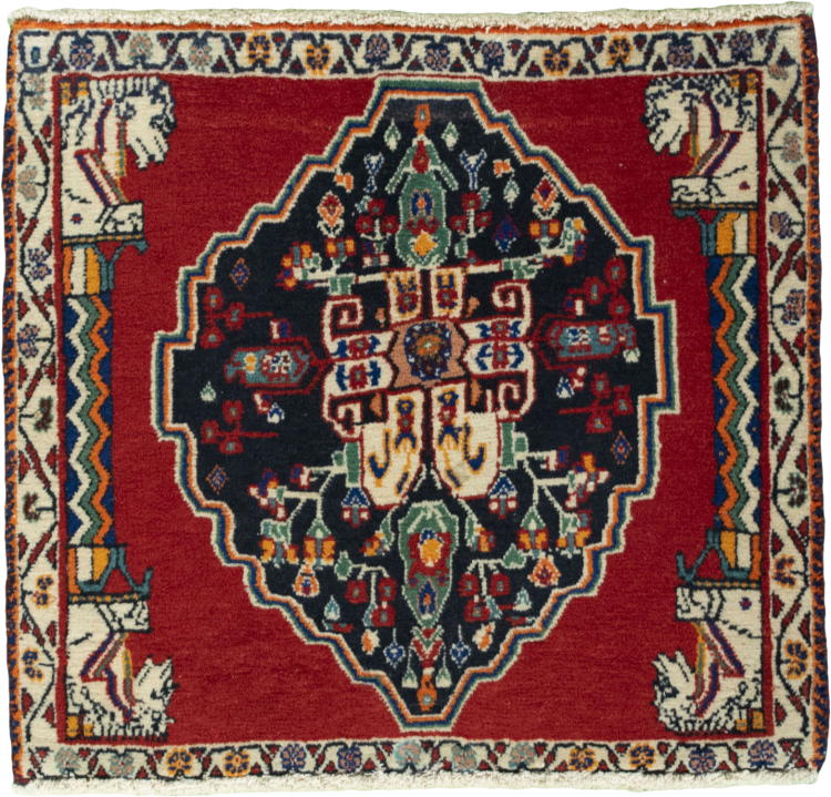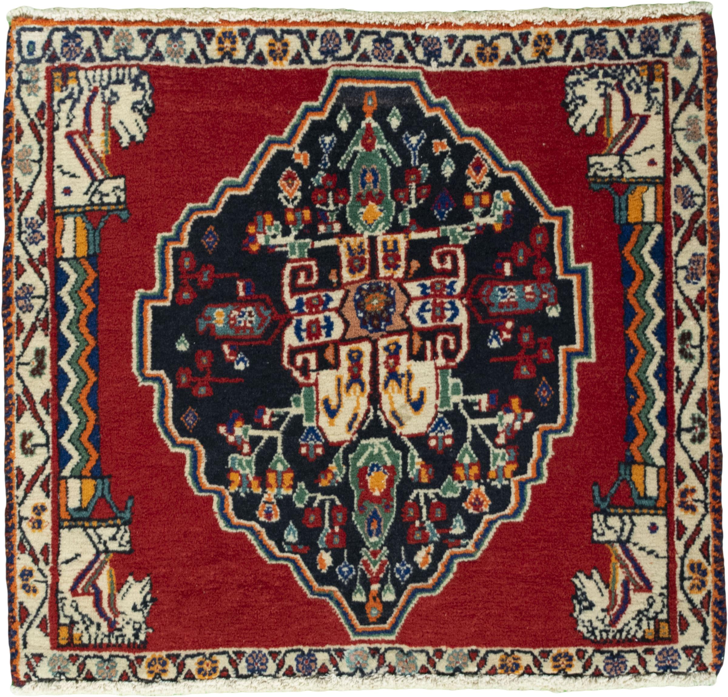 Tapijt ID: 285604003314257 Grootte: 56x63 cm Dikte: ap. 10 mm Knoopdichtheid: 96 000 - 120 000 / m² Verwerking: Handgeknoopte Pool: Hand gesponnen wol Schering: Katoen Oorsprong: Perzië / Iran Leeftijd: Nieuw Gewicht: ap. 1 kg Op voorraad: Uniek - Nog maar 1 op voorraad
