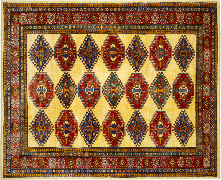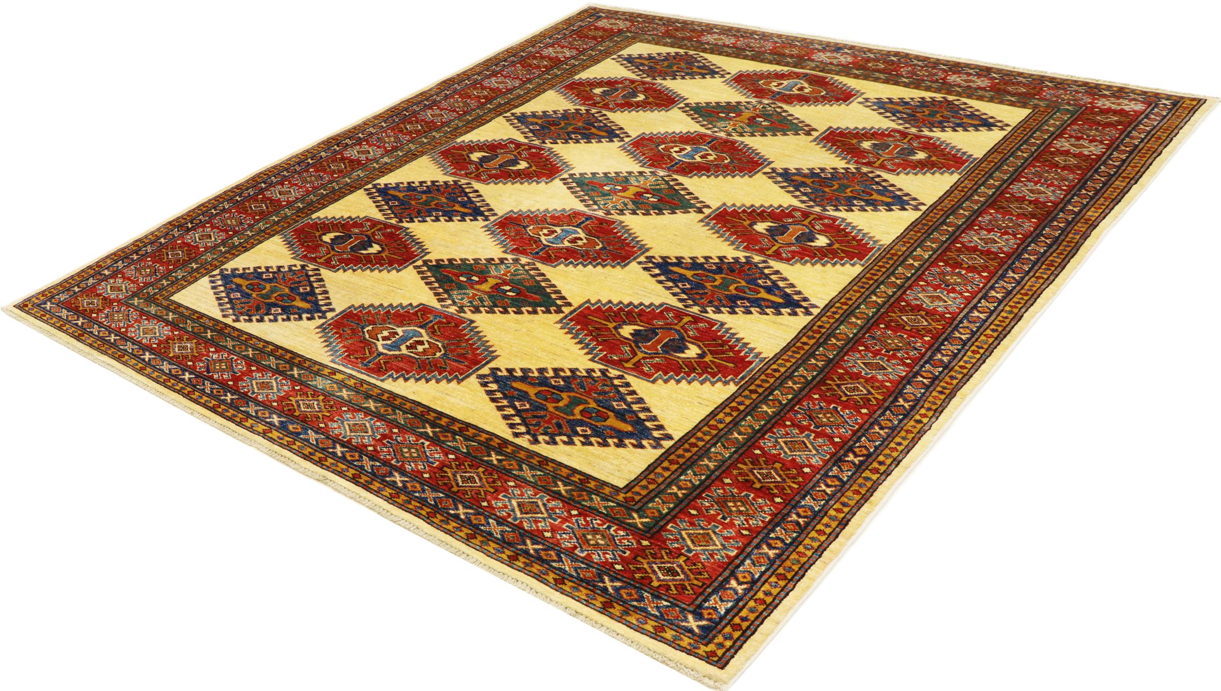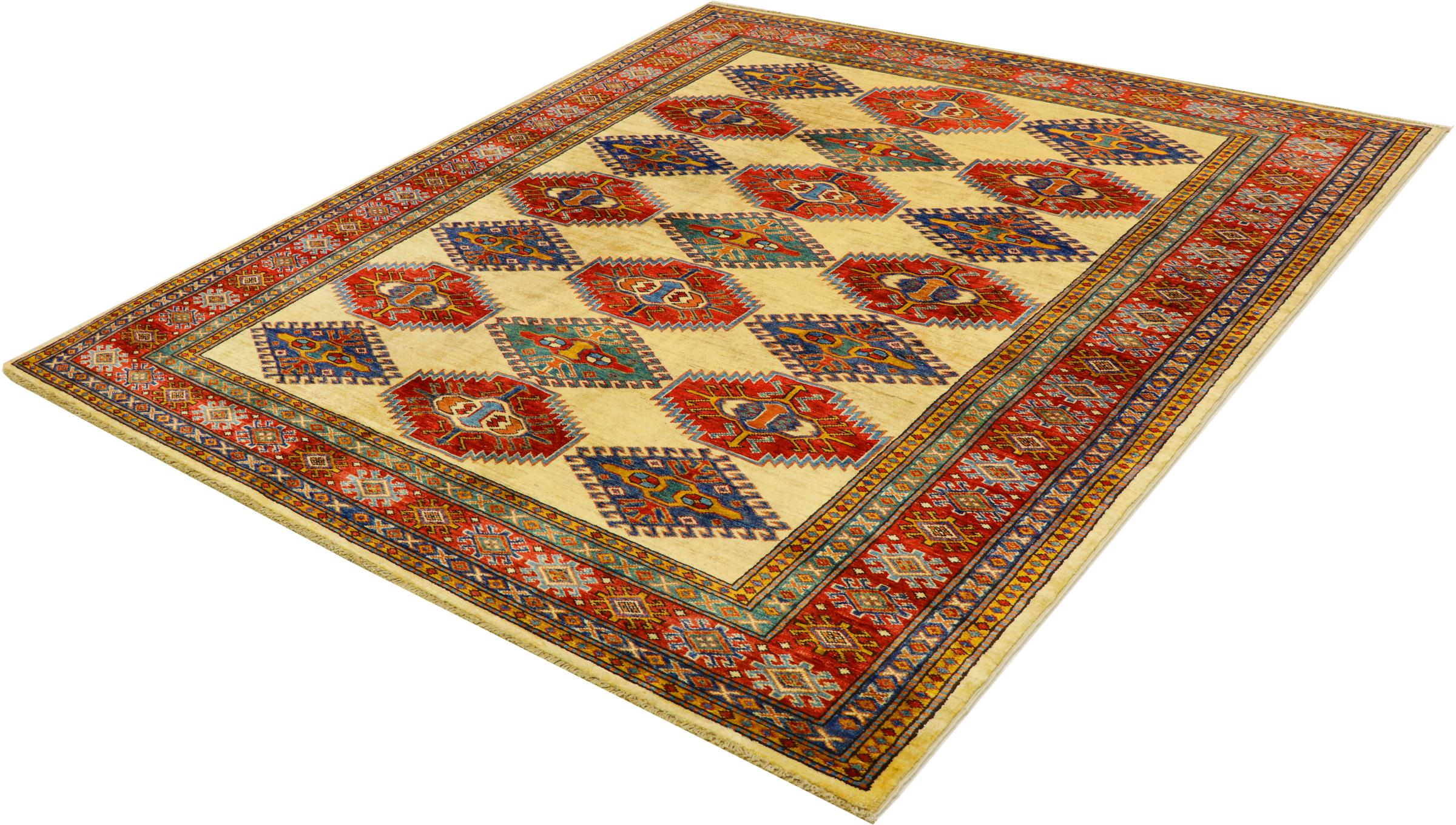 Kazak-vloerkleden zijn duurzame, levendige wollen vloerkleden die bekend staan om hun unieke geometrische patronen, uitgebalanceerde kleuren en uitzonderlijk vakmanschap. Ze zullen een boeiende en cultureel rijke sfeer in uw ruimte creëren. Oorspronkelijk afkomstig uit de Kaukasus en een van de oudste soorten tapijten, worden ze nu voornamelijk gemaakt door Kazachen in Afghanistan en Pakistan. Een antiek Kazachs tapijt kan zeer waardevol zijn voor verzamelaars.