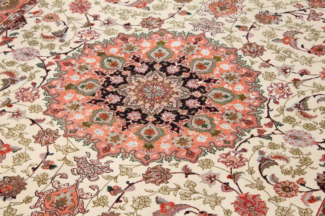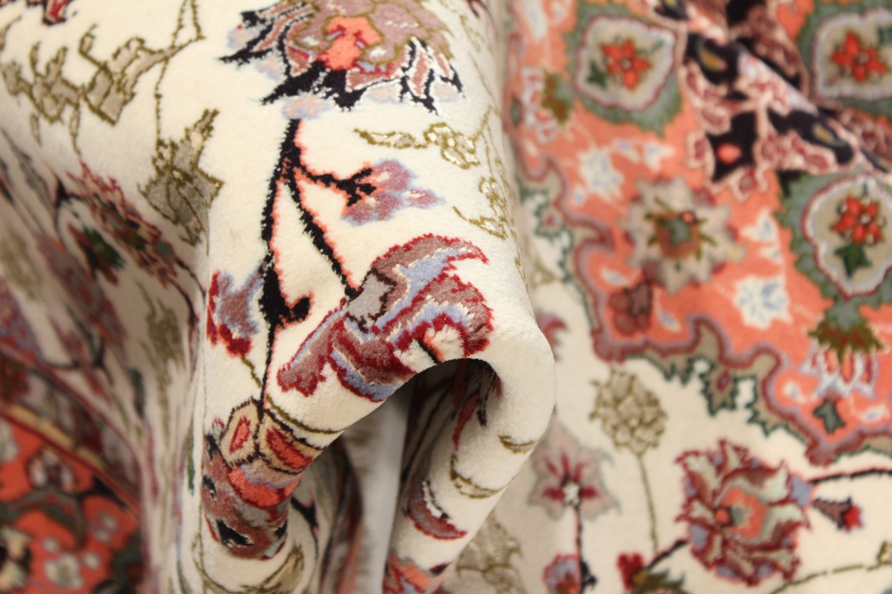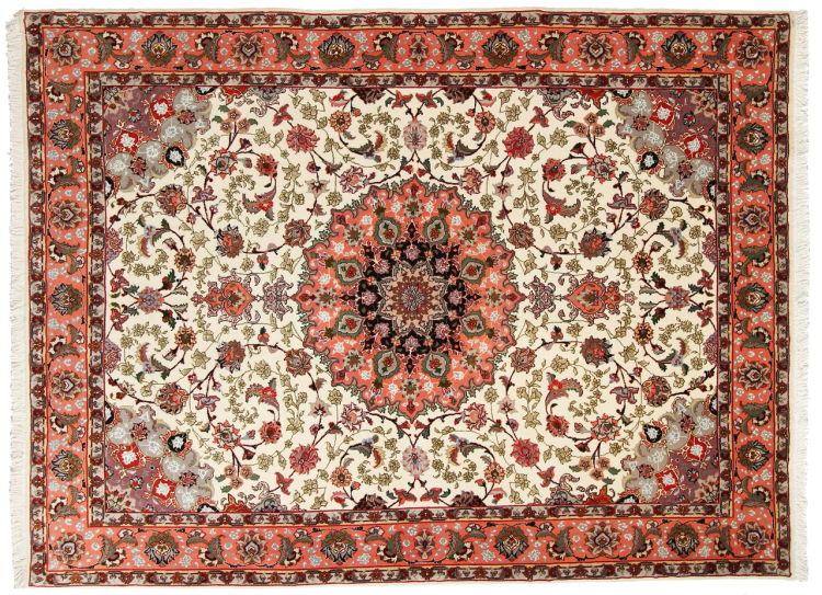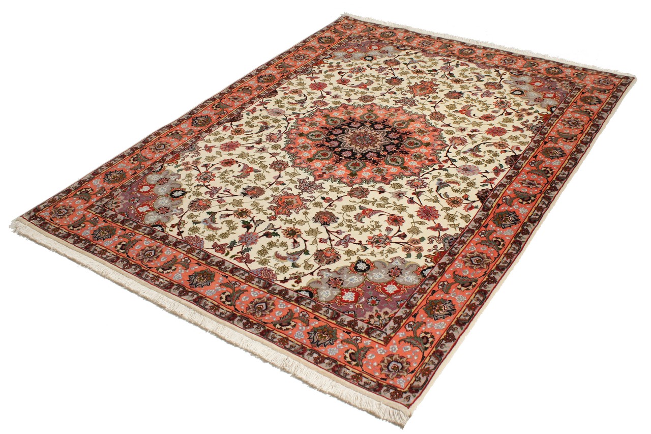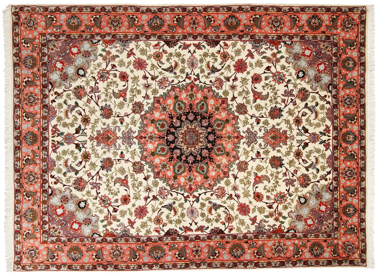 Tapijt ID: 76220023932 Grootte: 203x150 cm Dikte: ap. 7 mm Knoopdichtheid: 450 000 - 500 000 / m² Verwerking: Handgeknoopte Pool: Wol met zijde Schering: Katoen Oorsprong: Perzië / Iran Leeftijd: Nieuw Gewicht: ap. 9 kg Ook wel bekend als Tabriz, Tabris, Täbris, Tebriz, Tebris, 40Raj, 50Raj Op voorraad: Uniek - Nog maar 1 op voorraad