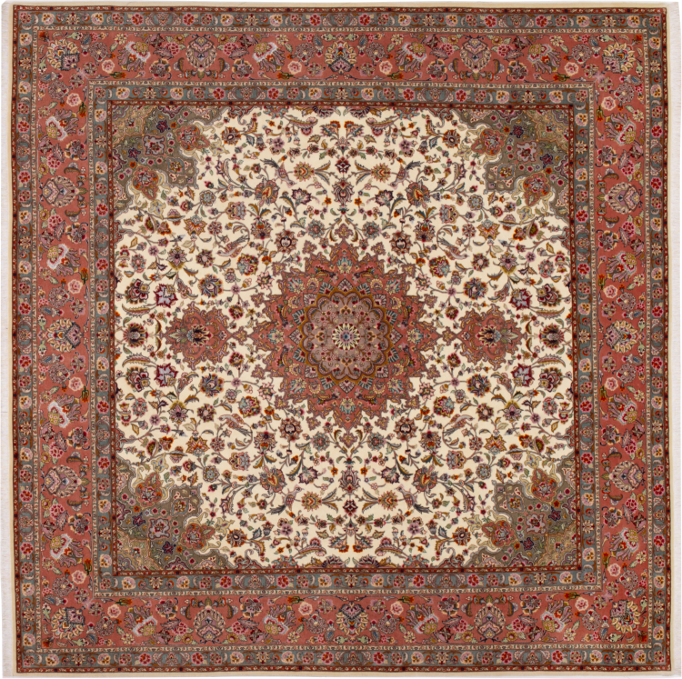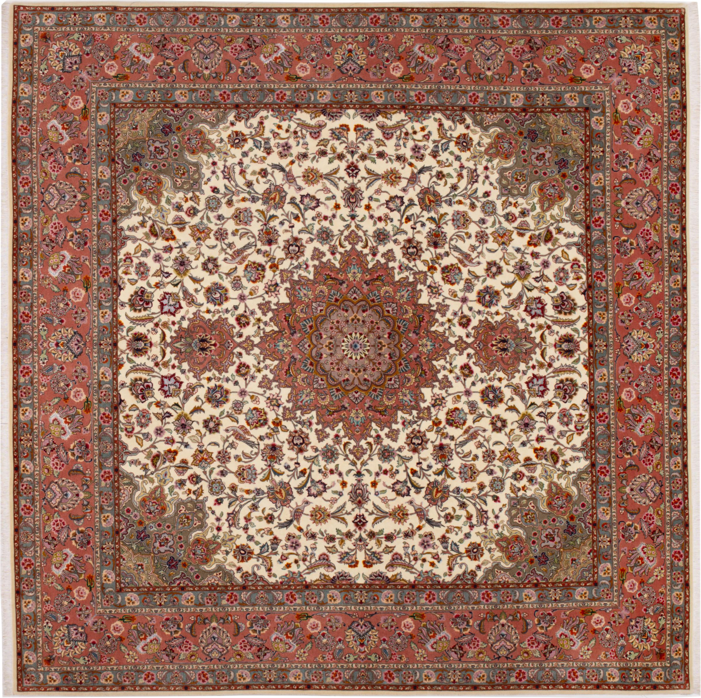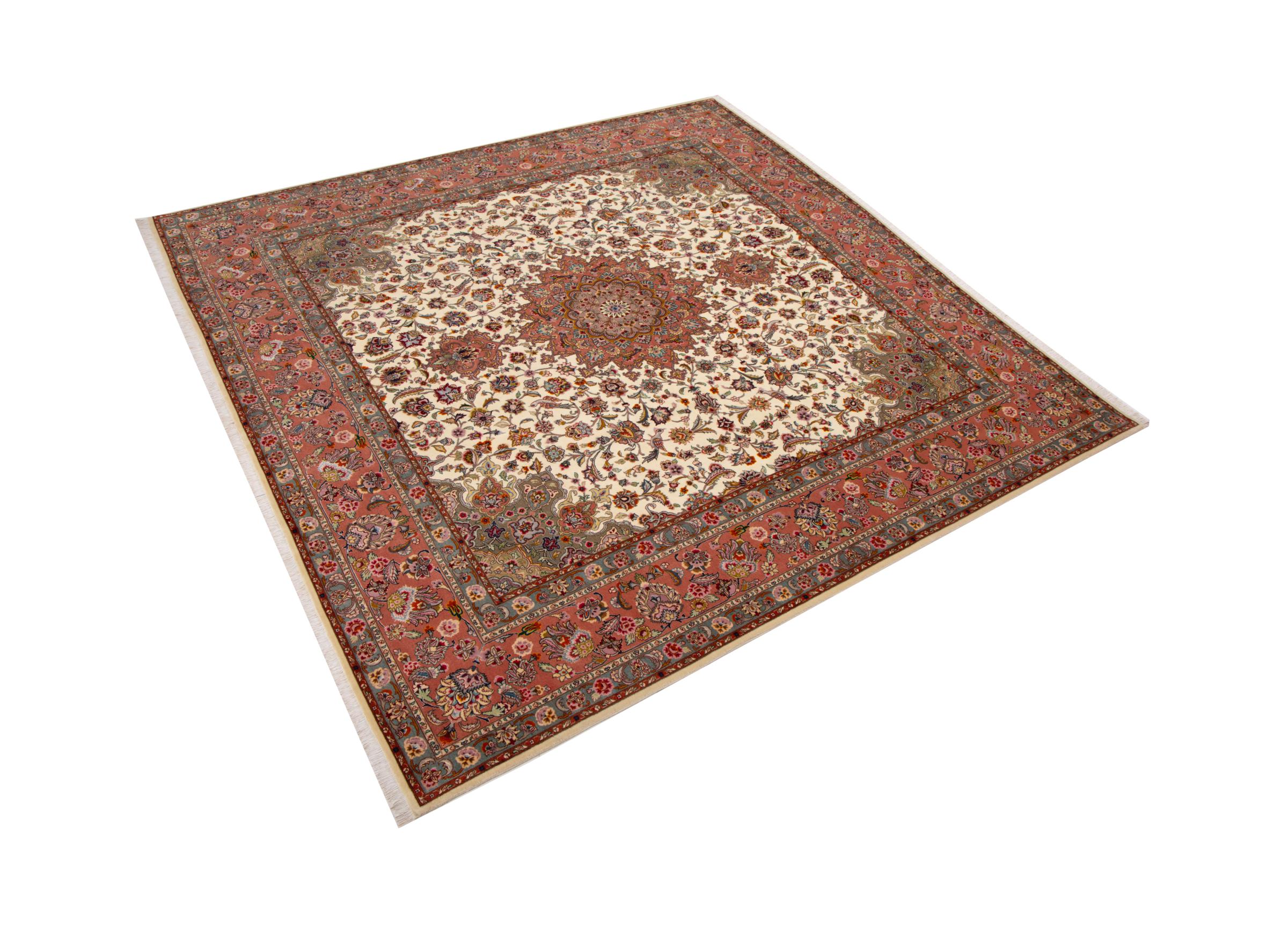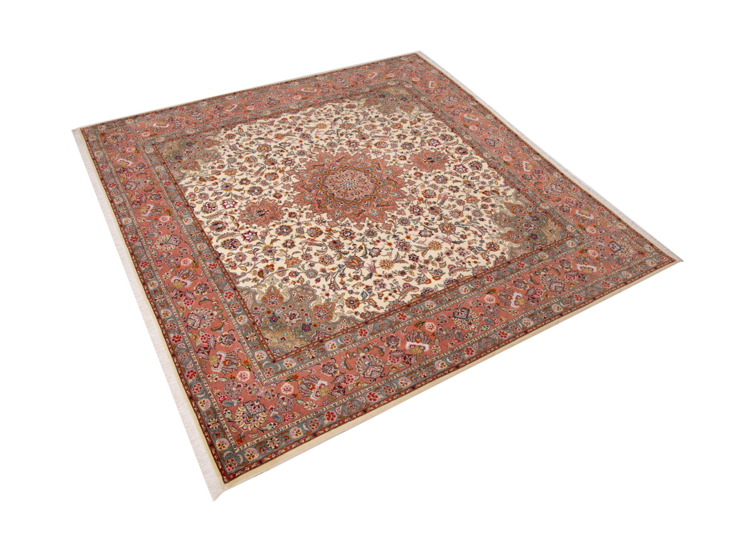 Tapijt ID: 292770007700958 Grootte: 246x247 cm Dikte: ap. 7 mm Knoopdichtheid: 440 000 - 490 000 / m² Verwerking: Handgeknoopte Pool: Wol met zijde Schering: Katoen Oorsprong: Perzië / Iran Leeftijd: Nieuw Gewicht: ap. 18 kg Ook wel bekend als Tabriz, Tabris, Täbris, Tebriz, Tebris, 40Raj, 50Raj Op voorraad: Uniek - Nog maar 1 op voorraad