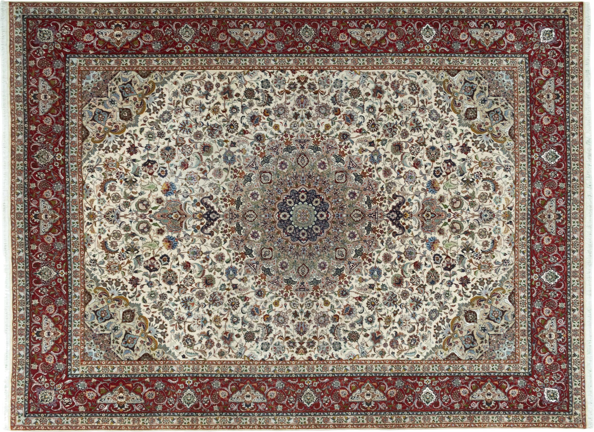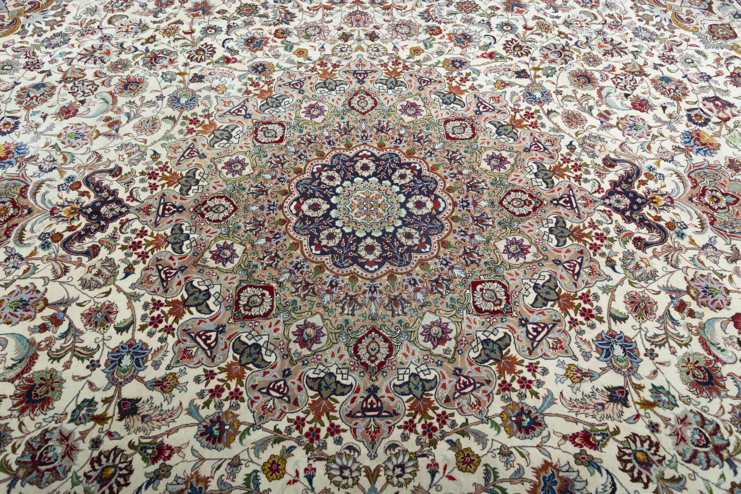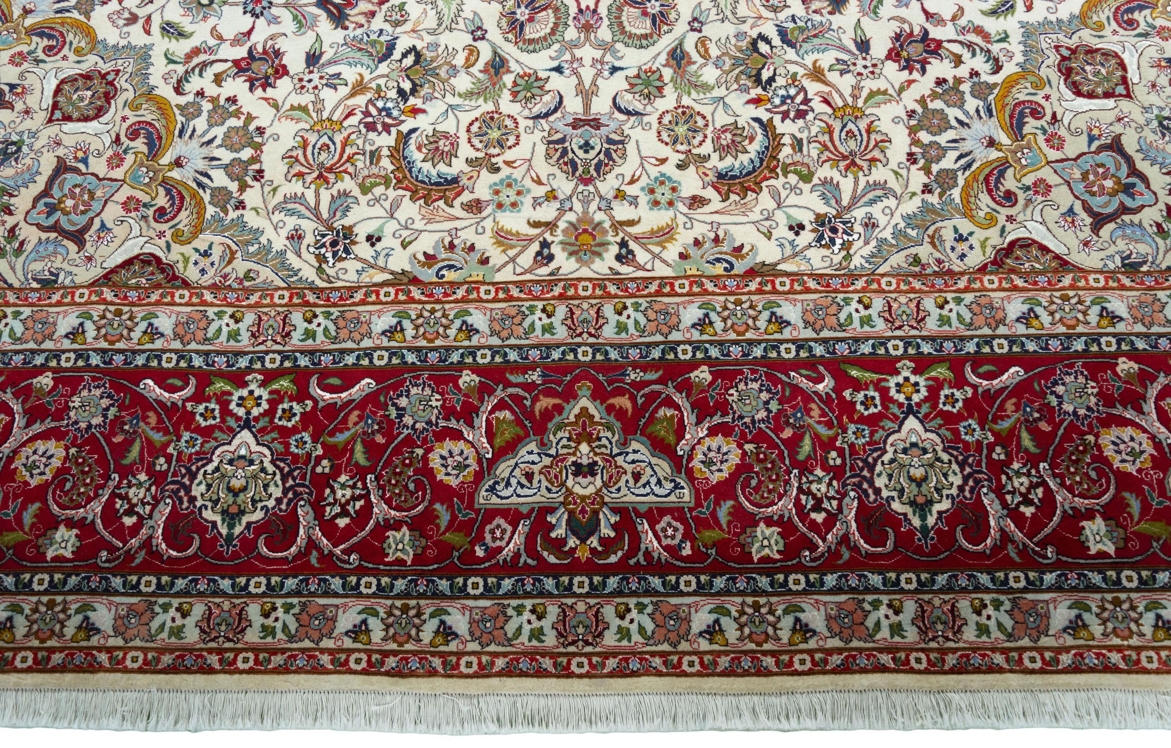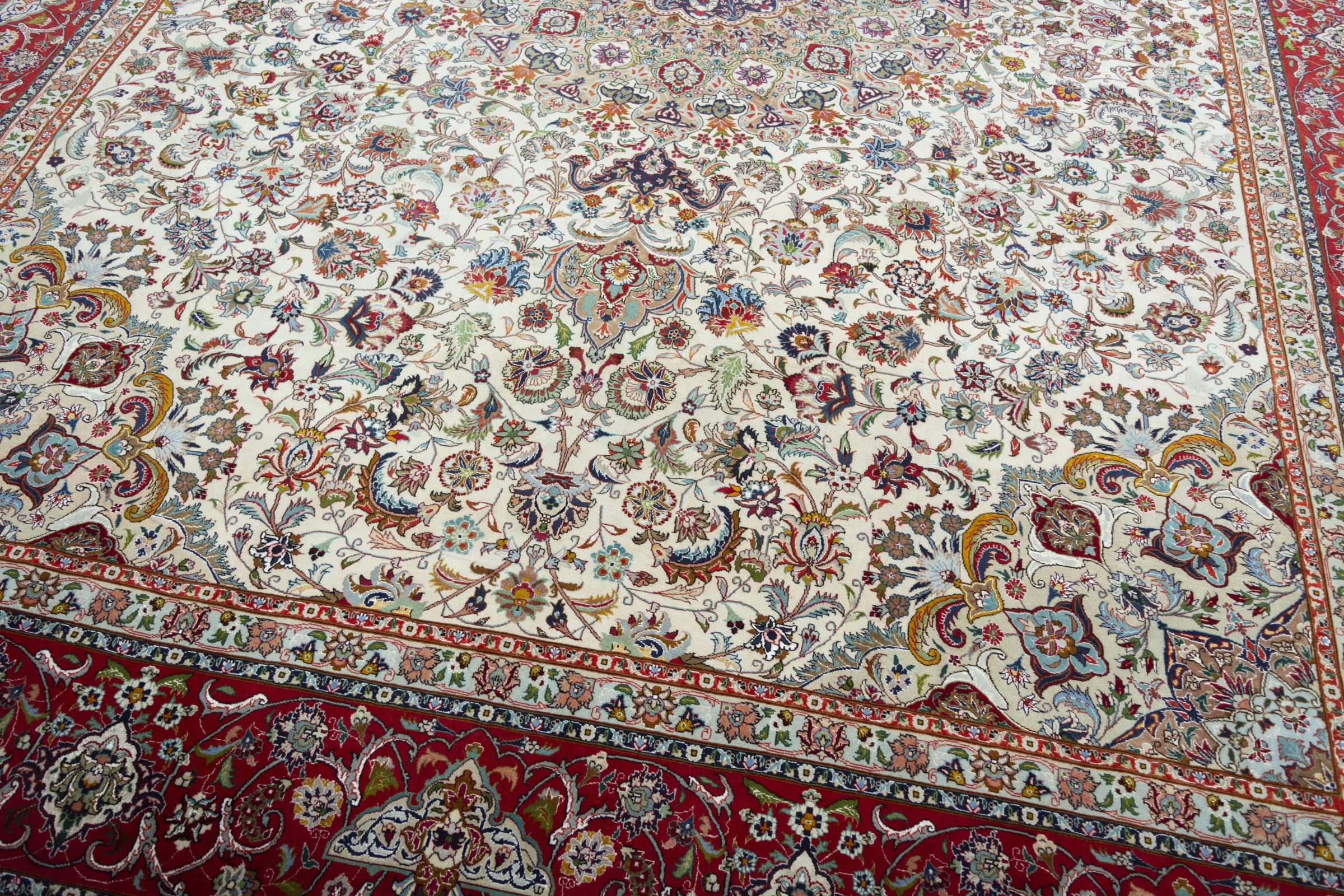 Tapijt ID: 285301005901050 Grootte: 406x304 cm Dikte: ap. 7 mm Knoopdichtheid: 450 000 - 500 000 / m² Verwerking: Handgeknoopte Pool: Kurkwol met zijde Schering: Katoen Oorsprong: Perzië / Iran Leeftijd: Nieuw Gewicht: ap. 37 kg Ook wel bekend als Tabriz, Tabris, Täbris, Tebriz, Tebris, 40Raj, 50Raj Op voorraad: Uniek - Nog maar 1 op voorraad
